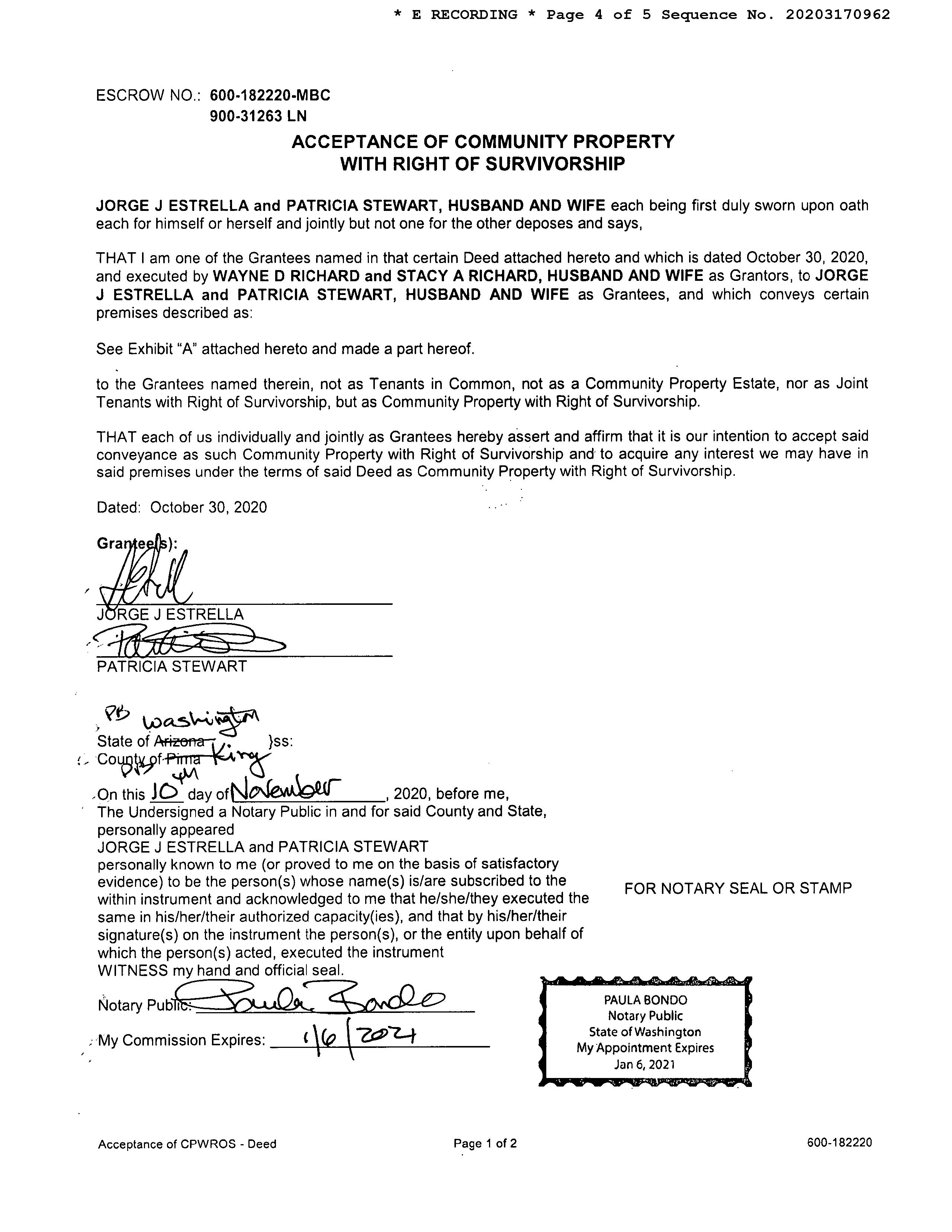 OWNER: ESTRELLA JORGE J & STEWART AFFIDAVIT 2020 3170962 11/12/2020