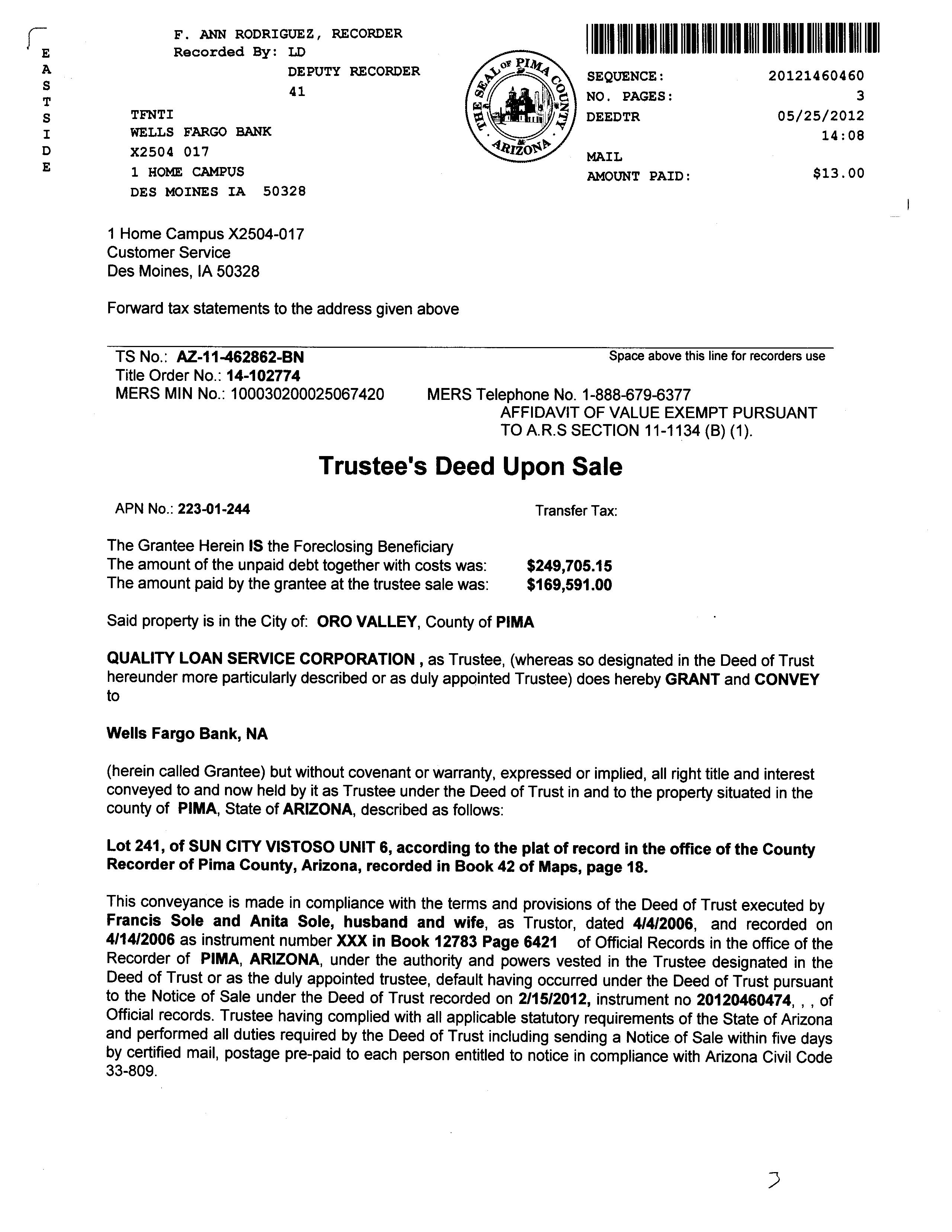 OWNER: SOLE FRANCIS/ANITA AFFIDAVIT 12783 6417 04/14/2006