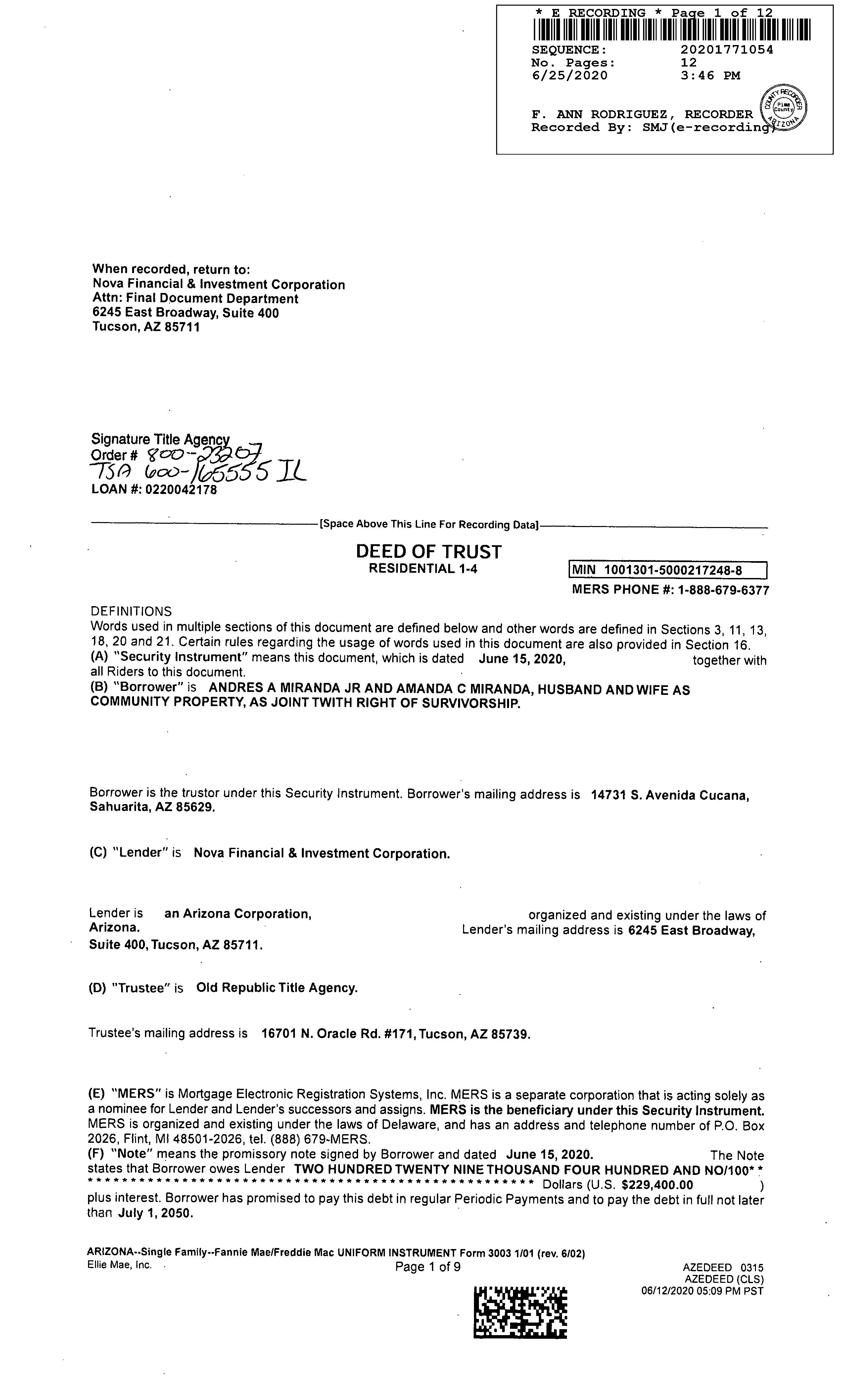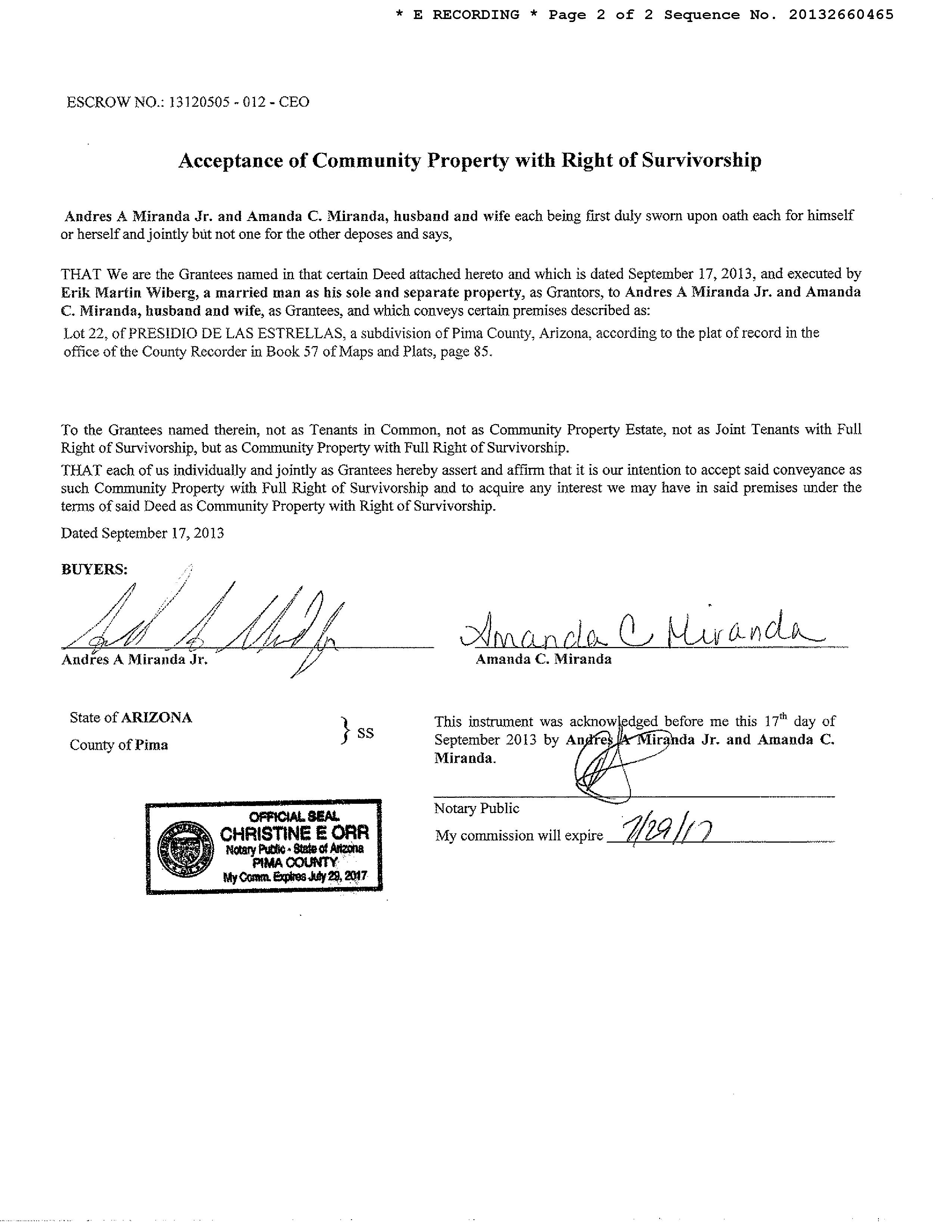 OWNER: MIRANDA ANDRES A AFFIDAVIT 2013 2660465 09/23/2013