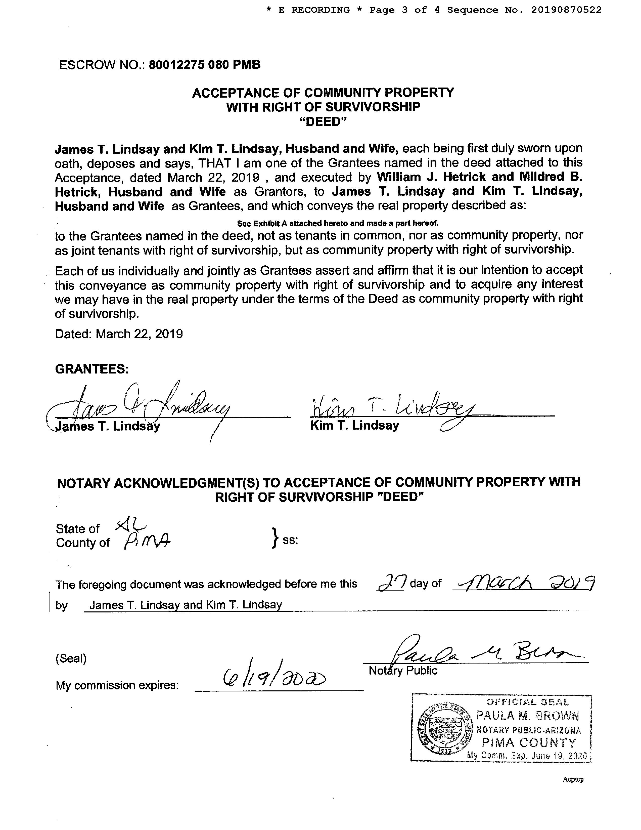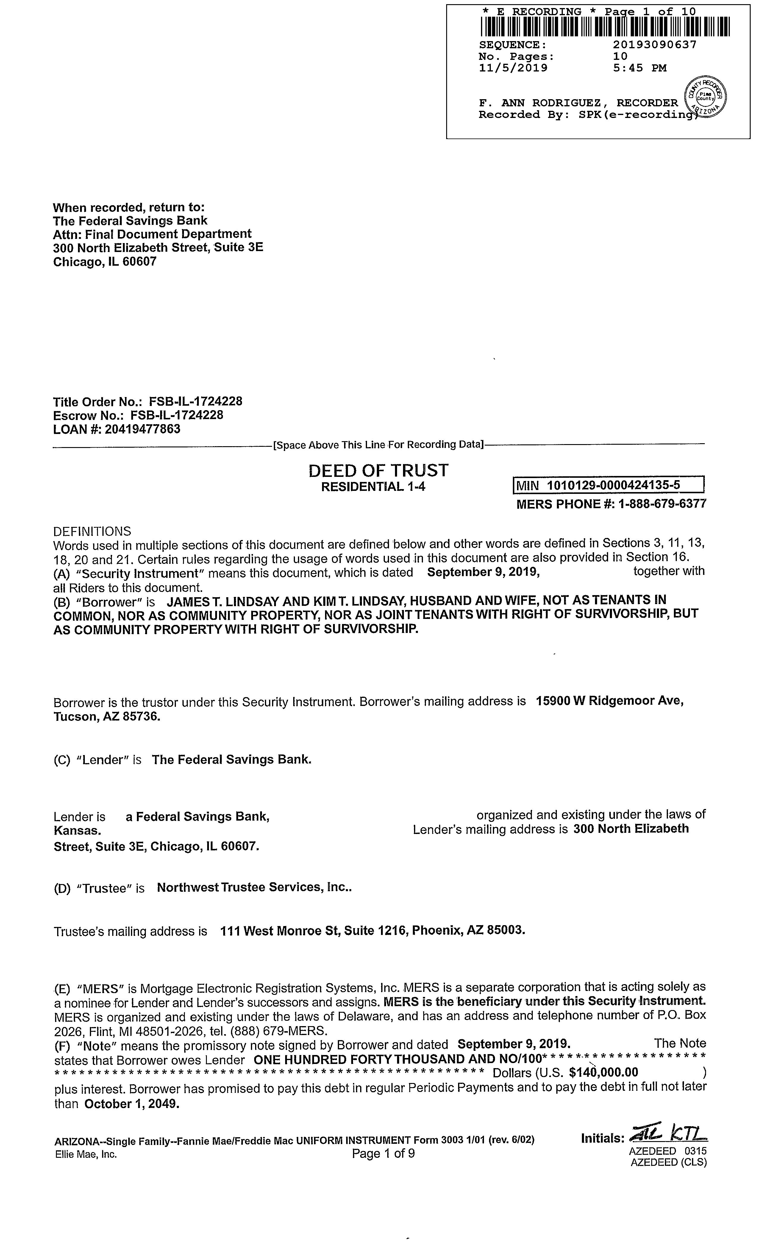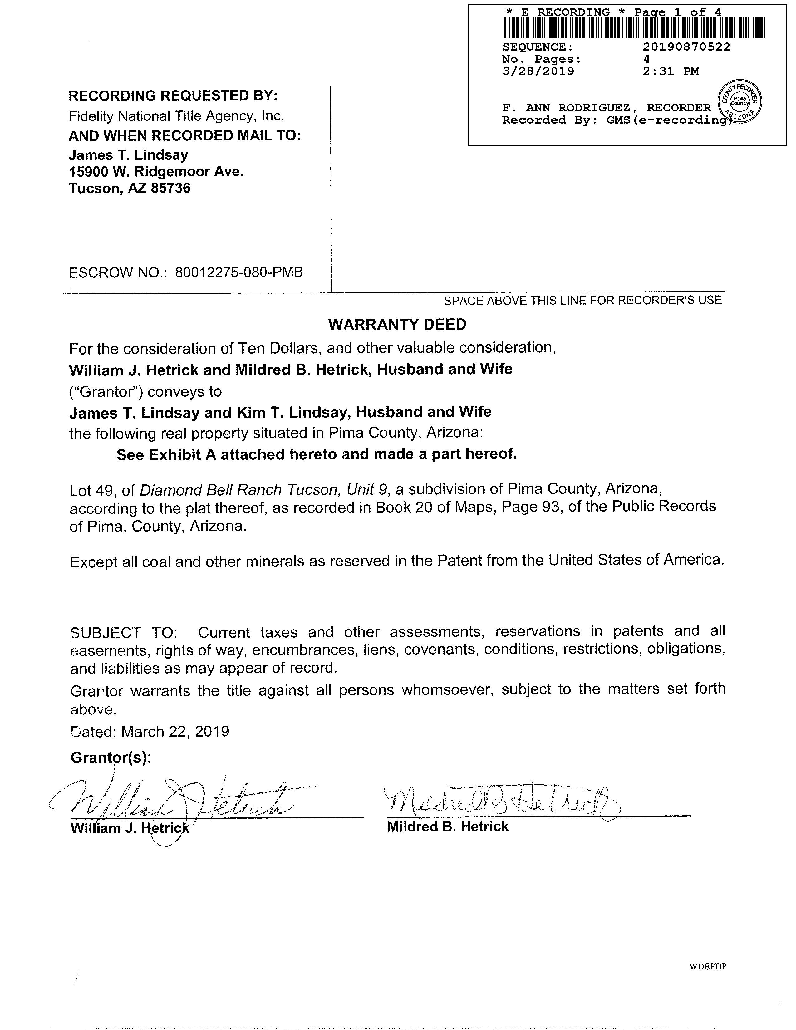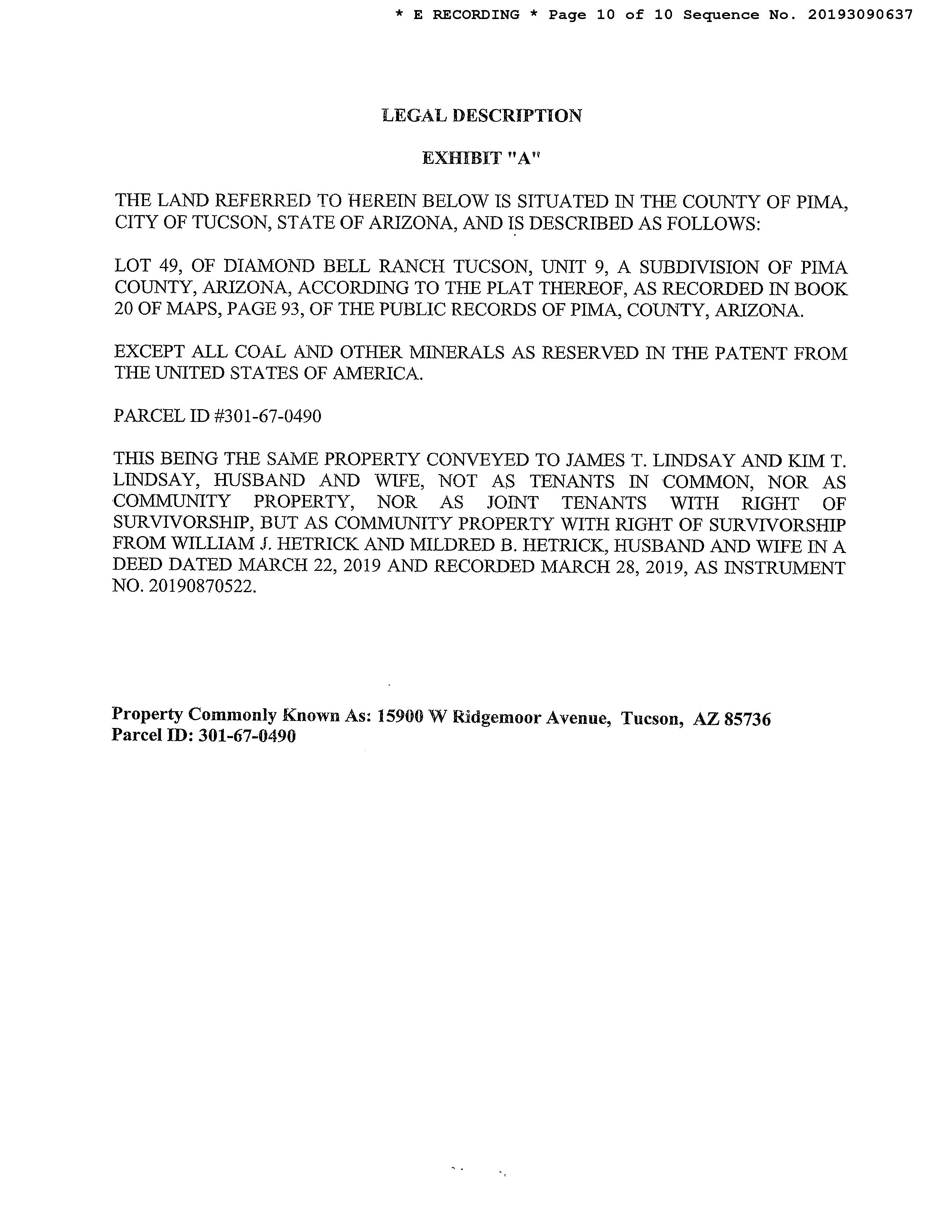 Owner Name: Lindsay James T /Lindsay Kim T APN / Alternate APN: 301-67-0490 / Deed Type: Warranty Deed
