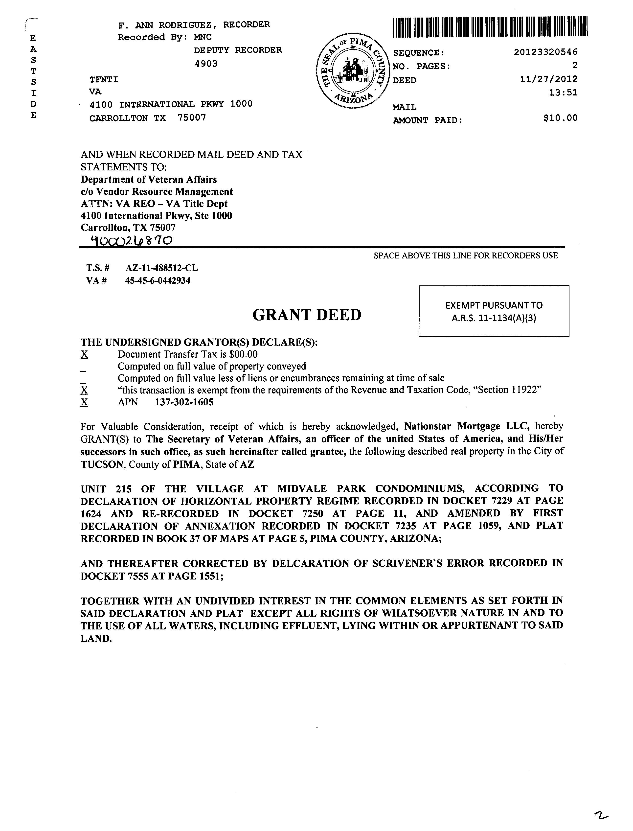 Legal Description : Village At Midvale Park Amended Plat Of (the) (condominiums) Unit 215 County : Pima, Az