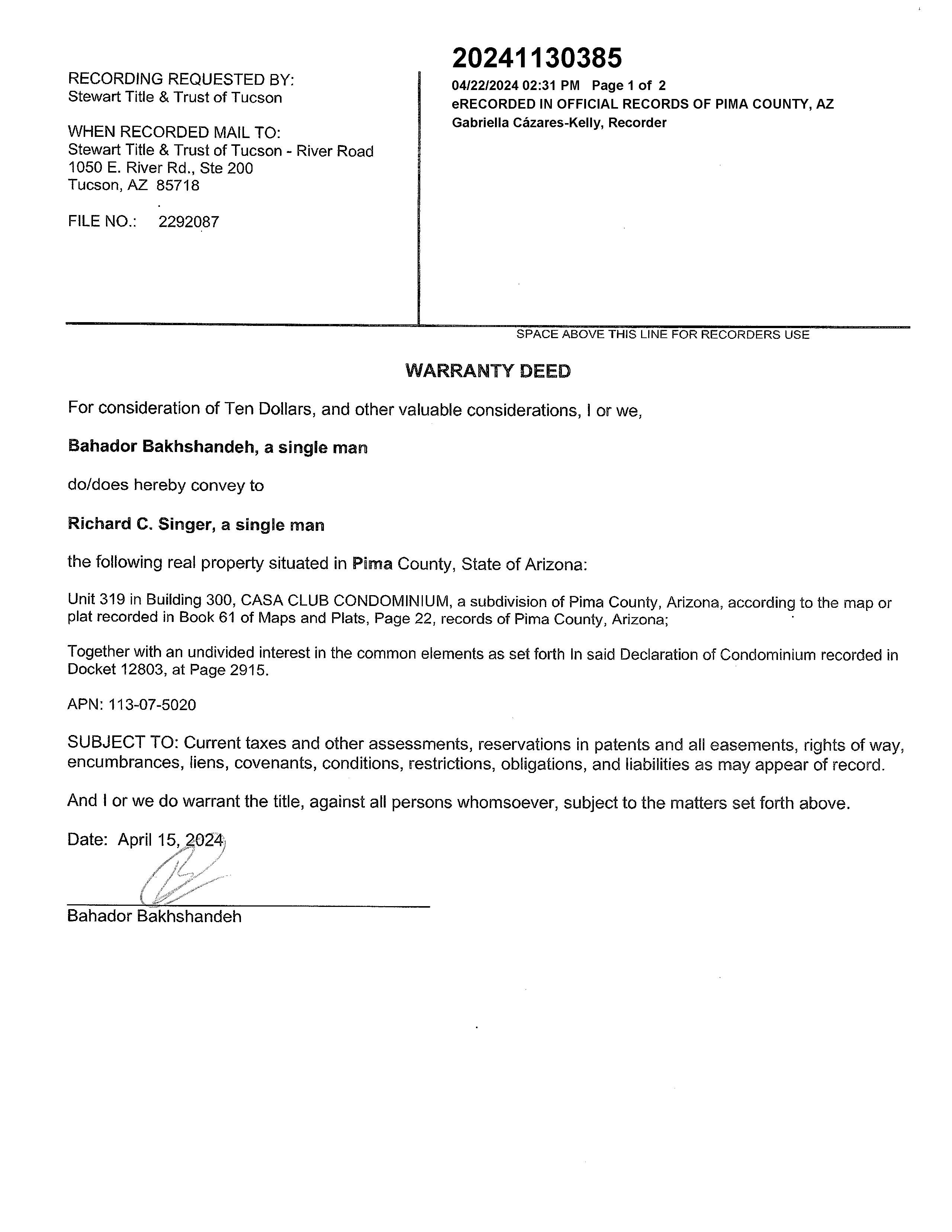 Owner Name: Singer Richard C / APN / Alternate APN: 113-07-5020 / Deed Type: Warranty Deed