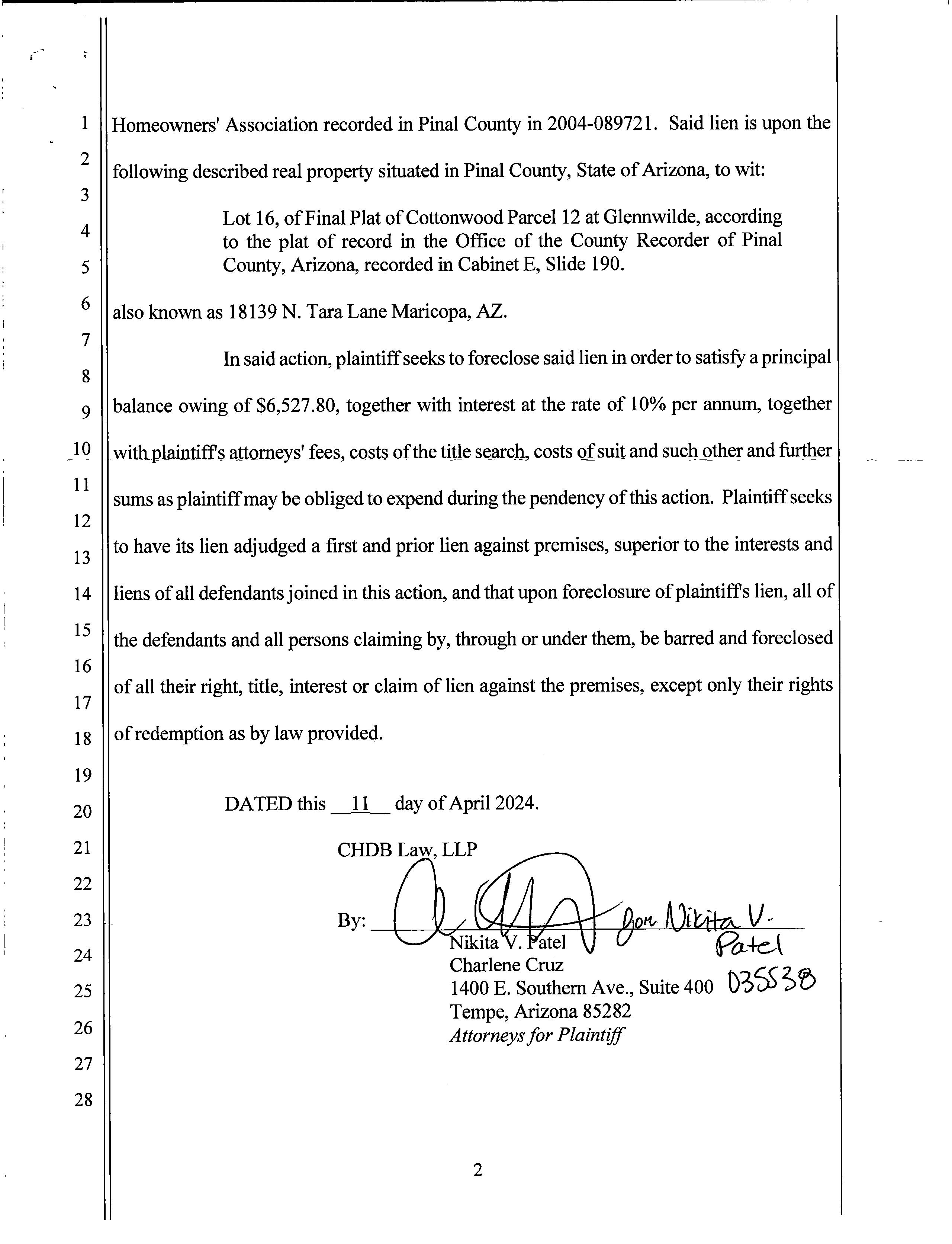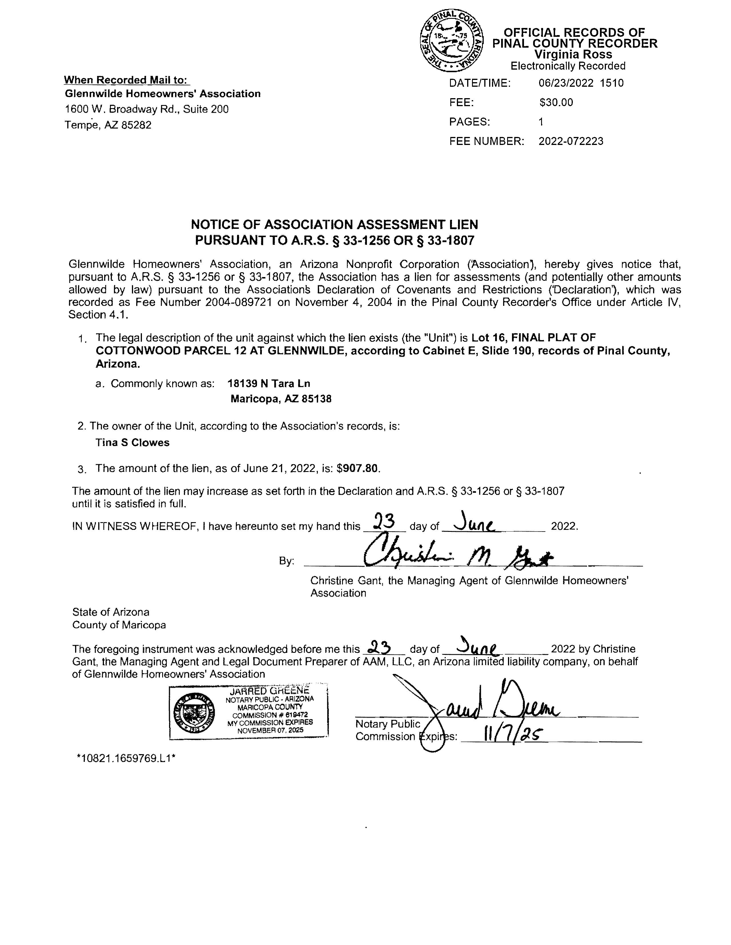 Mailing Address : 18139 N Tara Ln, Maricopa AZ 85138-4451 H050