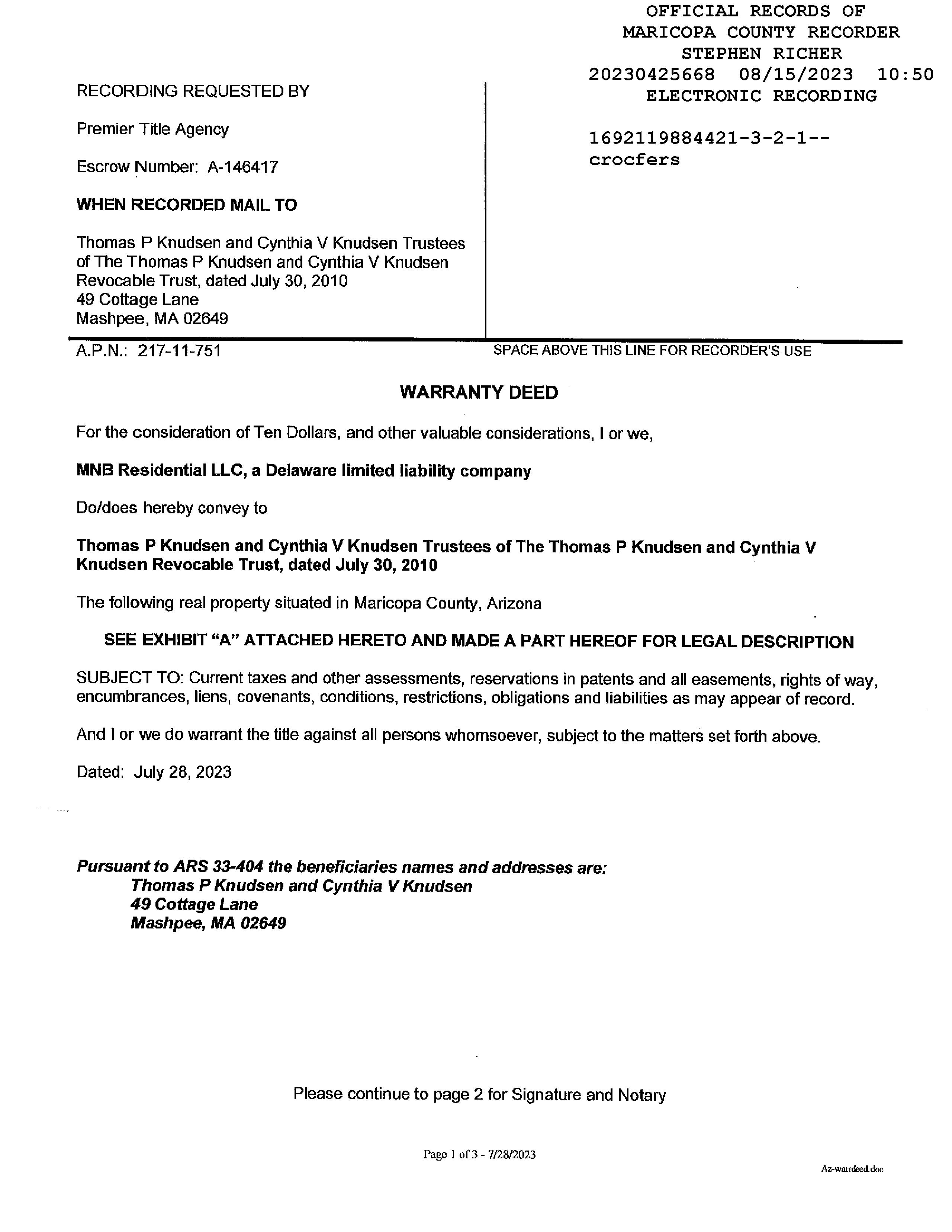 OWNER: THOMAS P KNUDSEN AND CYNTHI 2023 425668 08/15/2023