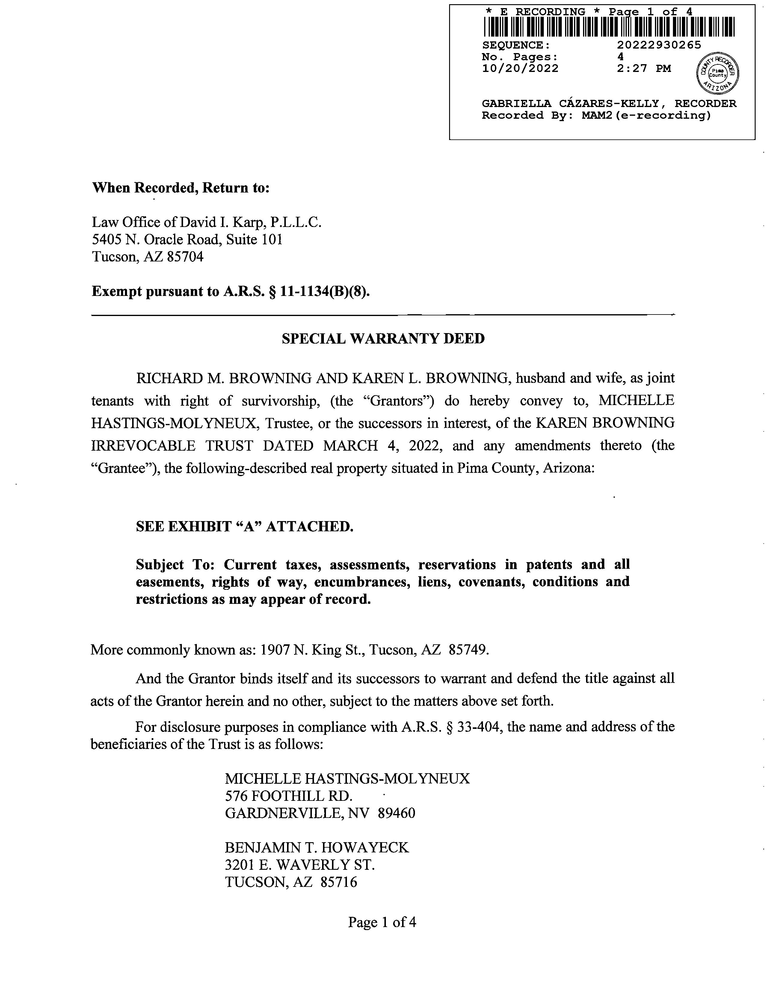 OWNER: KAREN BROWNING IRREVOCABLE  AFFIDAVIT    2022 2930265 10/20/2022