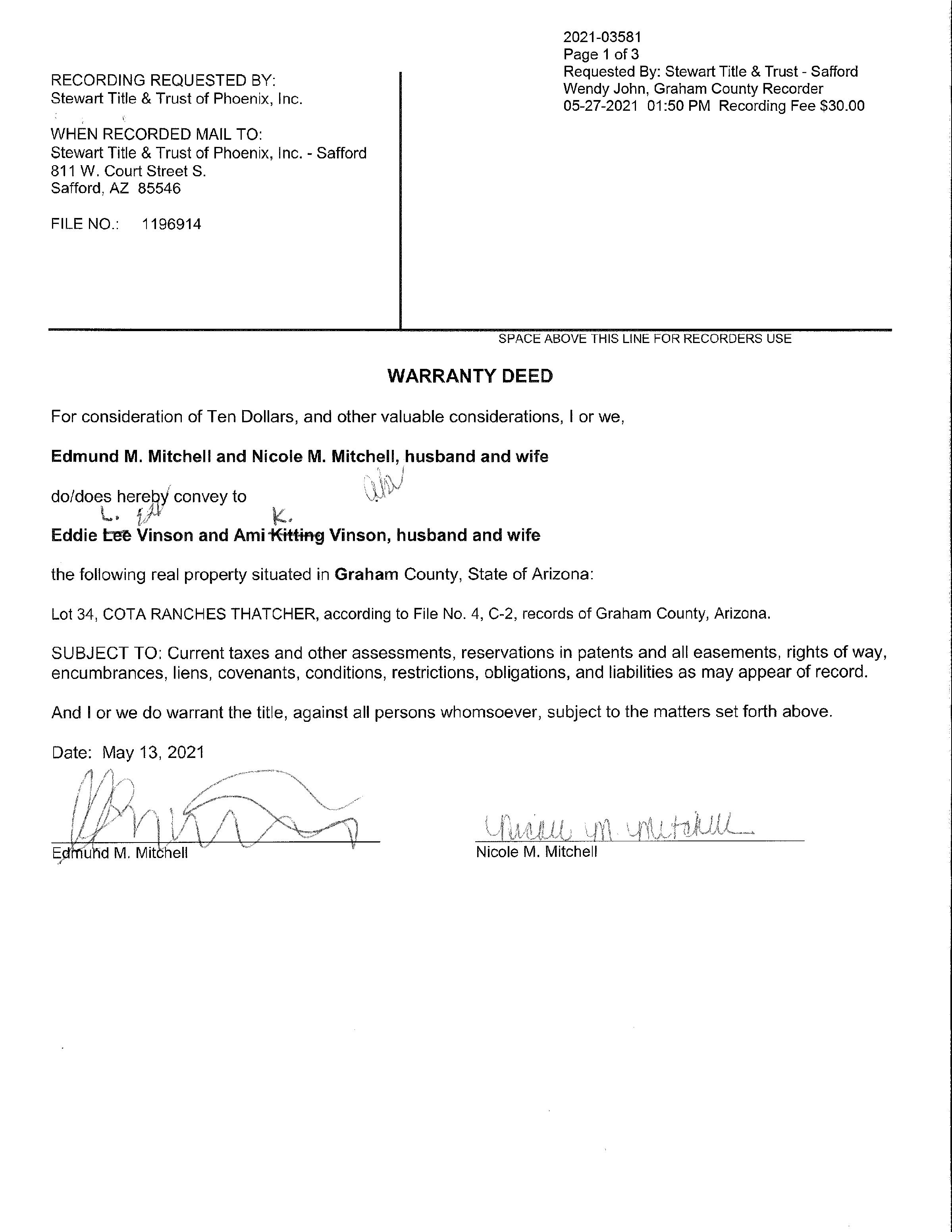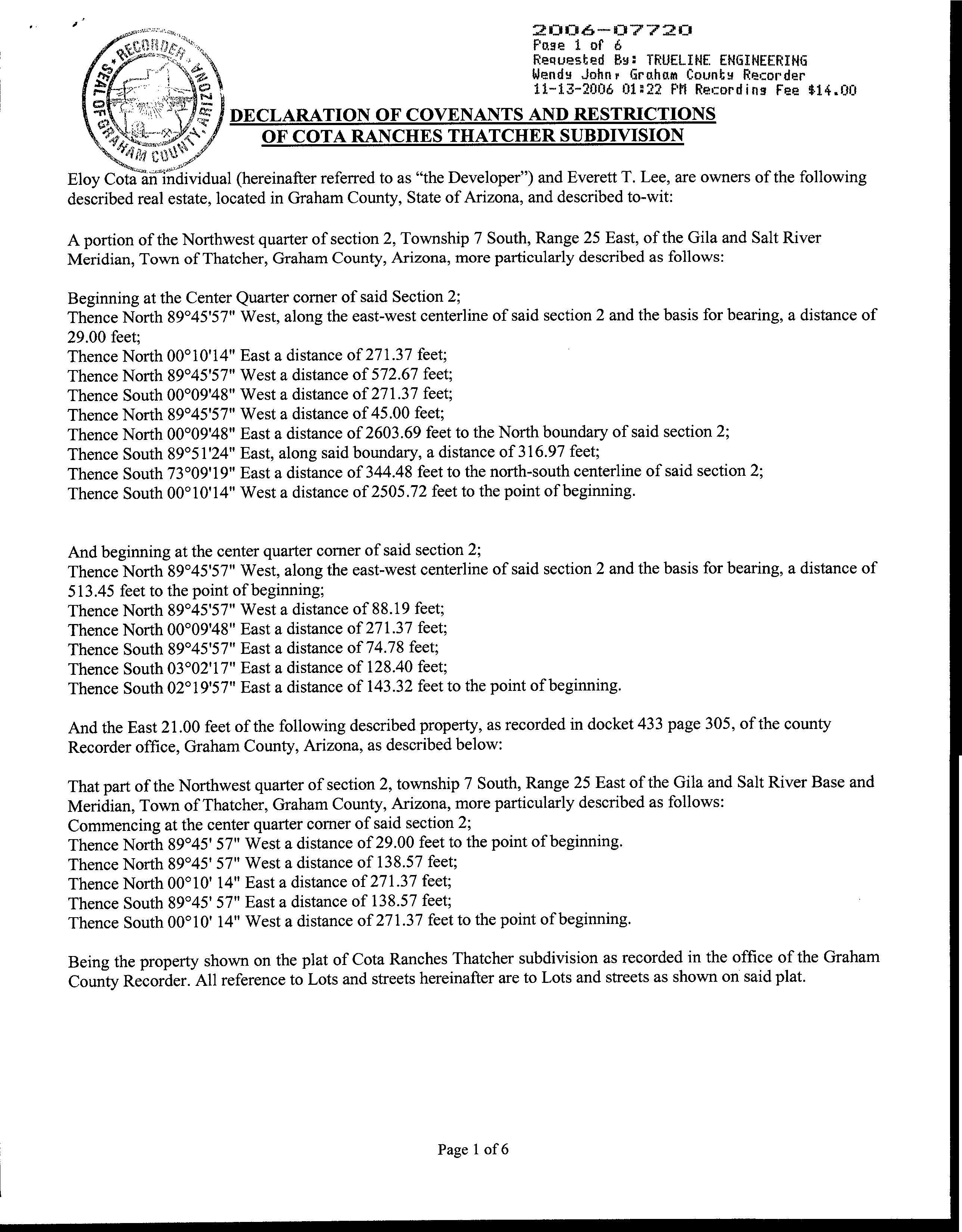 Legal Description : Lot 34 Cota Ranches Thatcher Sub 104-04-012-093a-093b & 095a Now 101-229 Lots 1-129 2008 Split