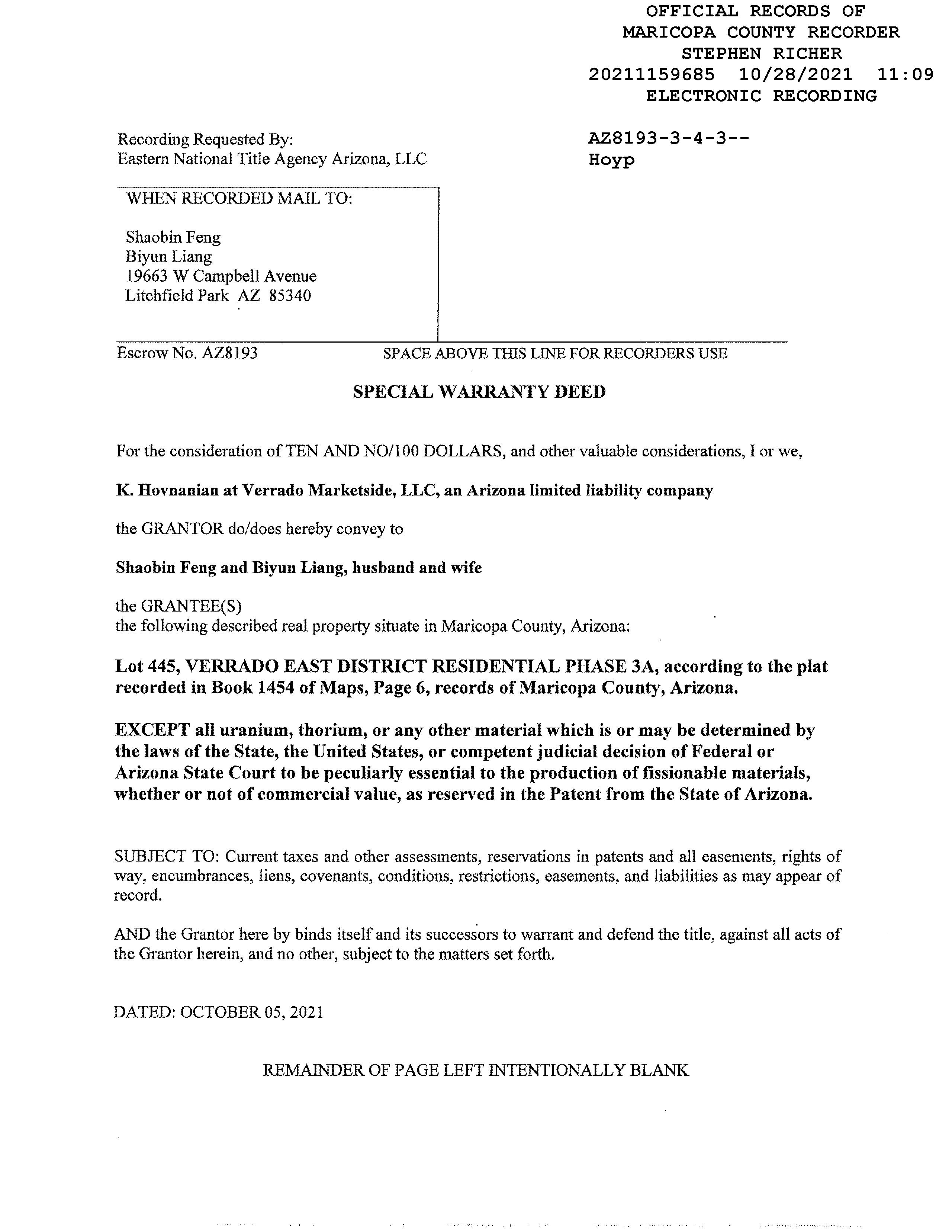 Legal Description : Lot 445 Verrado East District Residential Phase 3a Mcr 1454-06