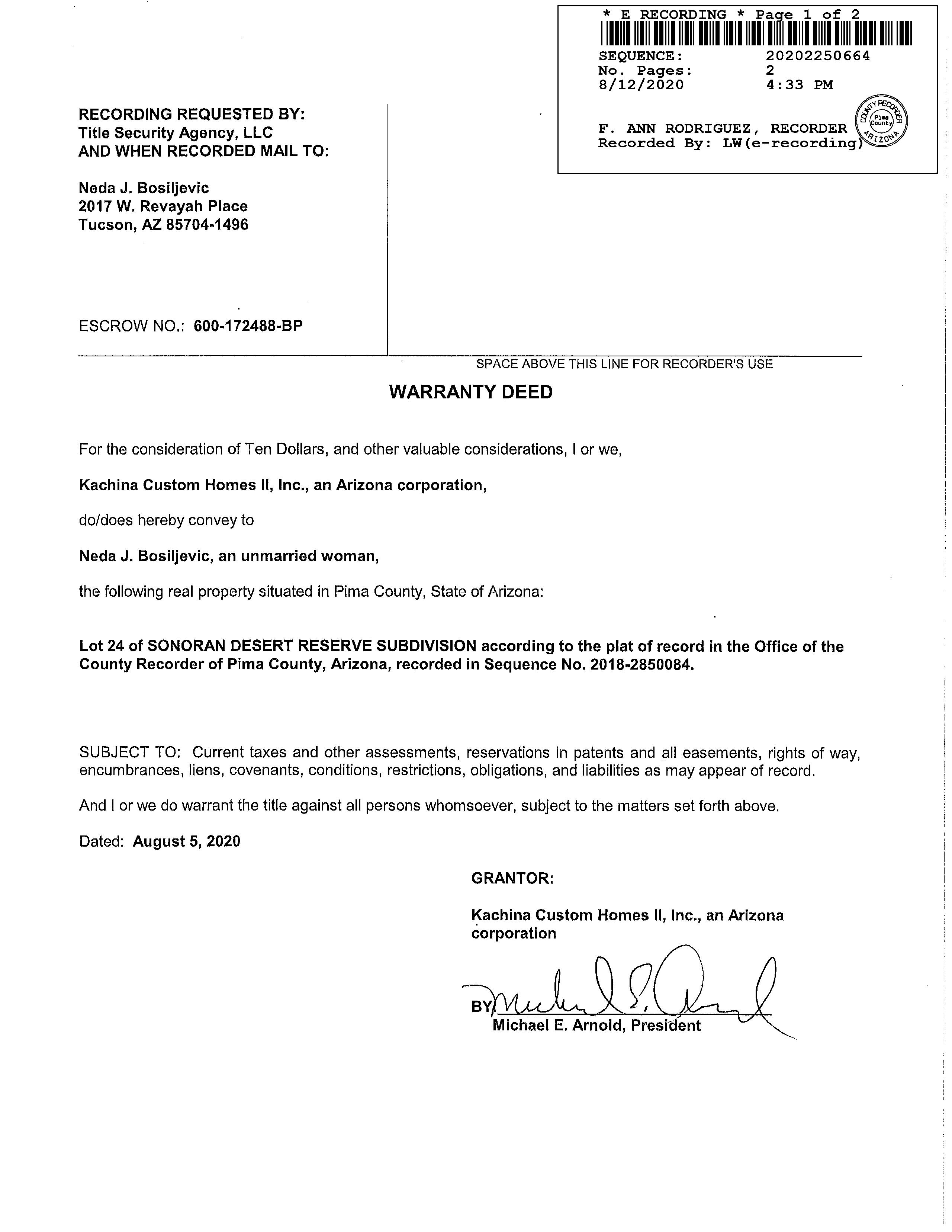 2020 2250664 WD KACHINA CUSTOM HOMES II IN 08/12/2020 108,000 2020 2250663 SW TITLE SECURITY AGENCY LLC