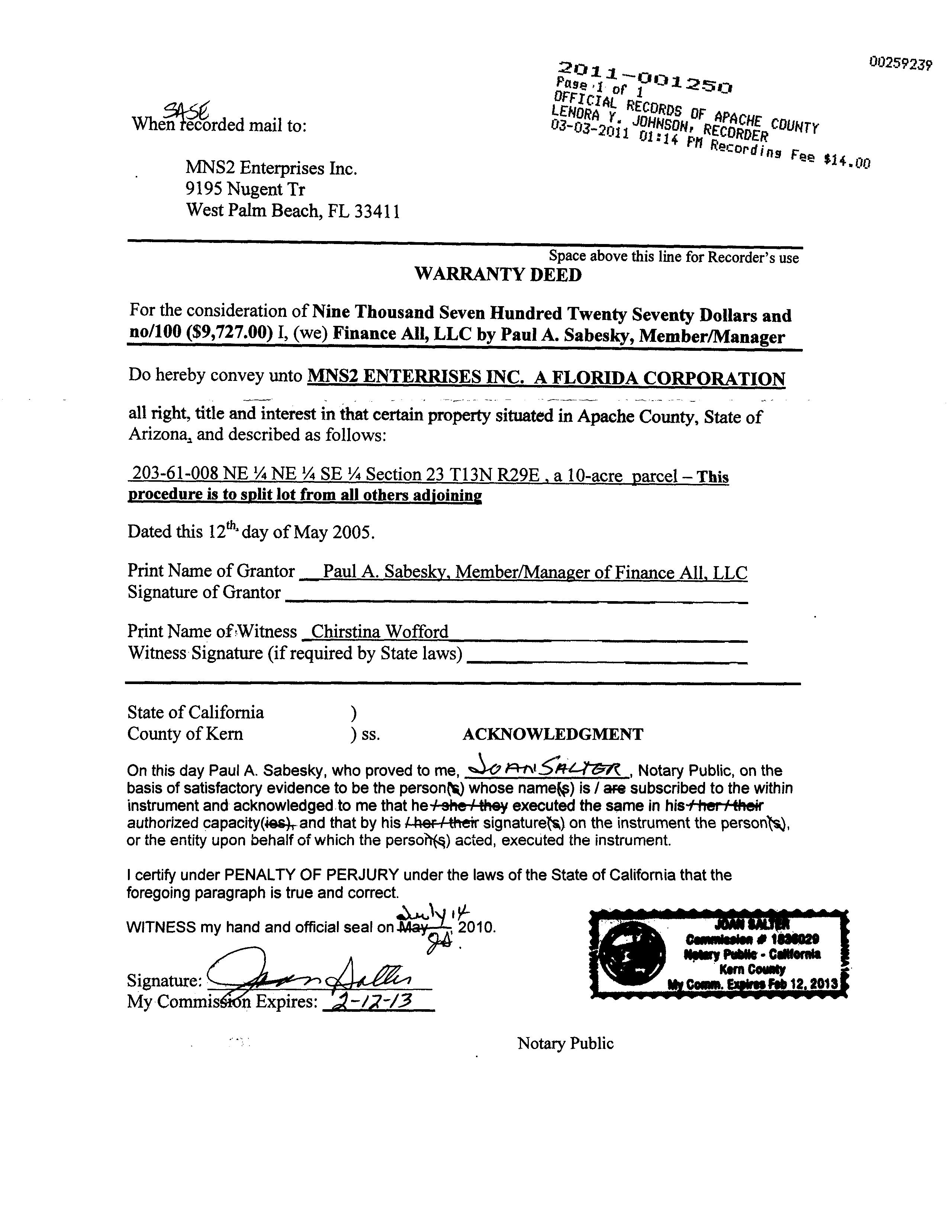 Subject Property: Az Owner Name: Mns2 Enterprises Inc / APN / Alternate APN: 203-61-008B / R0106898 Deed Type: Land Use: Vacant Land (nec) Subdivision / Tract: / Lot Size: 435,600 Year Built / Eff: / Rec. Date / Price: / $ Living Area: # of units: Document #: Bedrooms: Pool: Total Tax Value: $2,400 Bath(F/H): / #1 Az Owner Name: Donaghue Marie-annette J / APN / Alternate APN: 203-61-008D / R0107608 Deed Type: Warranty Deed Land Use: Vacant Land (nec) Subdivision / Tract: / Lot Size: 879,476 Year Built / Eff: / Rec. Date / Price: 01/11/2023 / $9,745 Living Area: # of units: Document #: 194 Bedrooms: Pool: Total Tax Value: $3,836 Bath(F/H): / #2 Az Owner Name: Investment Land Alliance Llc / APN / Alternate APN: 203-61-005 / R0033955 Deed Type: Warranty Deed Land Use: Vacant Land (nec) Subdivision / Tract: / Lot Size: 1,742,400 Year Built / Eff: / Rec. Date / Price: 04/24/2023 / $6,500 Living Area: # of units: Document #: 2648 Bedrooms: Pool: Total Tax Value: $7,600 Bath(F/H): / Customer Name : Lisa Mrazek Customer Company Name : First American Title Insurance Company Prepared On : 09/25/2023 © 2023 CoreLogic. All rights reserved