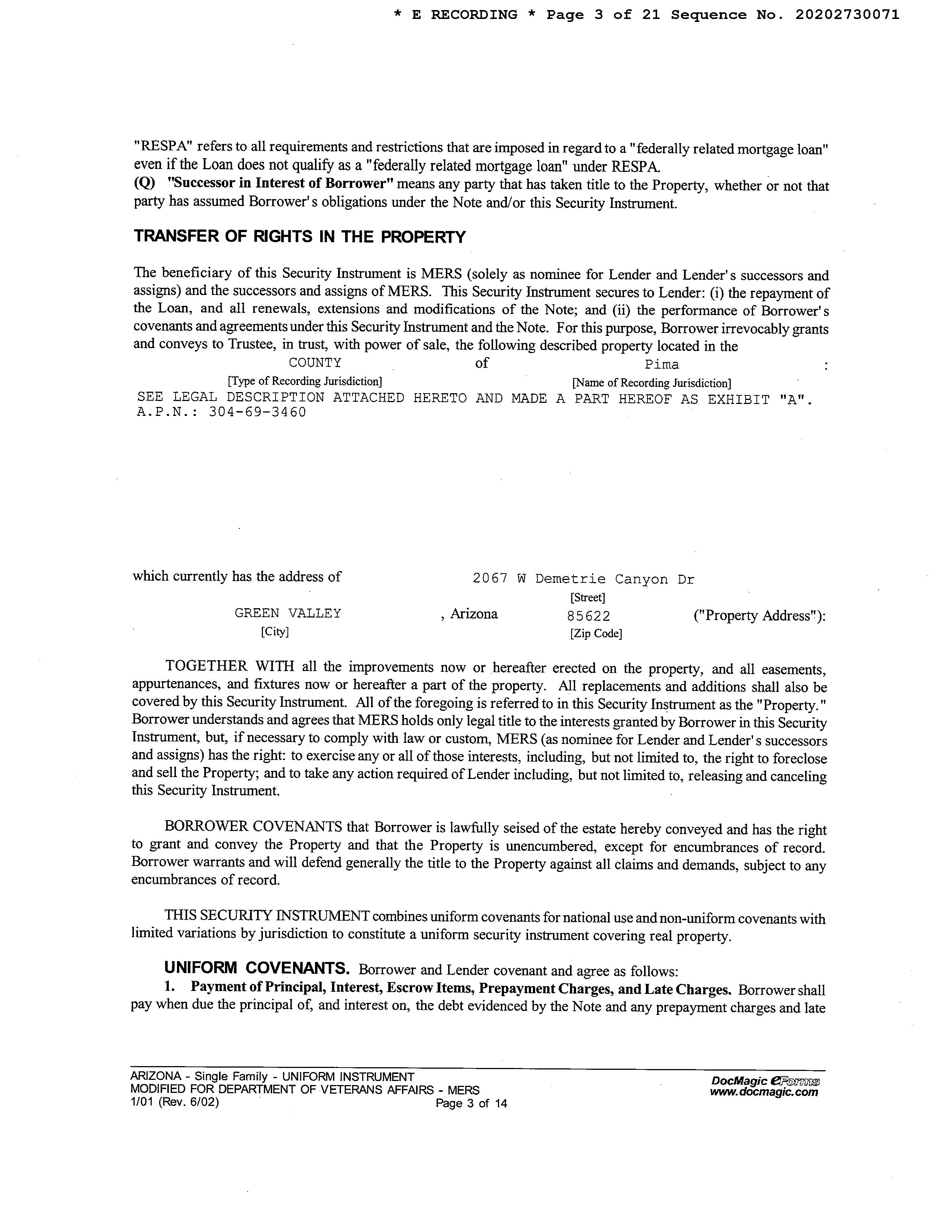 Mailing Address : 2067 W Demetrie Canyon Dr, Green Valley AZ 85622-6315 R001
