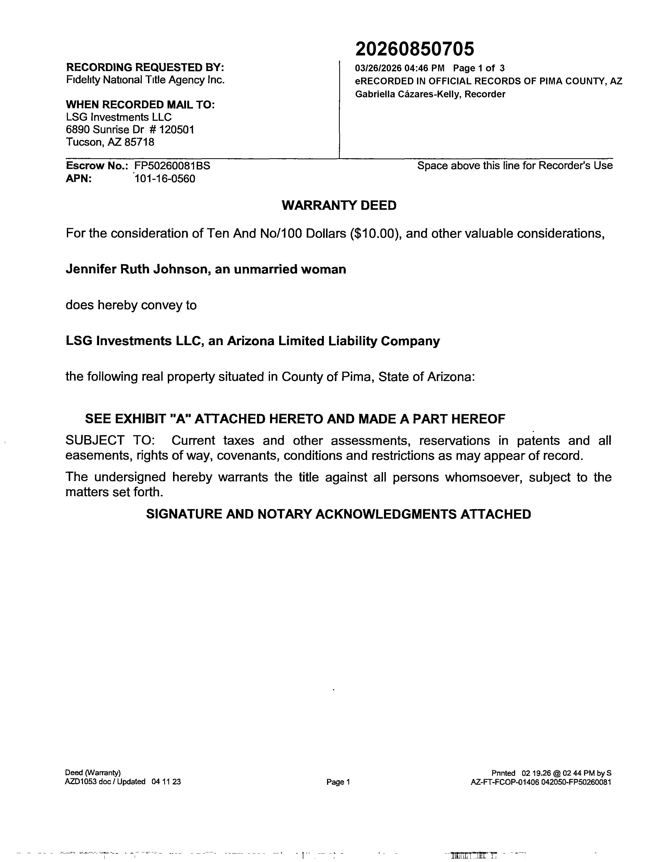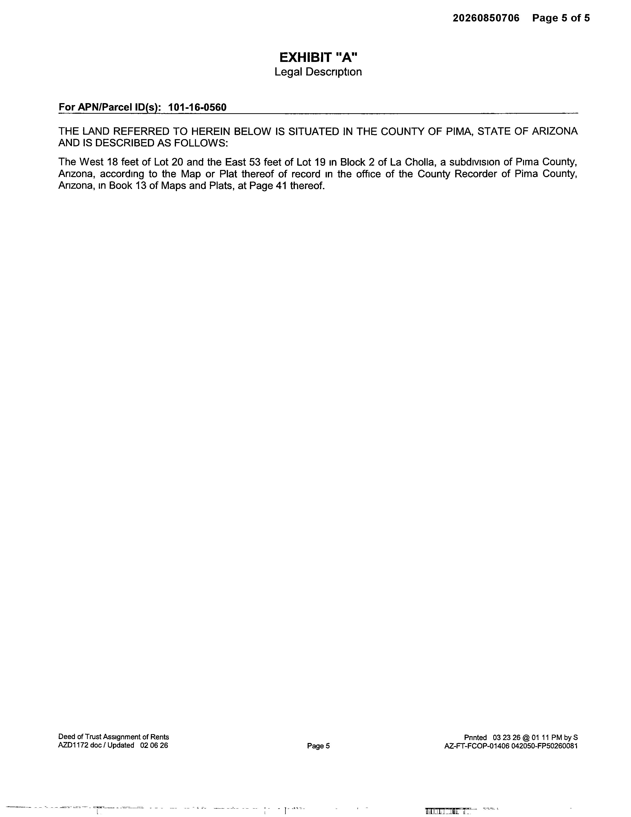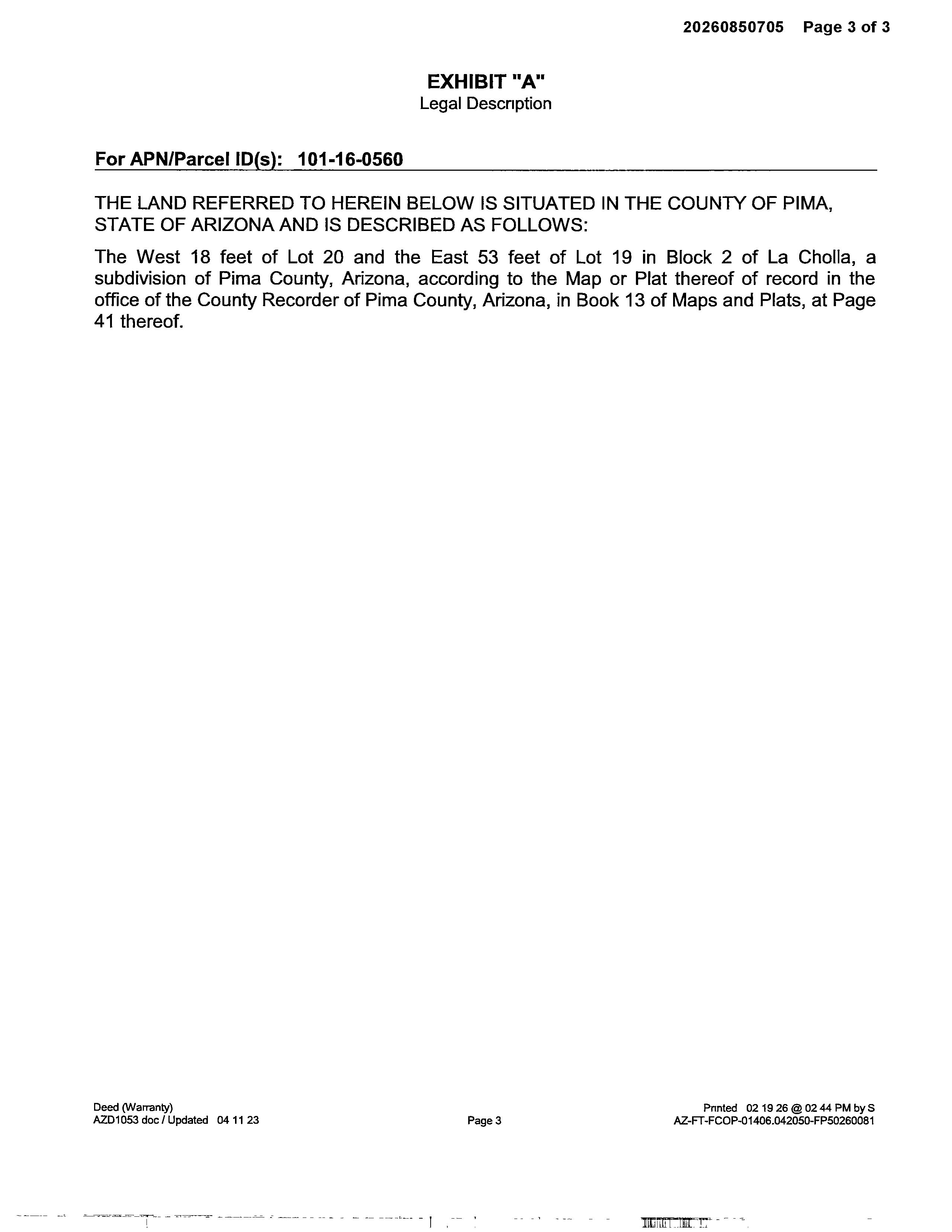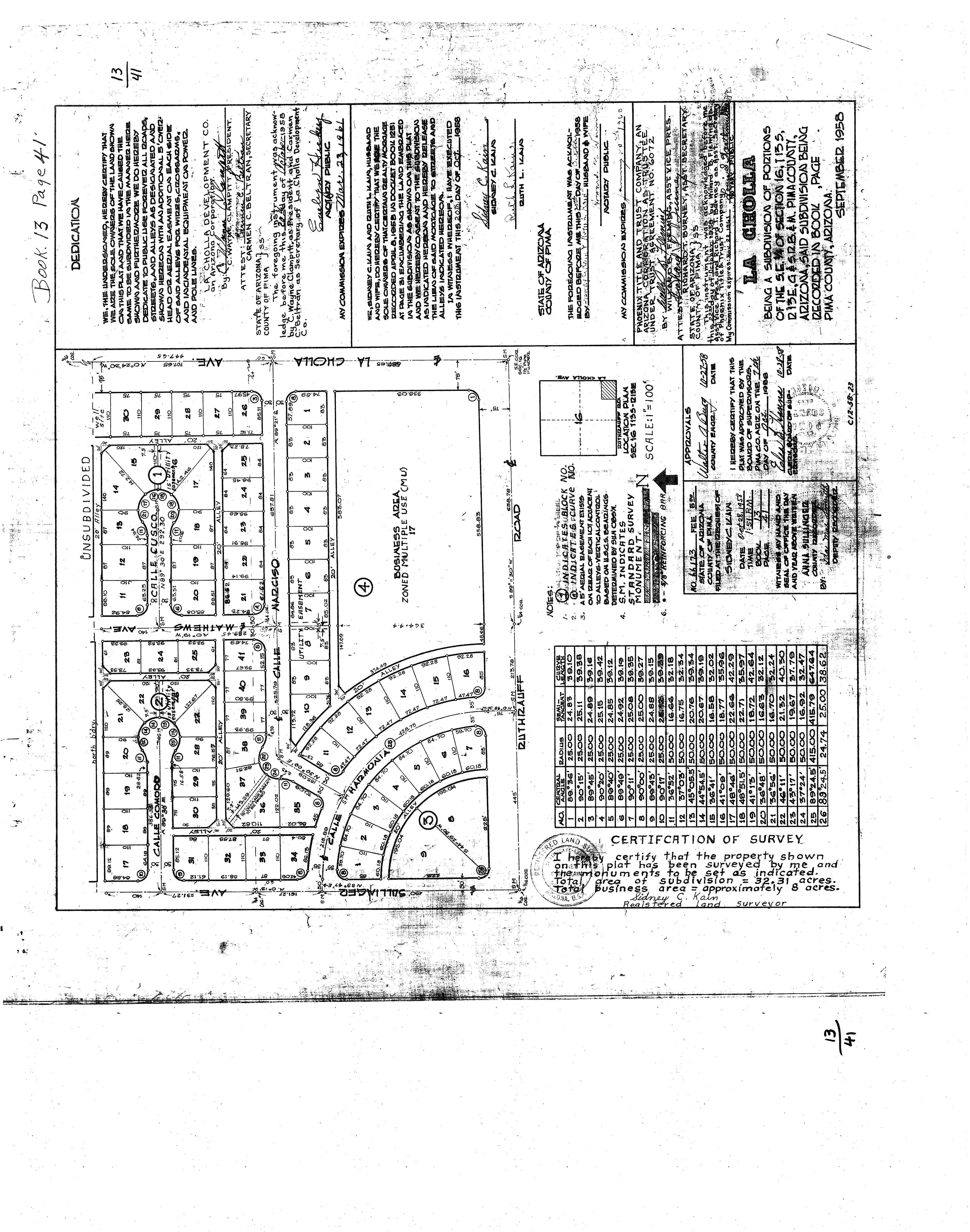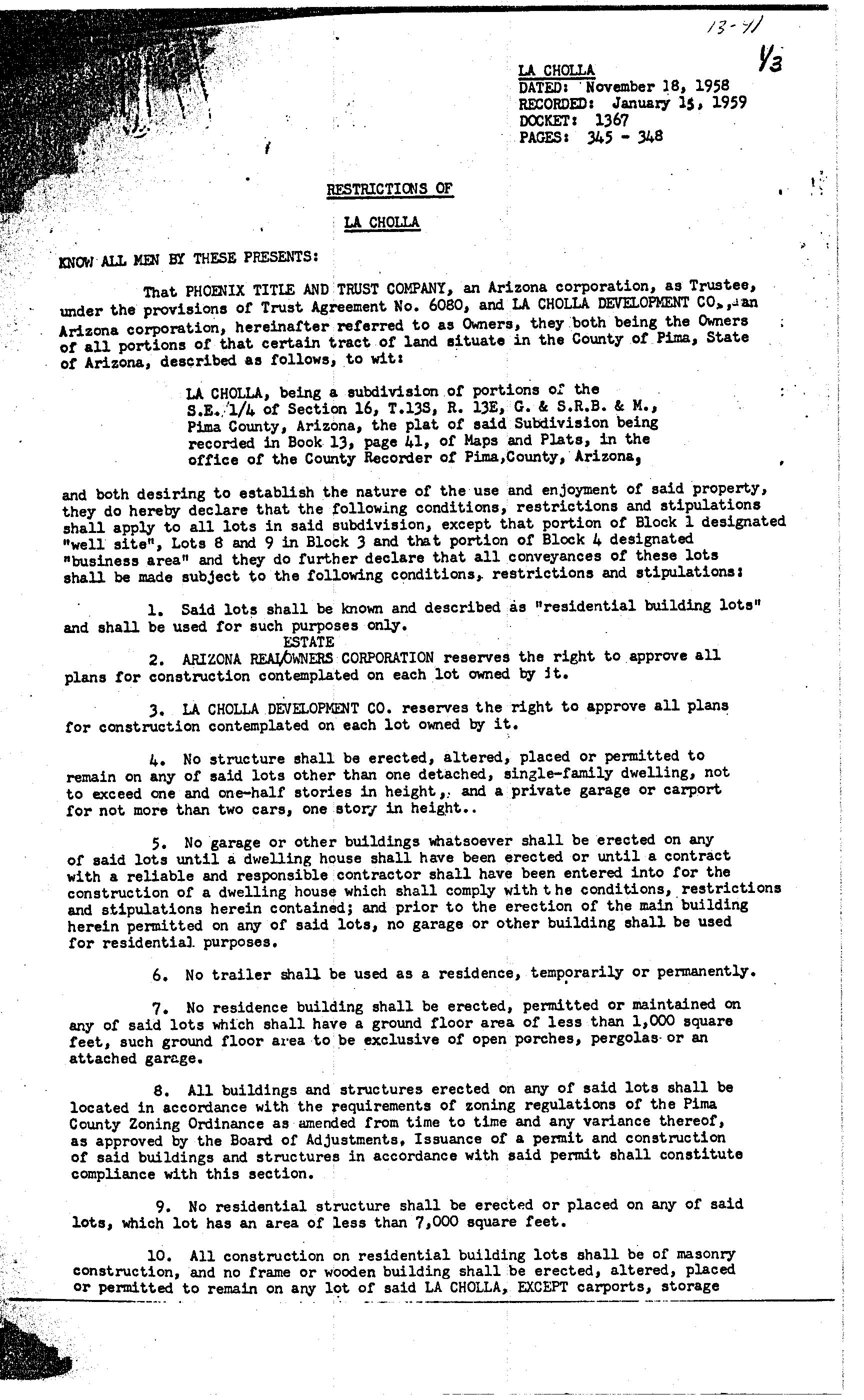 LA CHOLLA, being a subdivision of portions of the S.E. 1/4 of Section 16, T.133, R. 13E, G. & S.R.B. & ., Pima County, Arizona, the plat of said Subdivision being recorded in Book 13, page 41, of Maps and Plats, in the office of the County Recorder of Pima, County, Arizona,