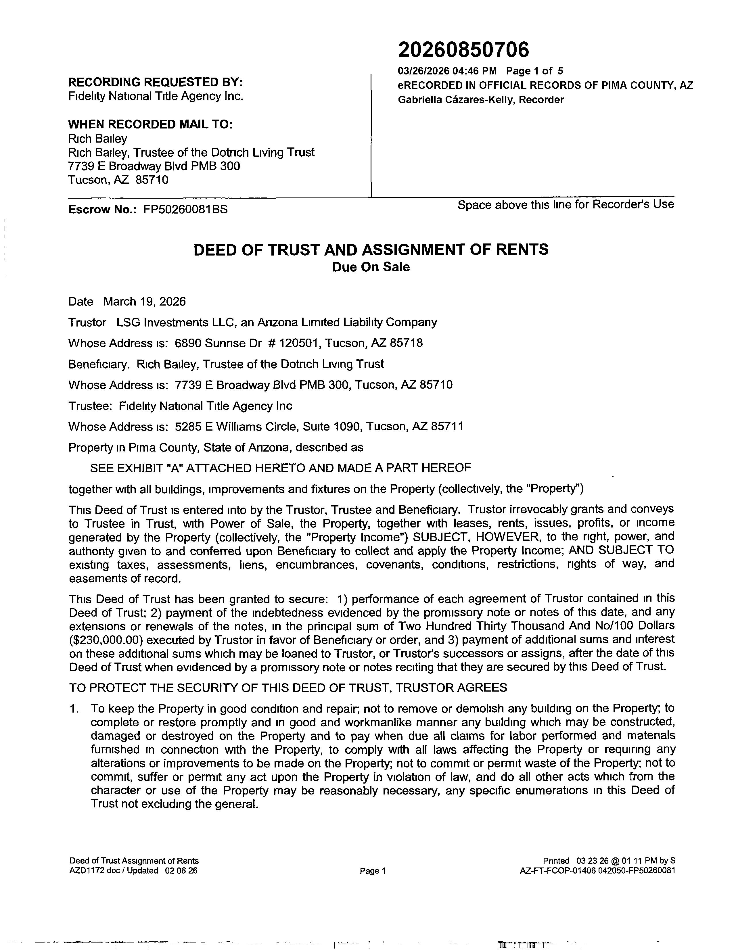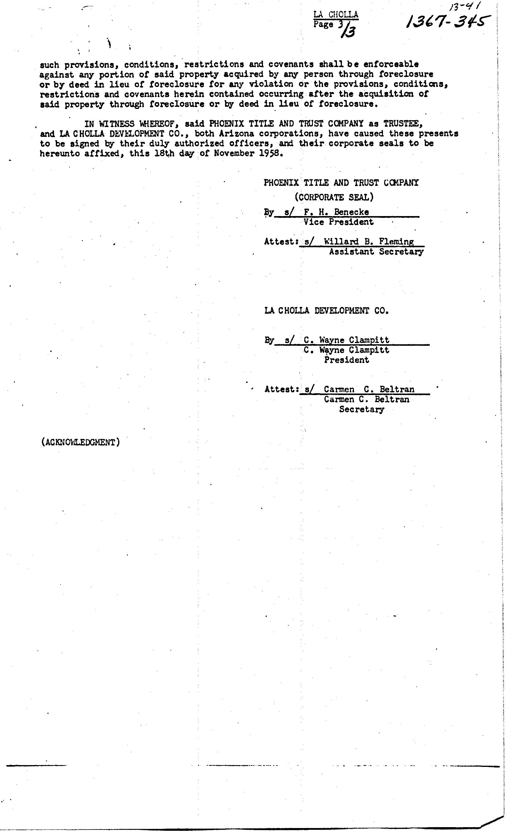 IN WITNESS WHEREOF, said PHOENIX TITLE AND TRUST COMPANY as TRUSTEE, and LA CHOLLA DEVELOPMENT CO., both Arizona corporations, have caused these presents to be signed by their duly authorized officers, and their corporate seals to be hereunto affixed, this 18th day of November 1958.