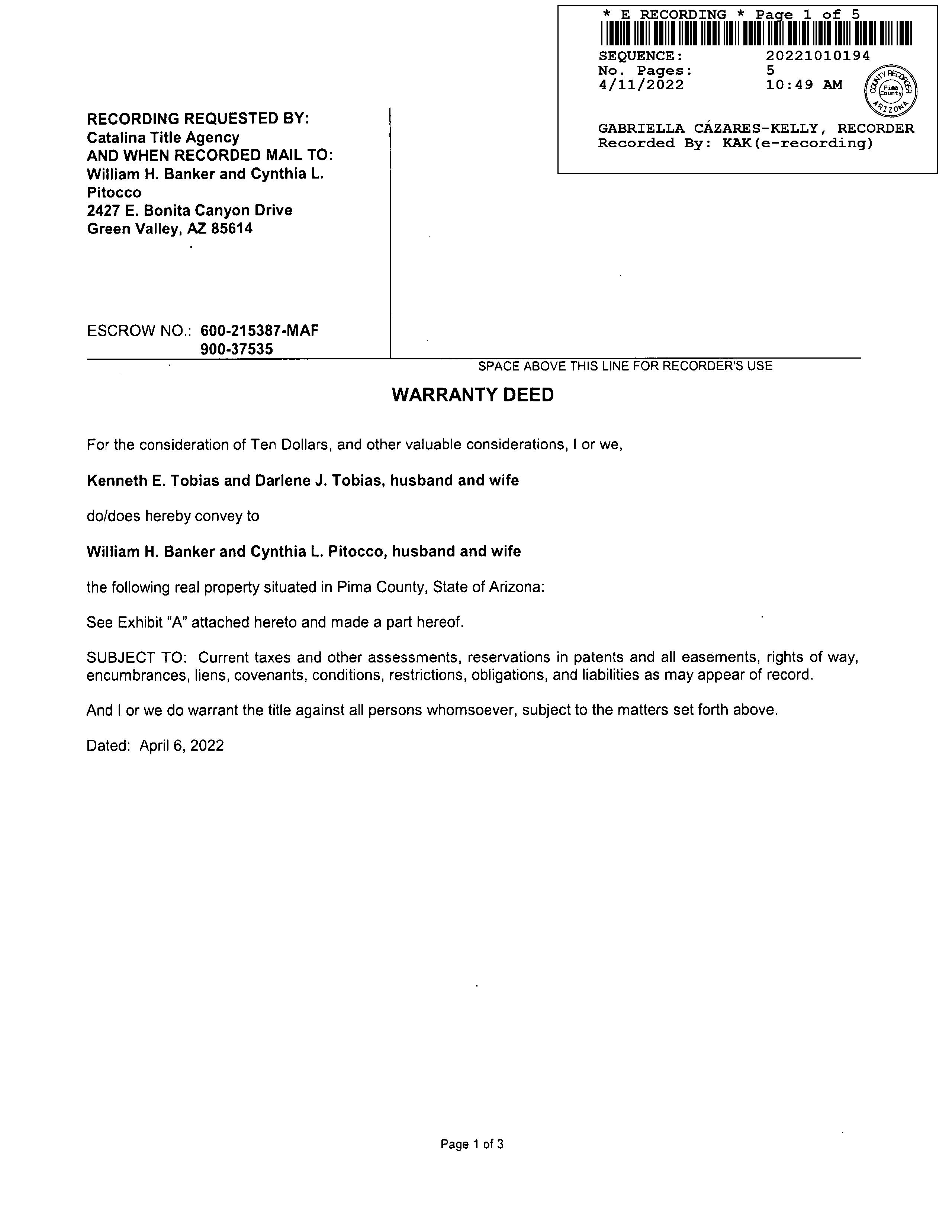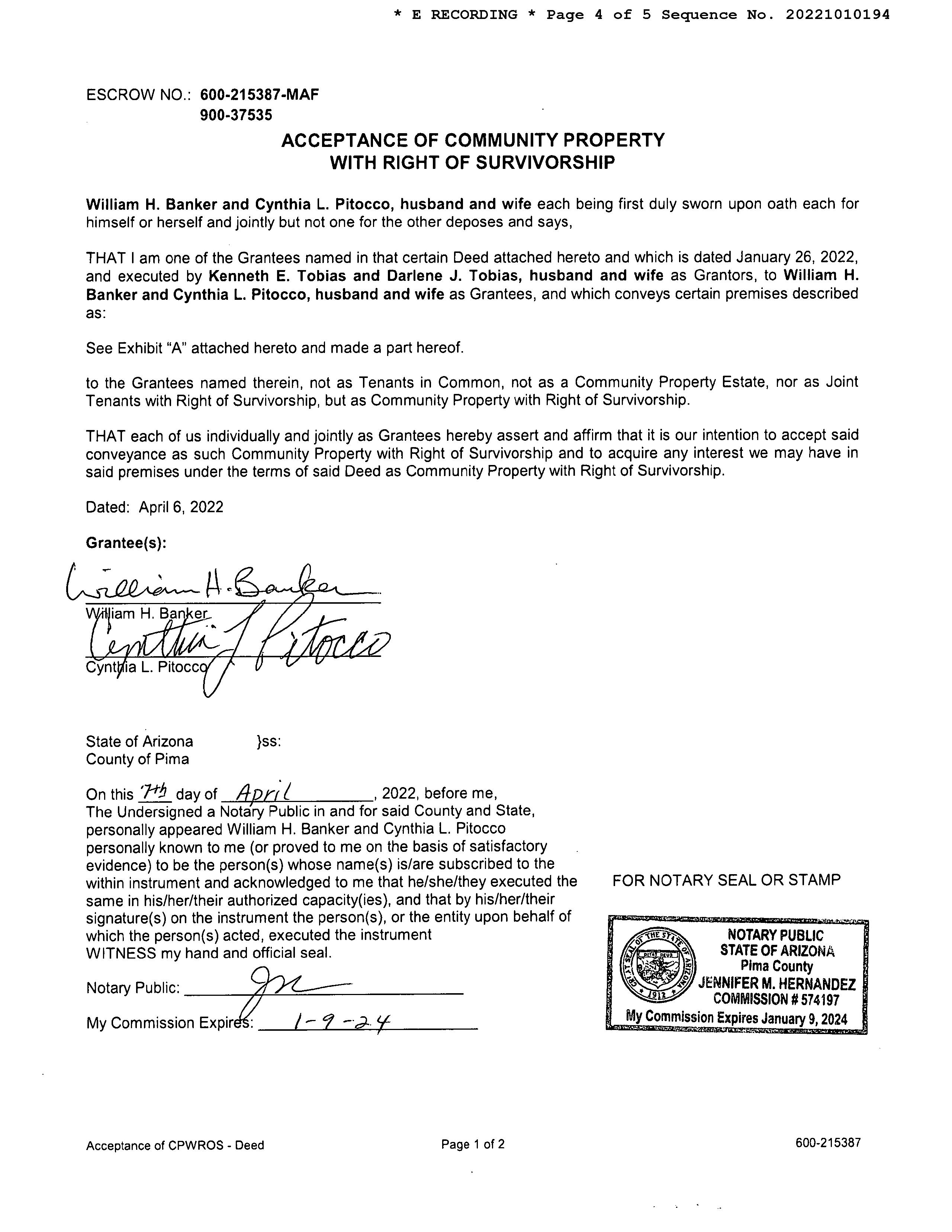 PrimaryOwnerName(s) BANKERWILLIAMH&PITOCCOCYNTHIAL(CP/RS) Vesting CommunityProperty(MaritalCommunity)