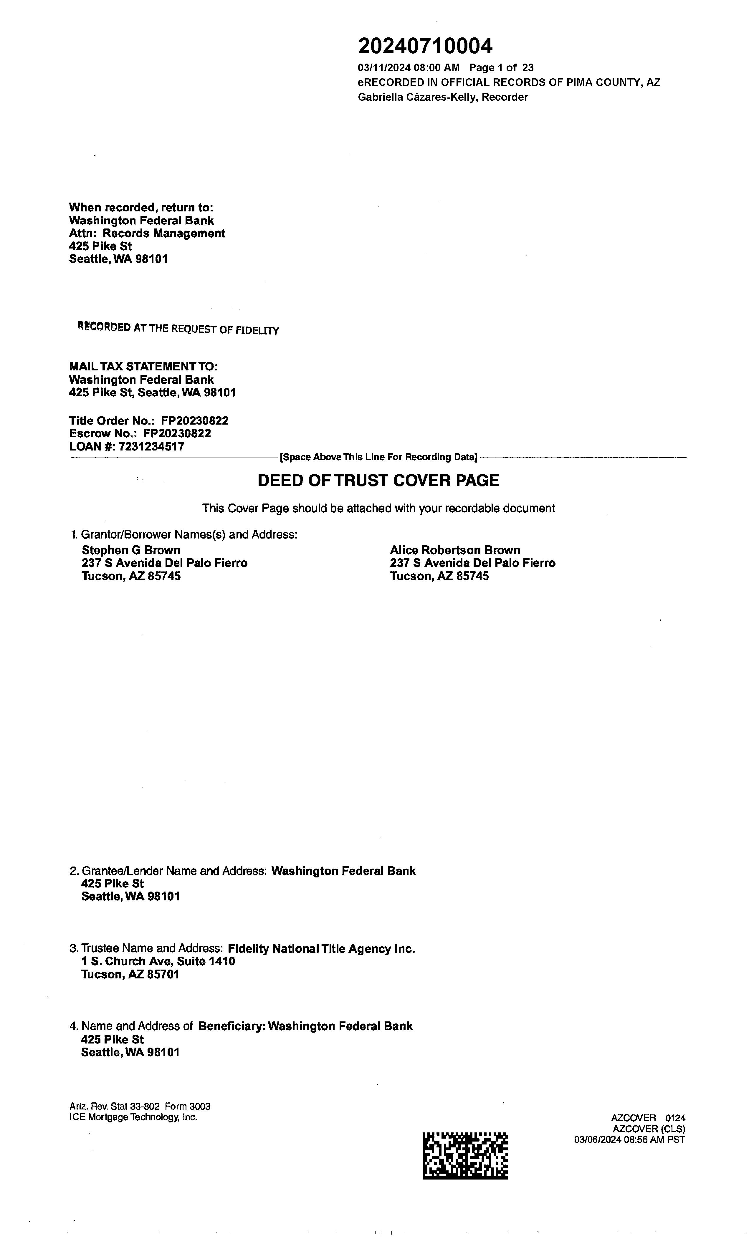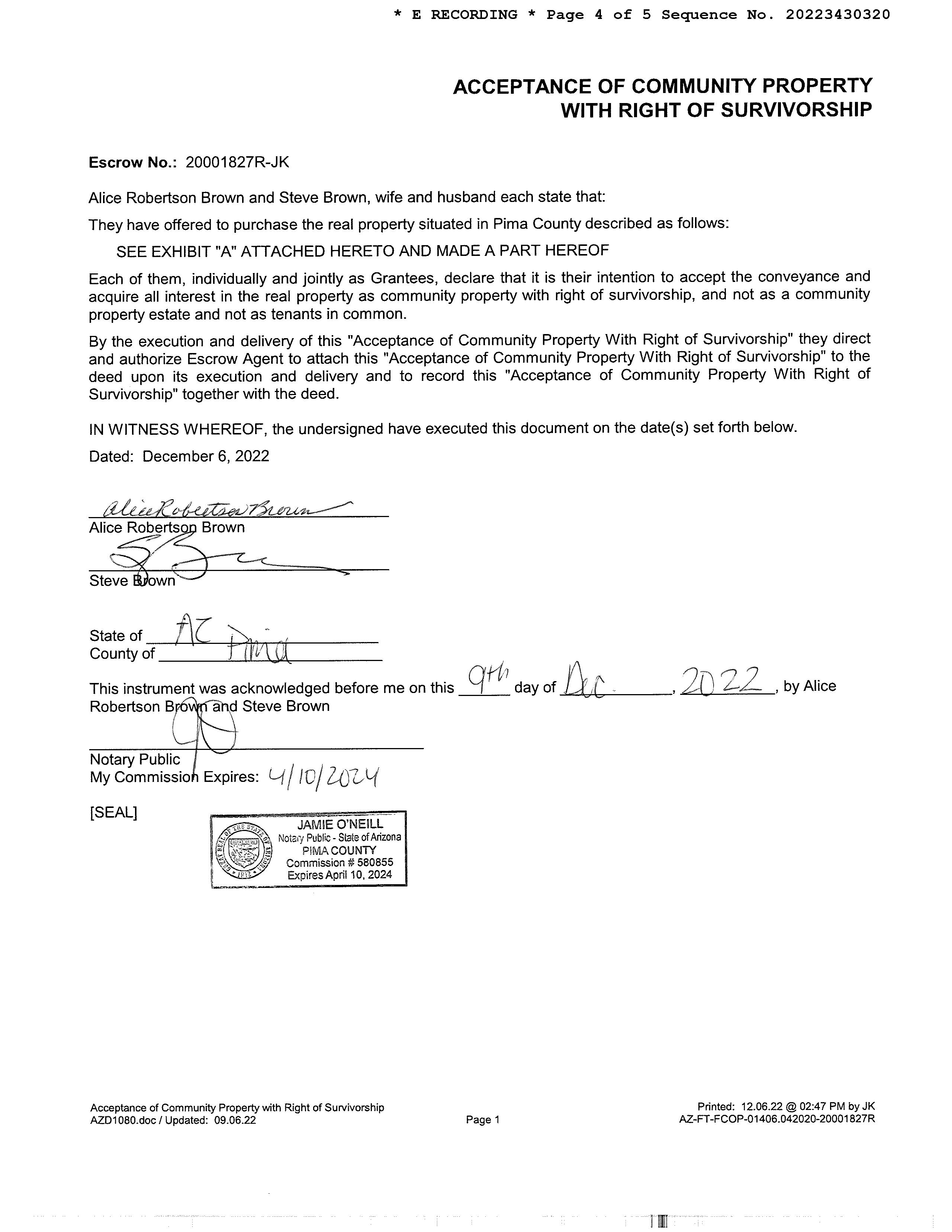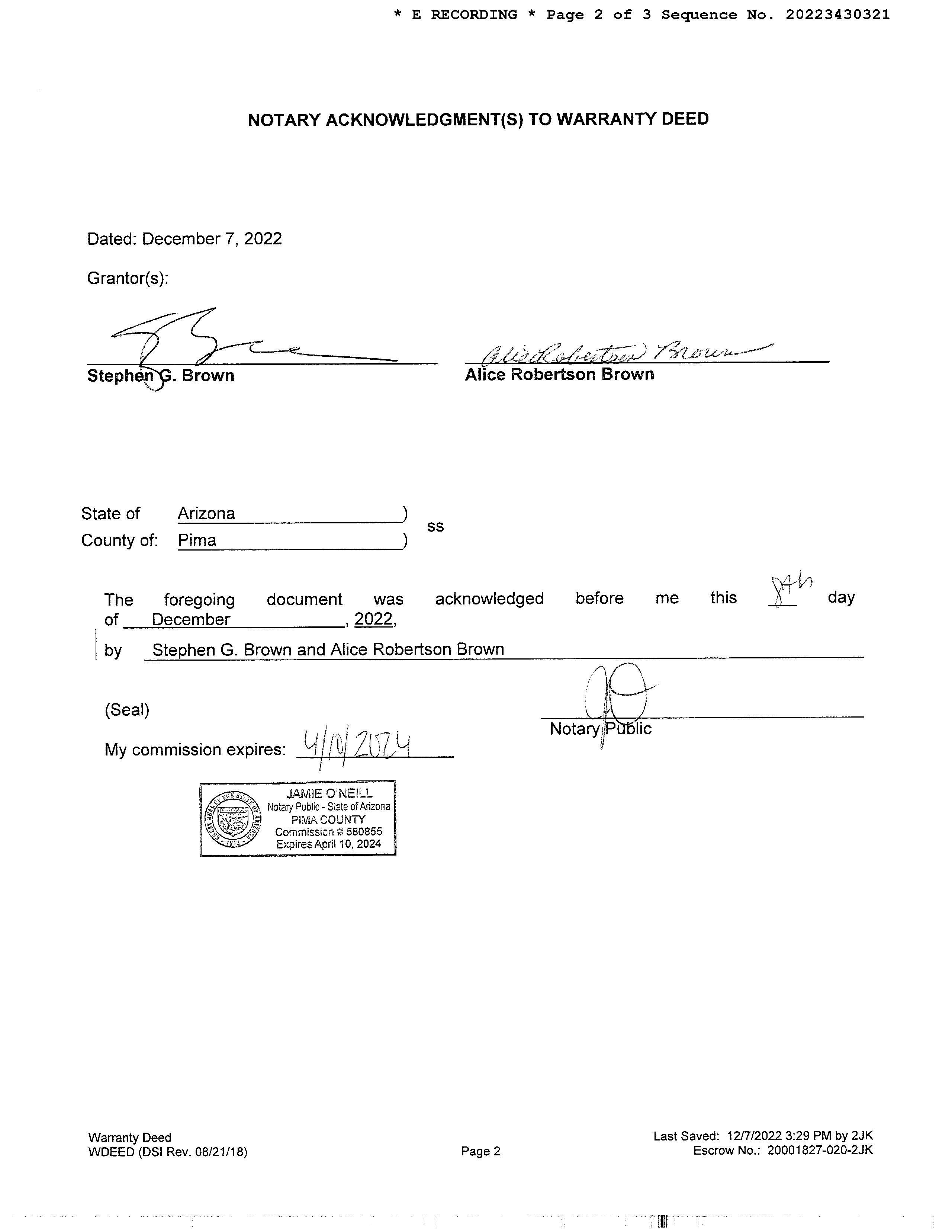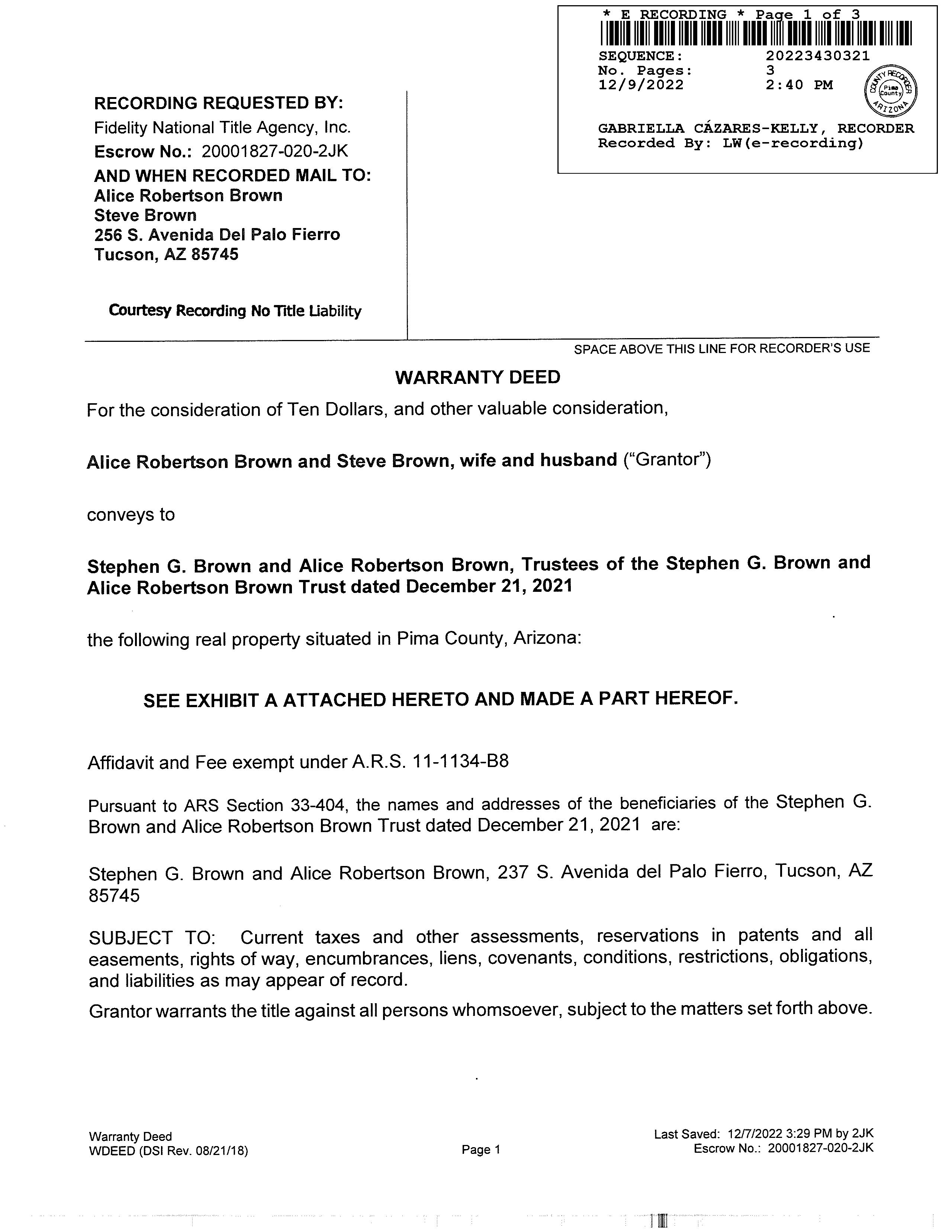 OWNER: STEPHEN G BROWN AND ALICE R AFFIDAVIT 2022 3430321 12/09/2022