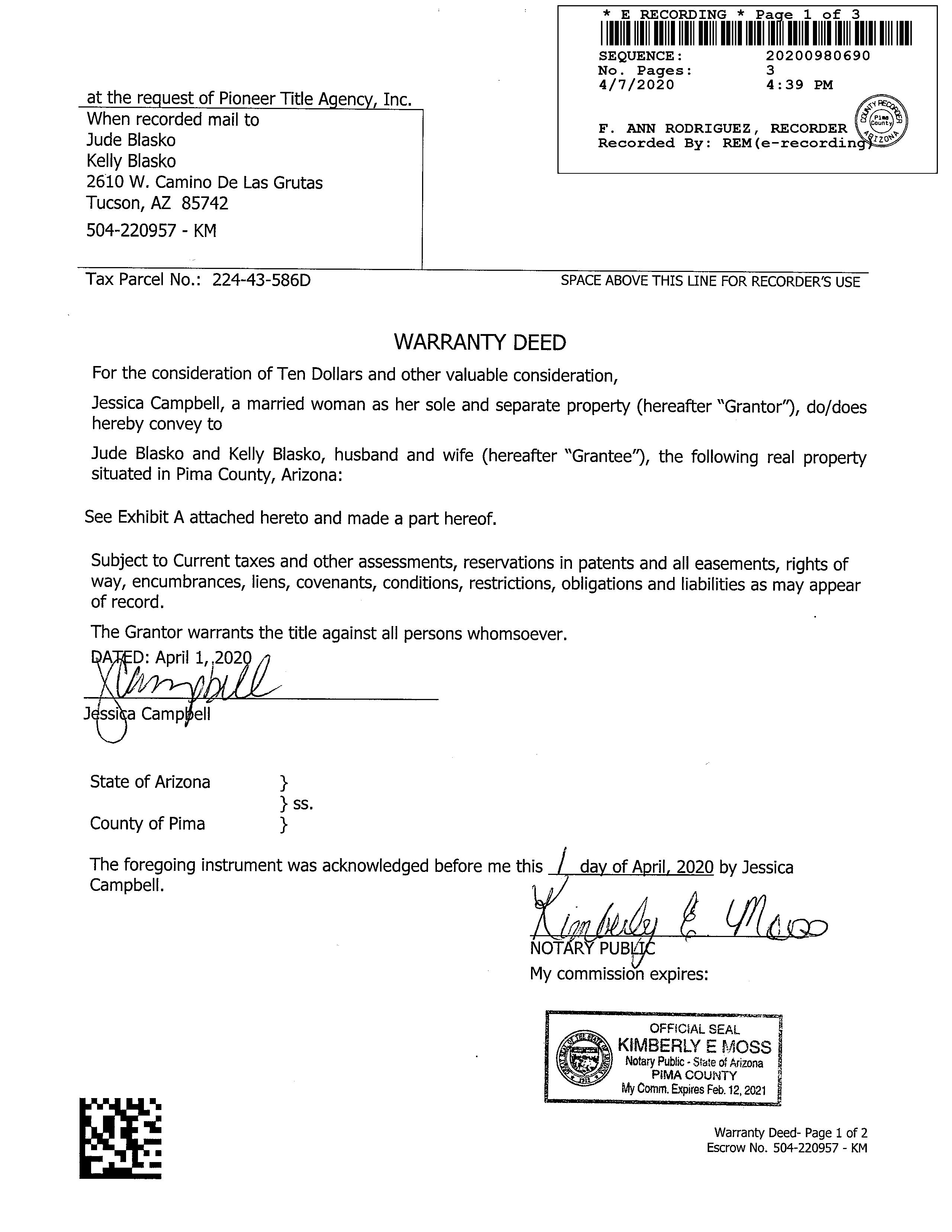 #20 9801 N Red Meadow Pl Tucson Az 85742 Owner Name: Alr Realty Group Llc / APN / Alternate APN: 224-45-1650 / Deed Type: Warranty Deed Land Use: Sfr Subdivision / Tract: North Ranch / Lot Size: 8,655 Year Built / Eff: 1987 / Rec. Date / Price: 02/23/2024 / $310,000 Living Area: 2,060 # of units: Document #: 540289 Bedrooms: Pool: Total Tax Value: $235,882 Bath(F/H): / Customer Name : Kariann Keomaka Customer Company Name : First American Title Insurance Company Prepared On : 04/09/2024 © 2024 CoreLogic. All rights reserved