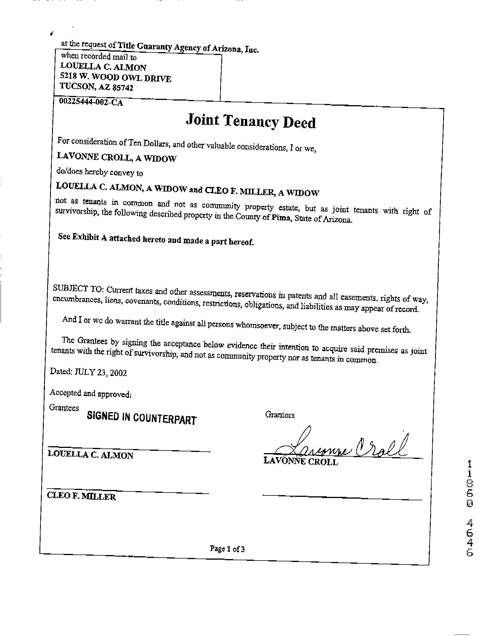This information is furnished without fee and without benefit of a complete title search. No liability is assumed by First American Title. If it is desired that liability be assumed, you may apply for a policy of title insurance with First American Title Insurance Company.