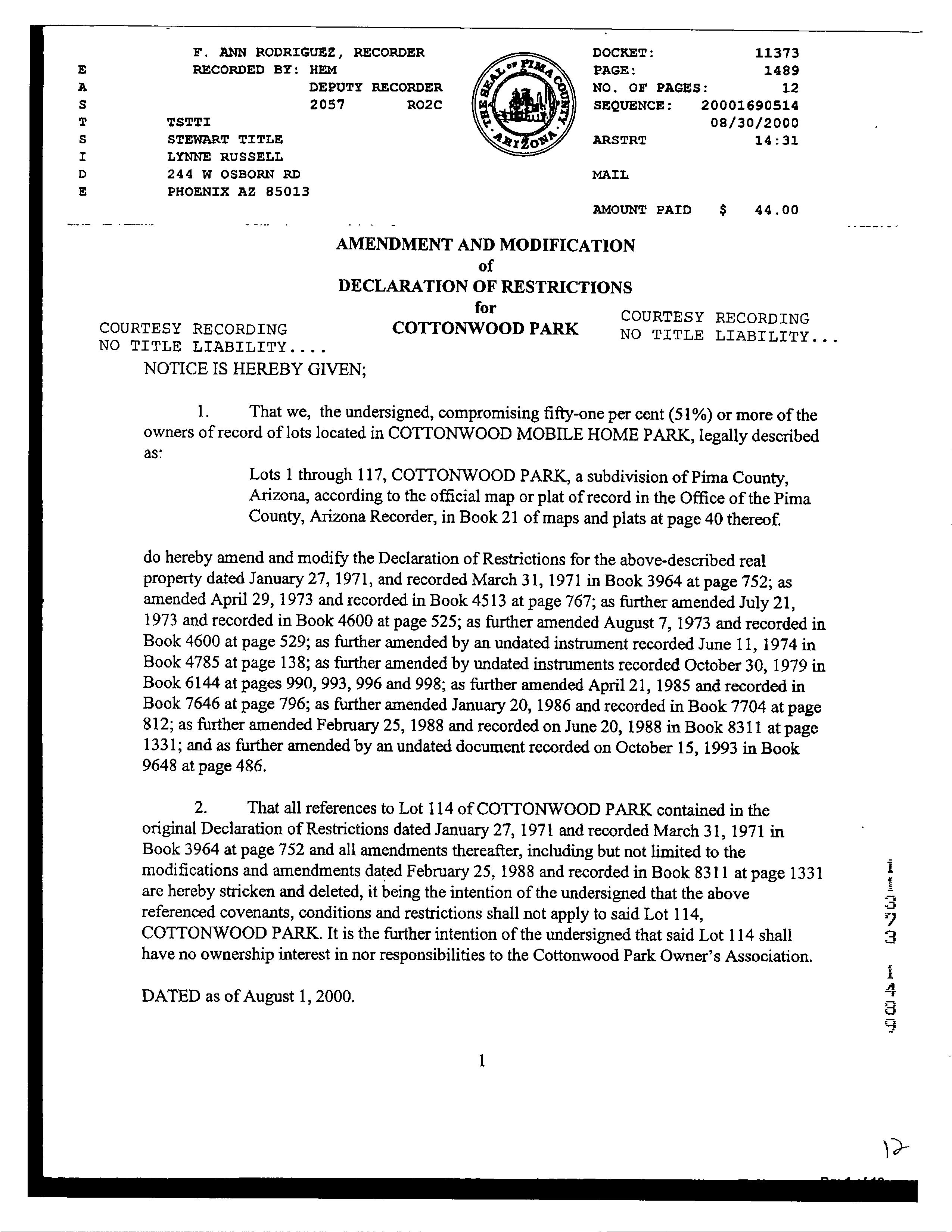 Mailing Address : 2640 S Cottonwood Ln #44, Tucson AZ 85713-2751 C020