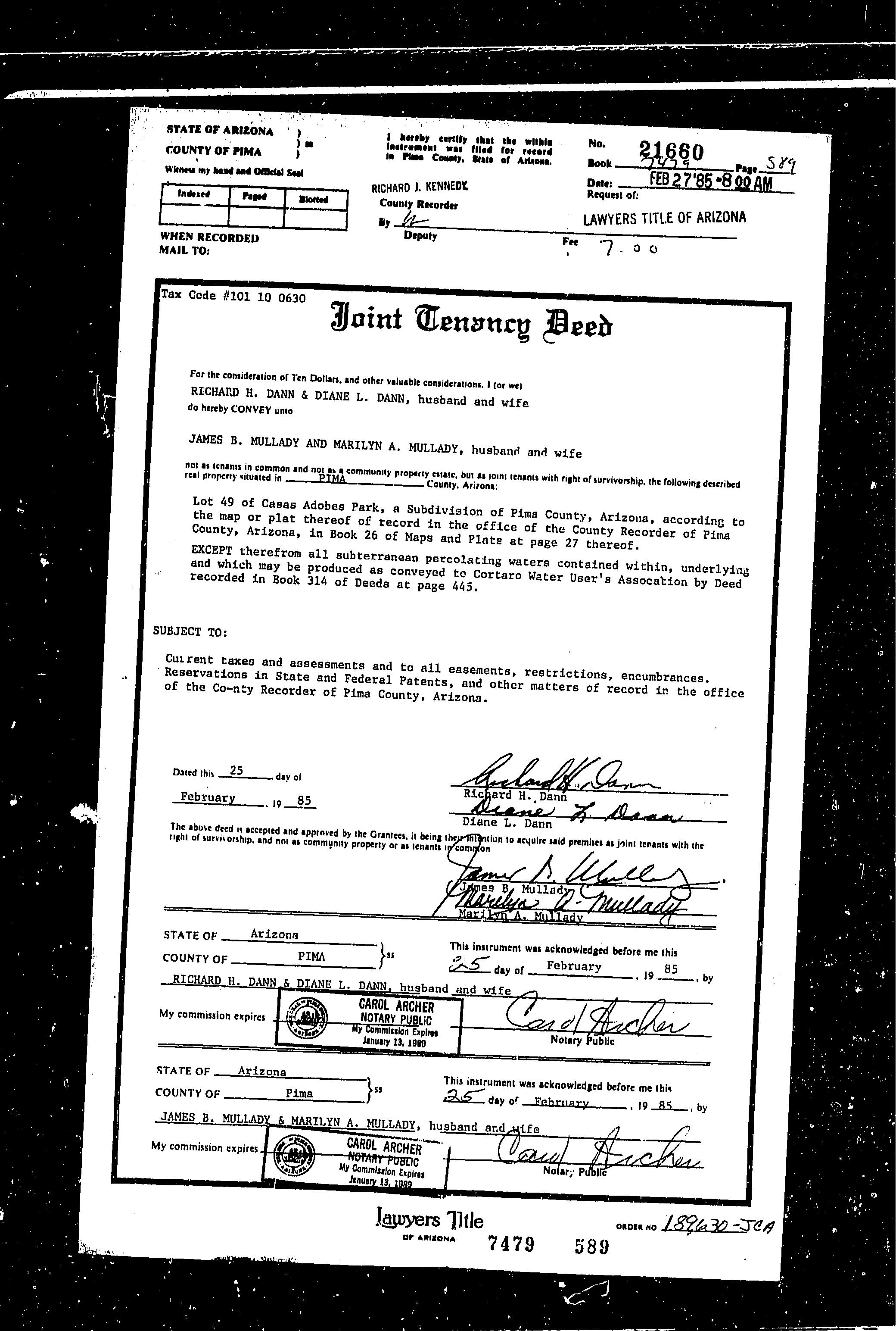 MAIL: ATTN: JAMES B & MARILYN A MULLADY TR 2711 W CALLE DEL SANTO TUCSON AZ 85741