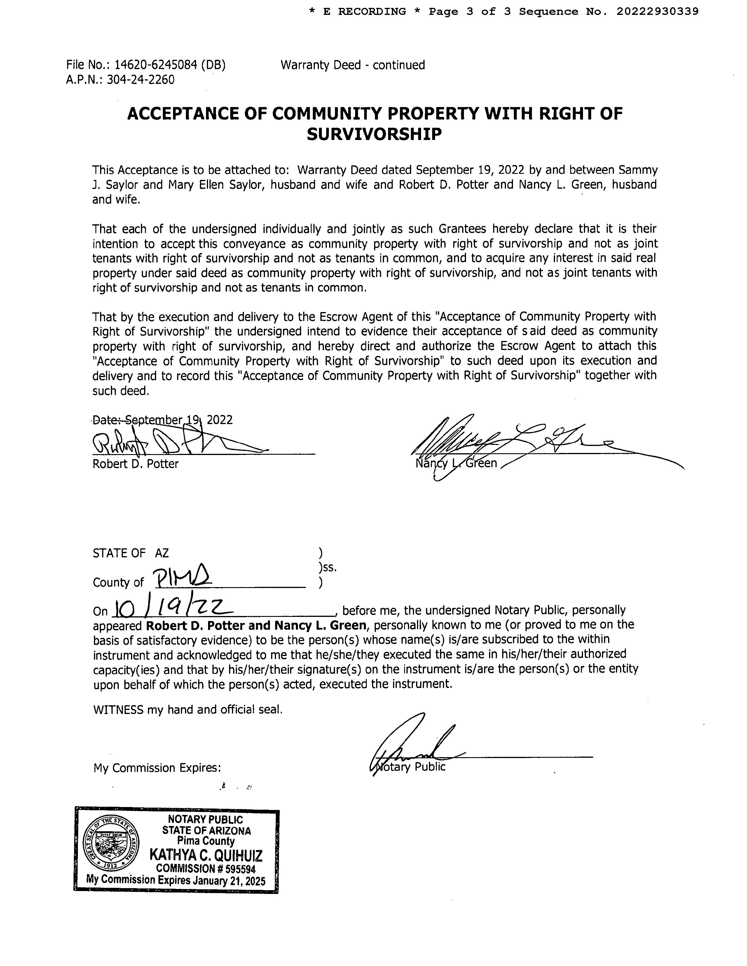OWNER: POTTER ROBERT & GREEN NANCY AFFIDAVIT 2022 2930339 10/20/2022
