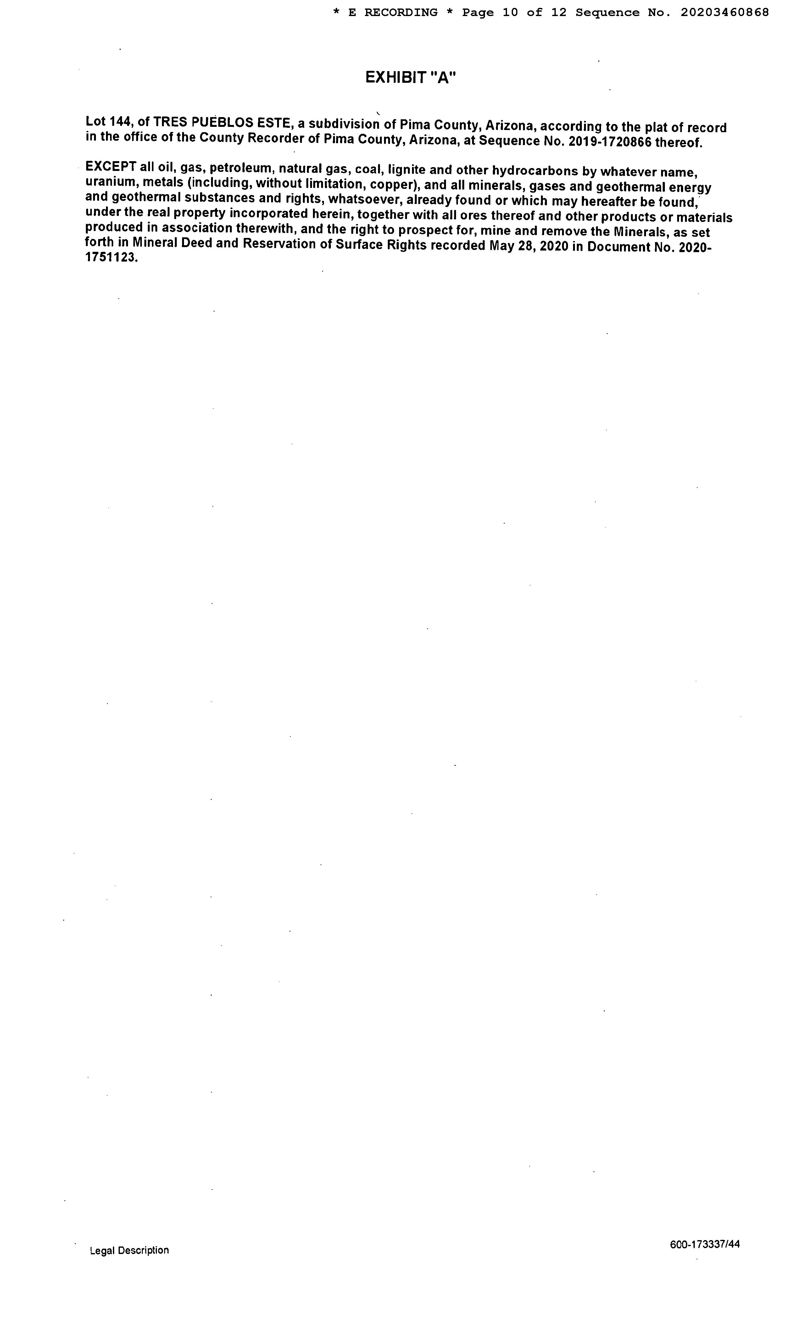 Legal Description : Tres Pueblos Este Sq20191720866 Lot 144 Exc Mineral Rights Below 30ft