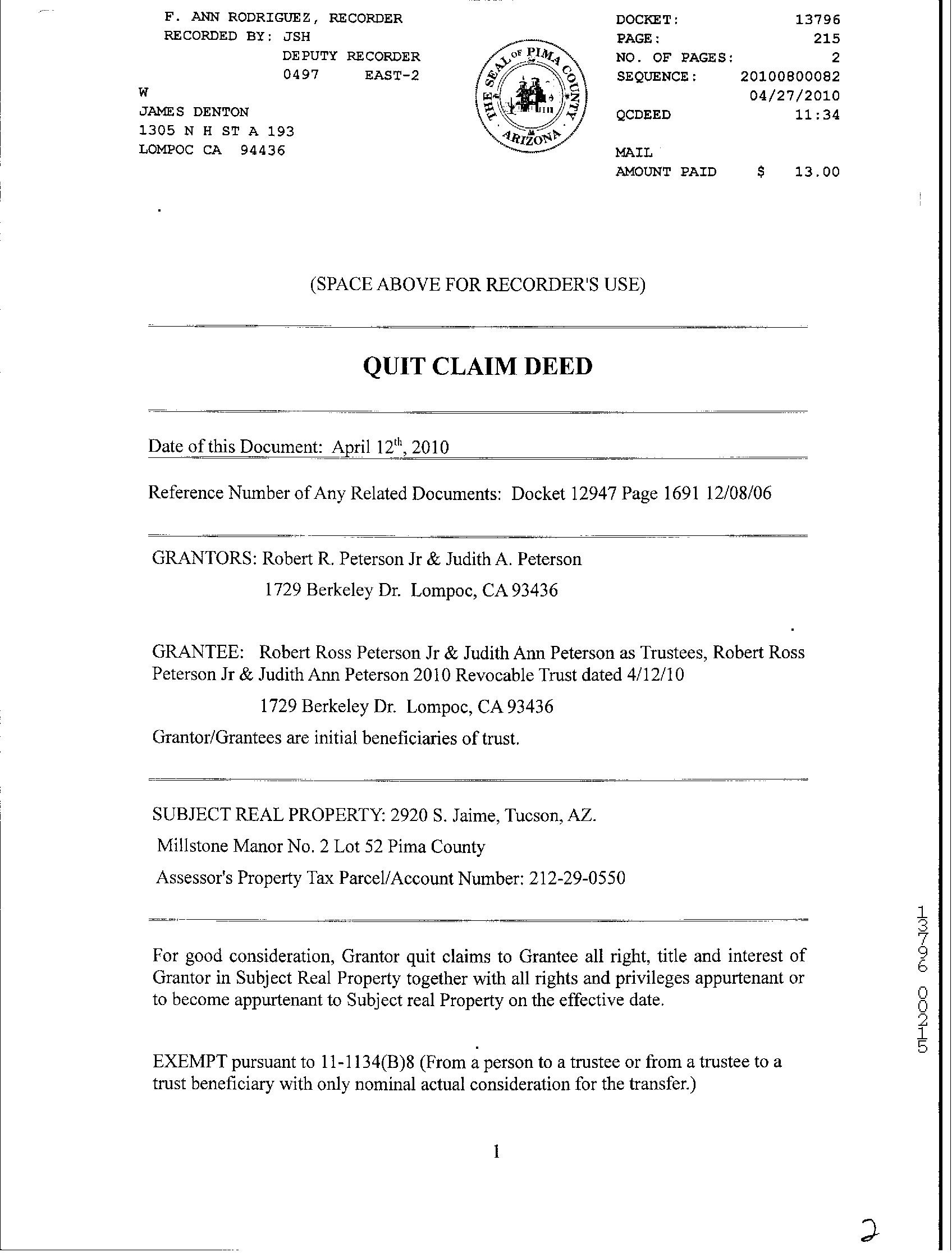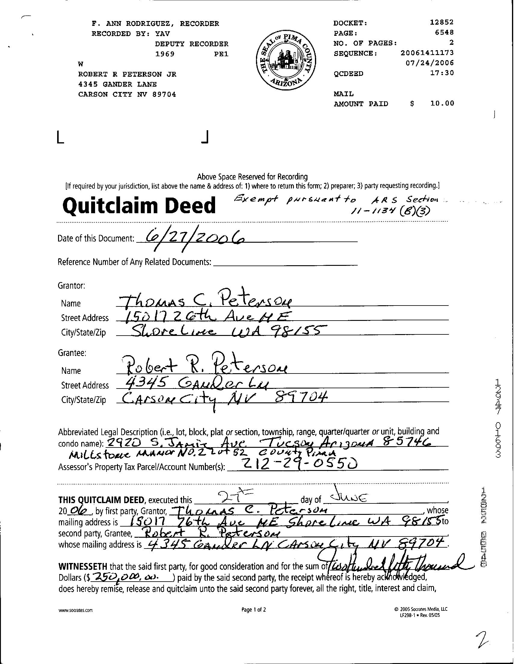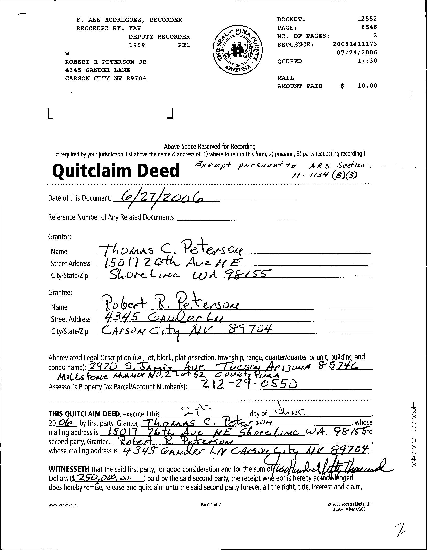 APN / Alternate APN: 212-29-0550 / Deed Type: Quit Claim Deed