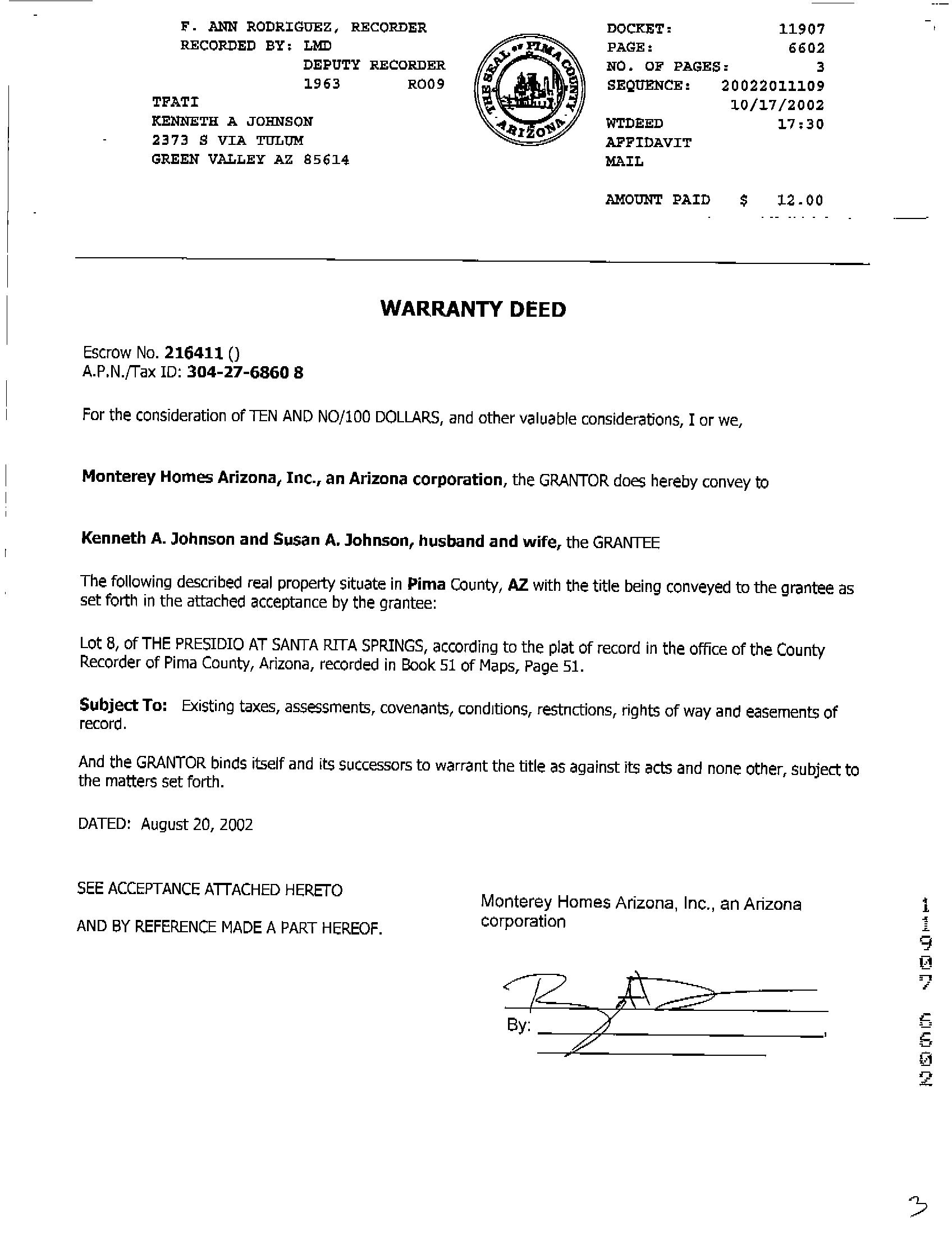 11907 6602 WD MONTEREY HOMES ARIZONA INC