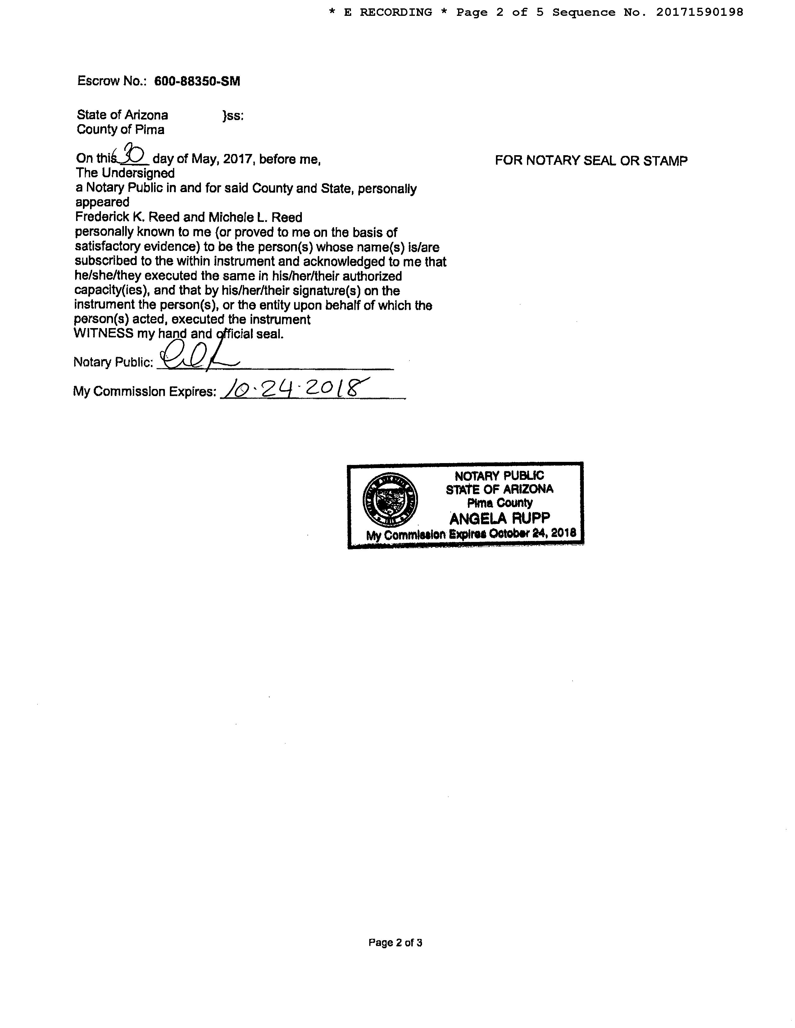 Recording/Sale Date : 06/08/2017 / 05/19/2017 1st Mtg Amount/Type : $231,200 / Cnv Sale Price : $289,000 1st Mtg Document # : 1590199 Document # : 1590198 1st Mtg Term : 30 Deed Type : Warranty Deed Price Per SqFt : $129.25 Title Company : Catalina Title Seller Name : Reed Frederick K & Michele L Prior Sale Information Prior Rec/Sale Date : 03/21/2002 / 03/06/2002 Prior Lender : Miscellaneous Fin Prior Sale Price : $165,000 Prior 1st Mtg Amt/Type : $156,750 / Conv Prior Doc Number : 11761-1807 Prior 1st Mtg Rate/Type : / Fixed Rate Loan Prior Deed Type : Warranty Deed Customer Name : Lisa Mrazek Customer Company Name : First American Title Insurance Company Prepared On : 04/18/2024 © 2024 CoreLogic. All rights reserved
