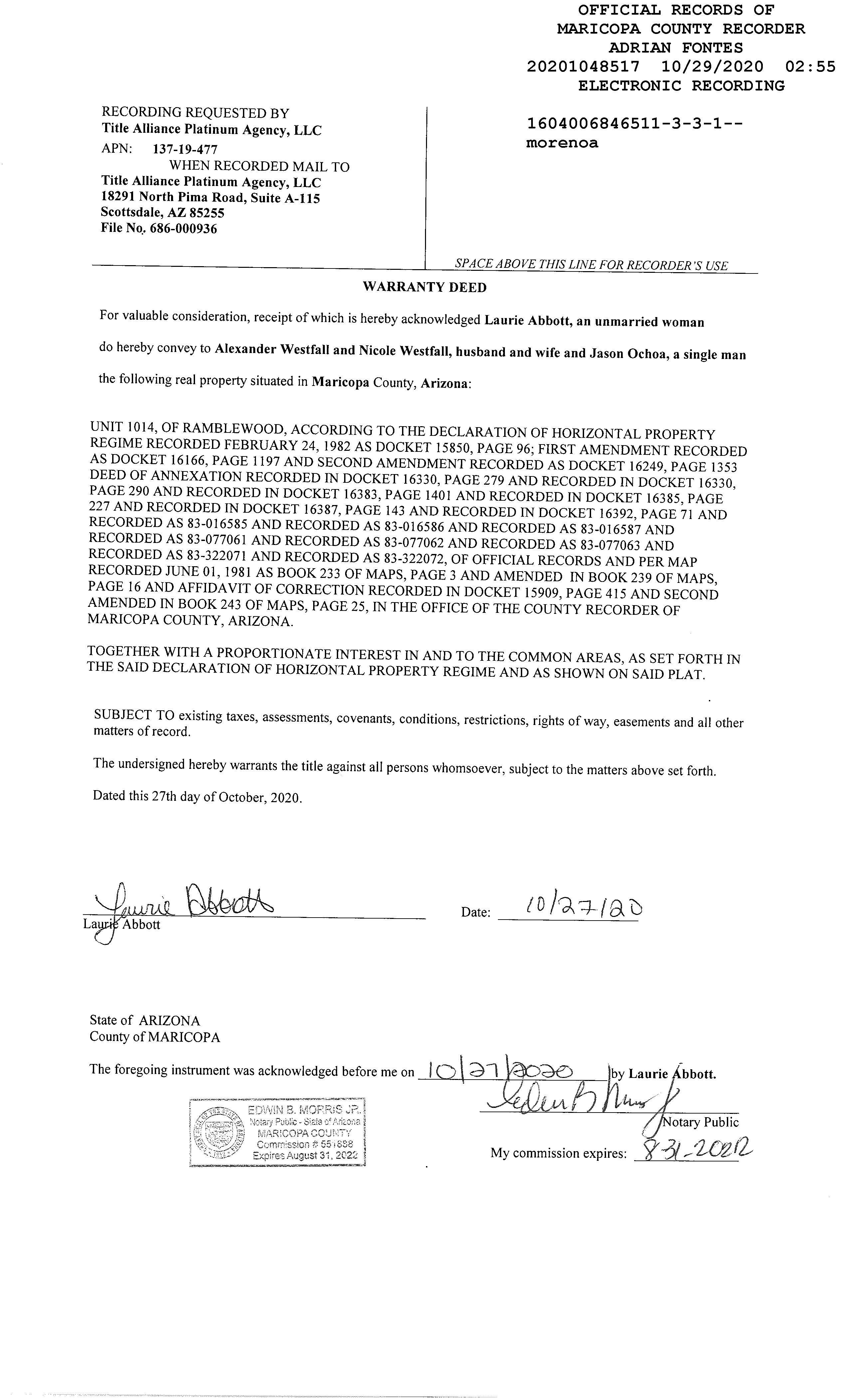 OWNER: WESTFALL ALEXANDER & NICOLE 2020 1048517 10/29/2020