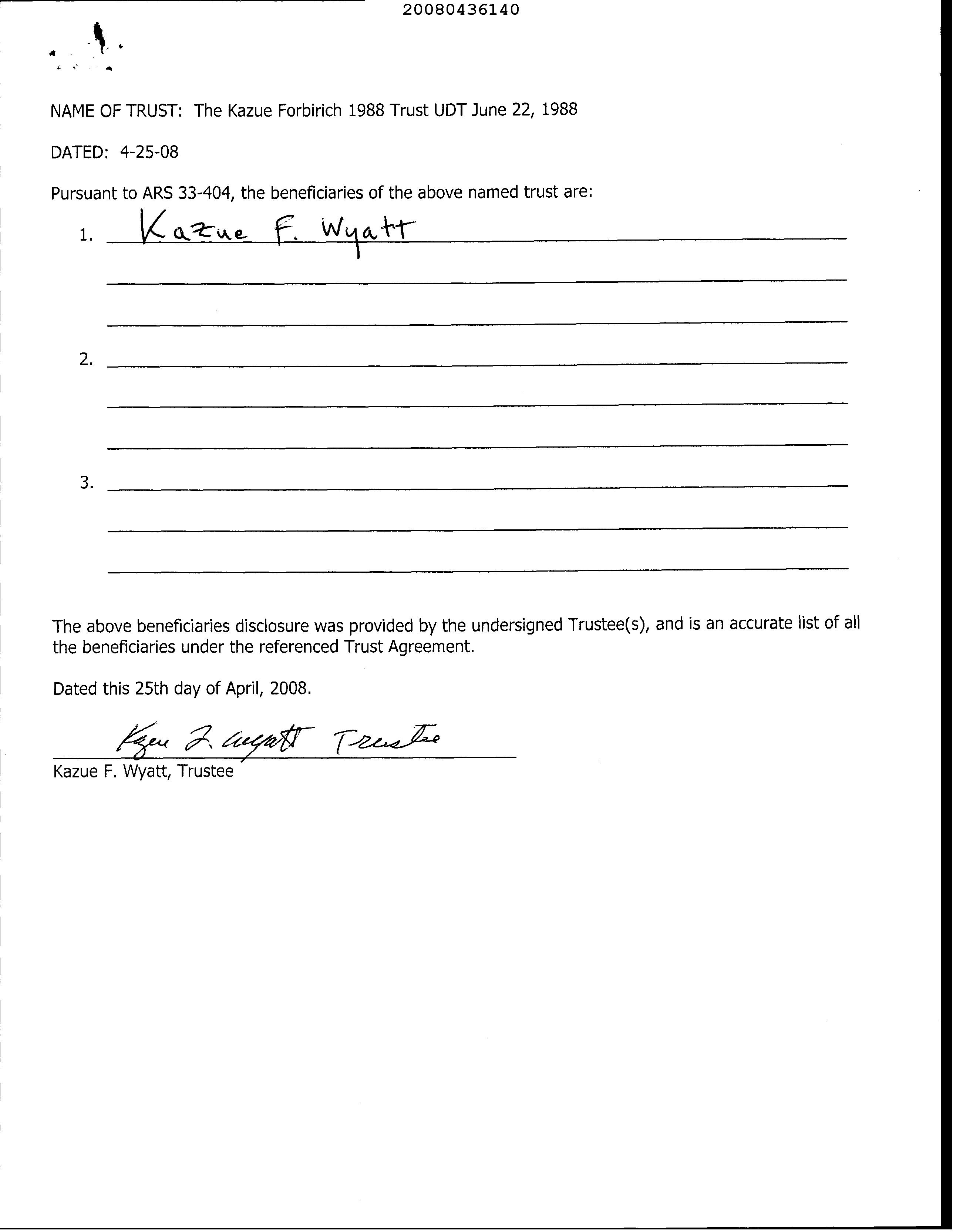 Owner Name : Kazue Forbrich 1988 Trust Udtjune 22nd 1988