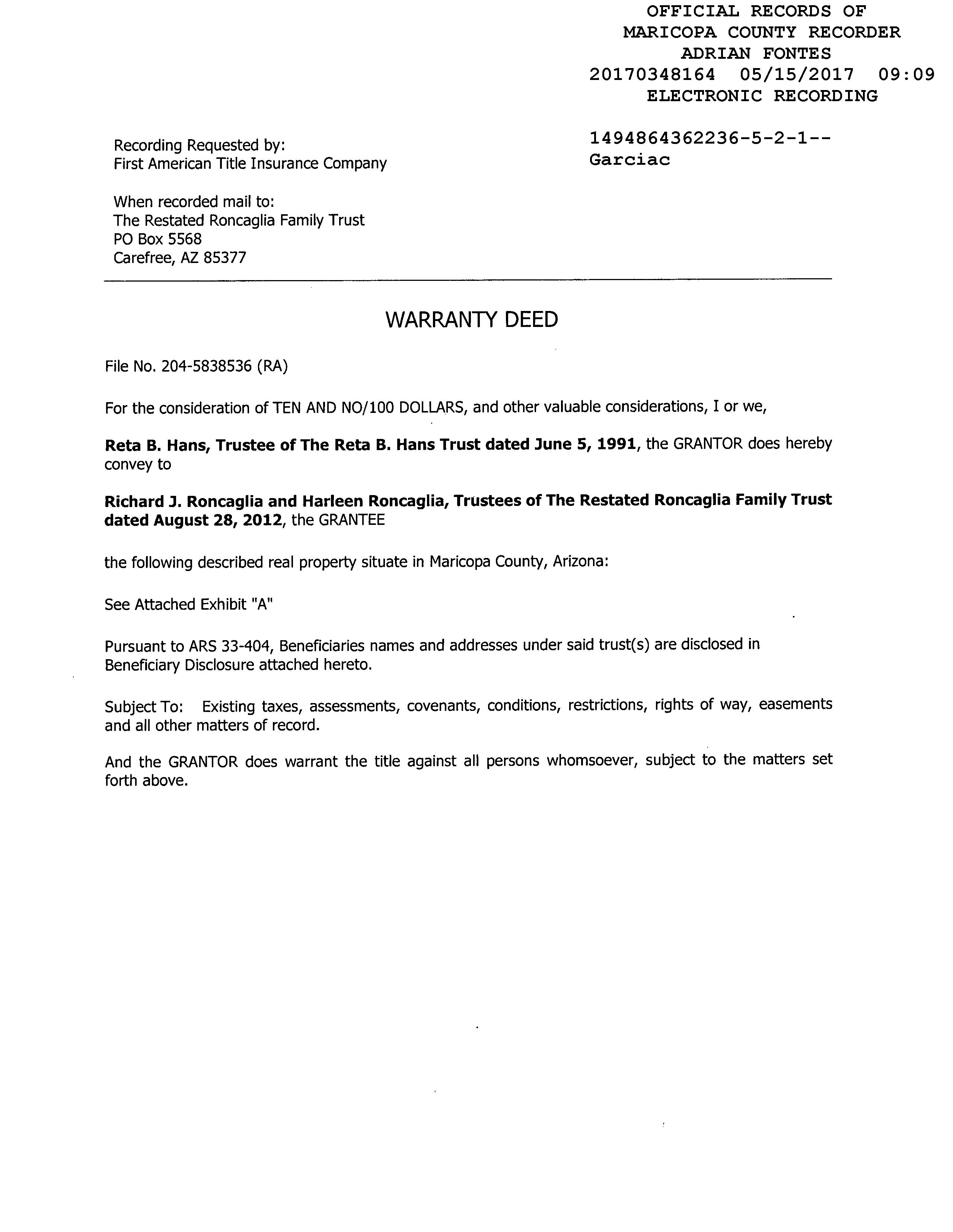 OWNER: RONCAGLIA FAMILY TRUST 2017 348164 05/15/2017