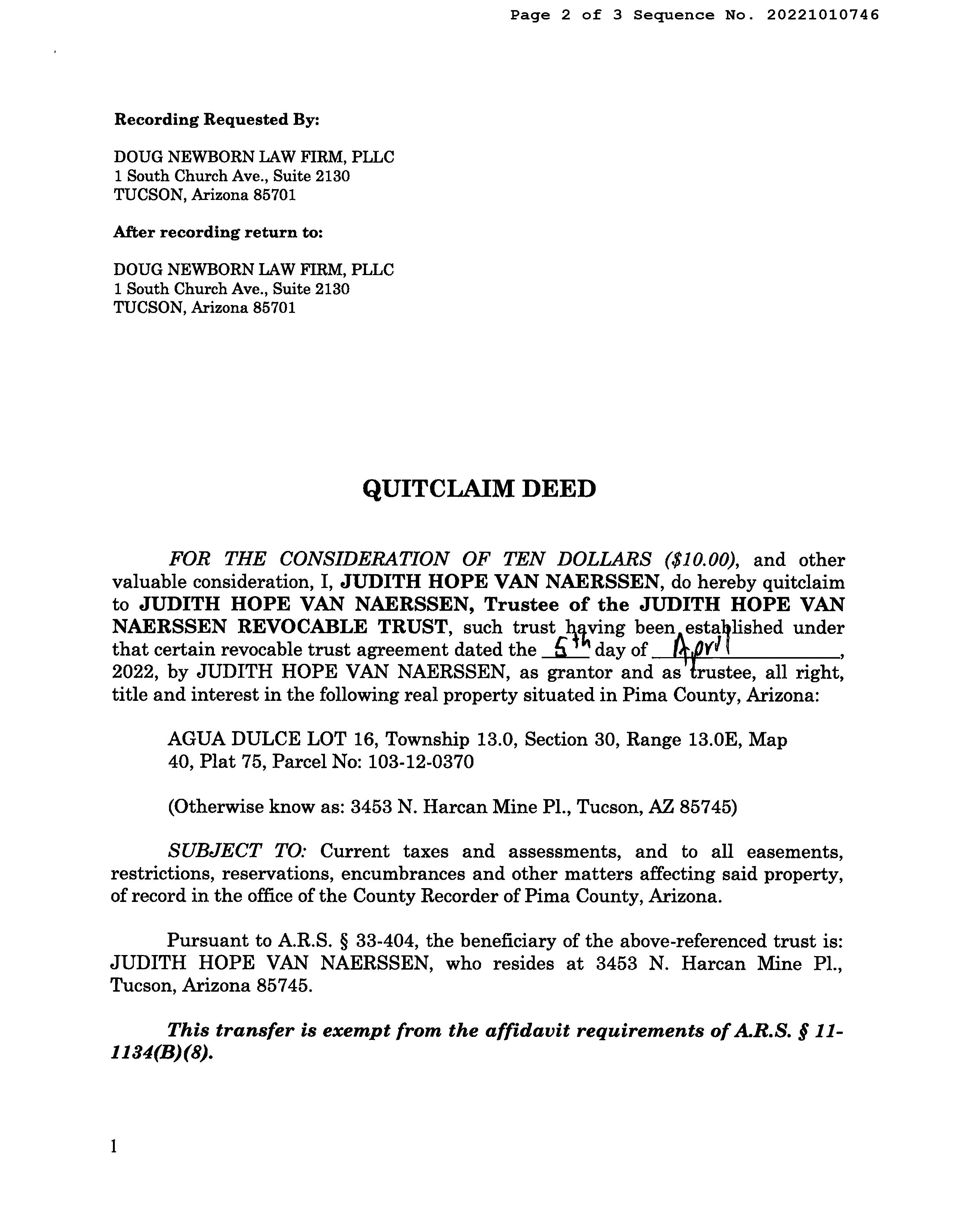 Owner Name: Van Naerssen Judith Hope / APN / Alternate APN: 103-12-0370 / Deed Type: Warranty Deed