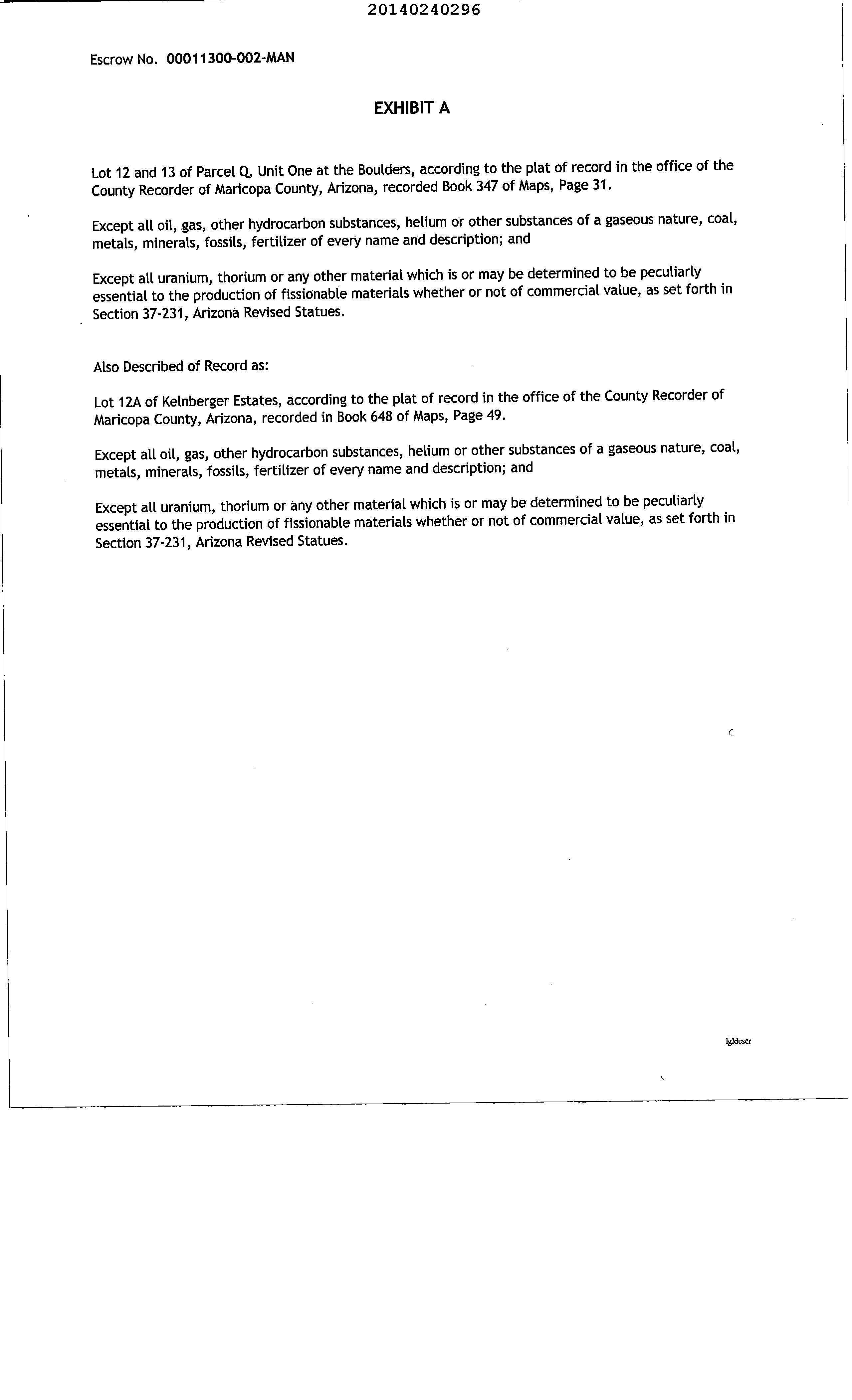 Legal Description : Lot 13 Parcel Q Unit One At The Boulders Community Mcr 347-31 Lot 12 Tog Wi Lot 13 (also Desc As Lot 12a Kelnberger Estates Mcr 648-49)