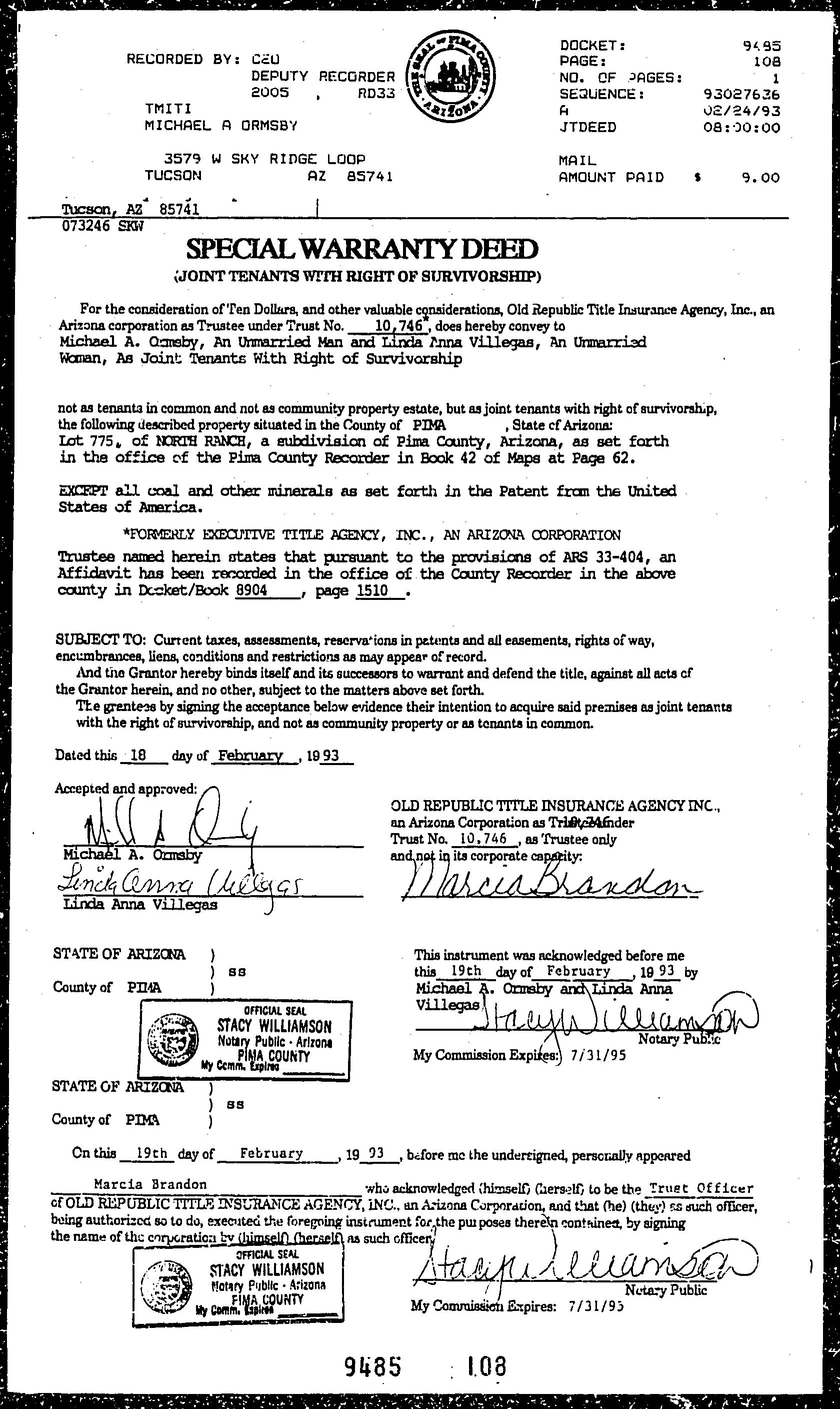 OWNER: ORMSBY MICHAEL A & VILLEGAS LINDA ANN 9485 108 02/24/1993