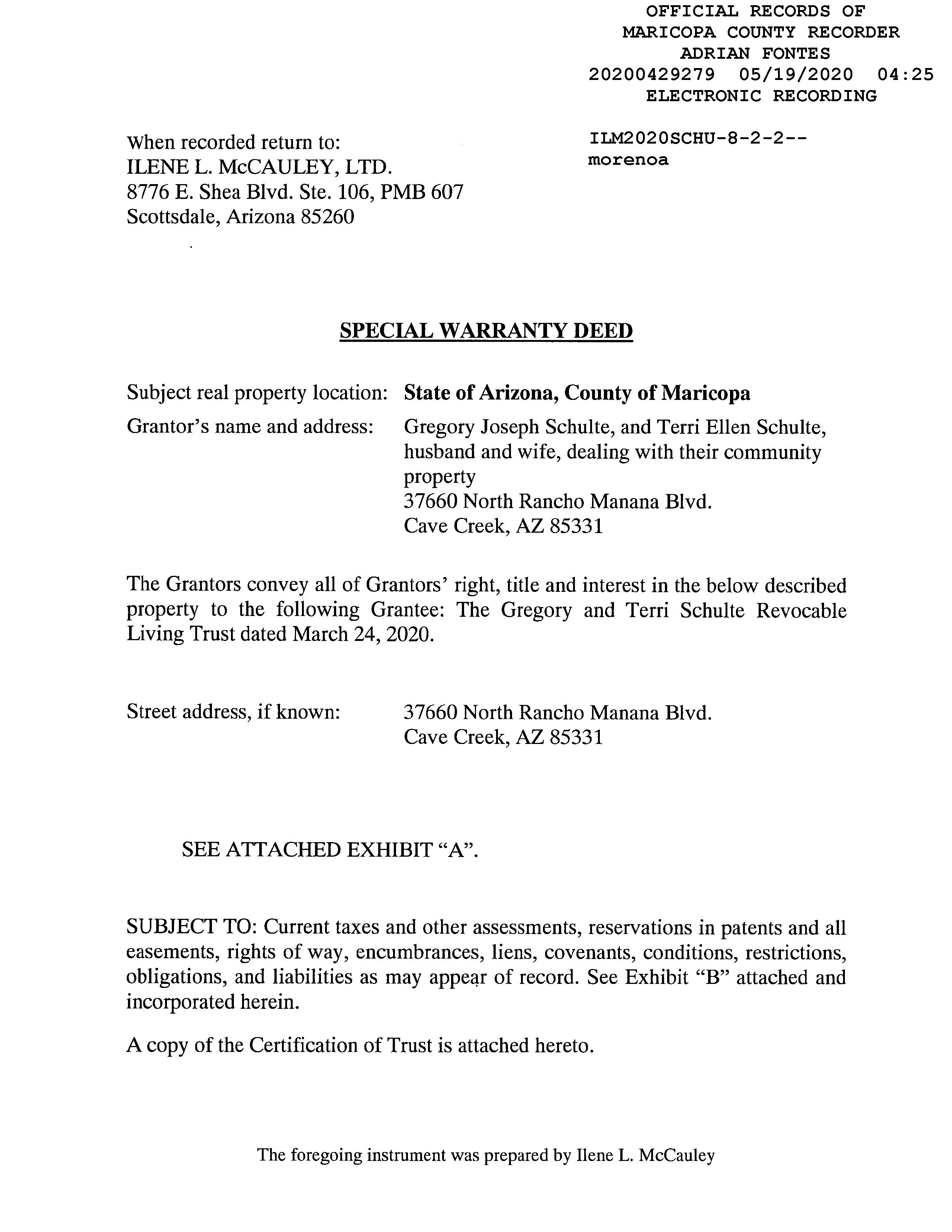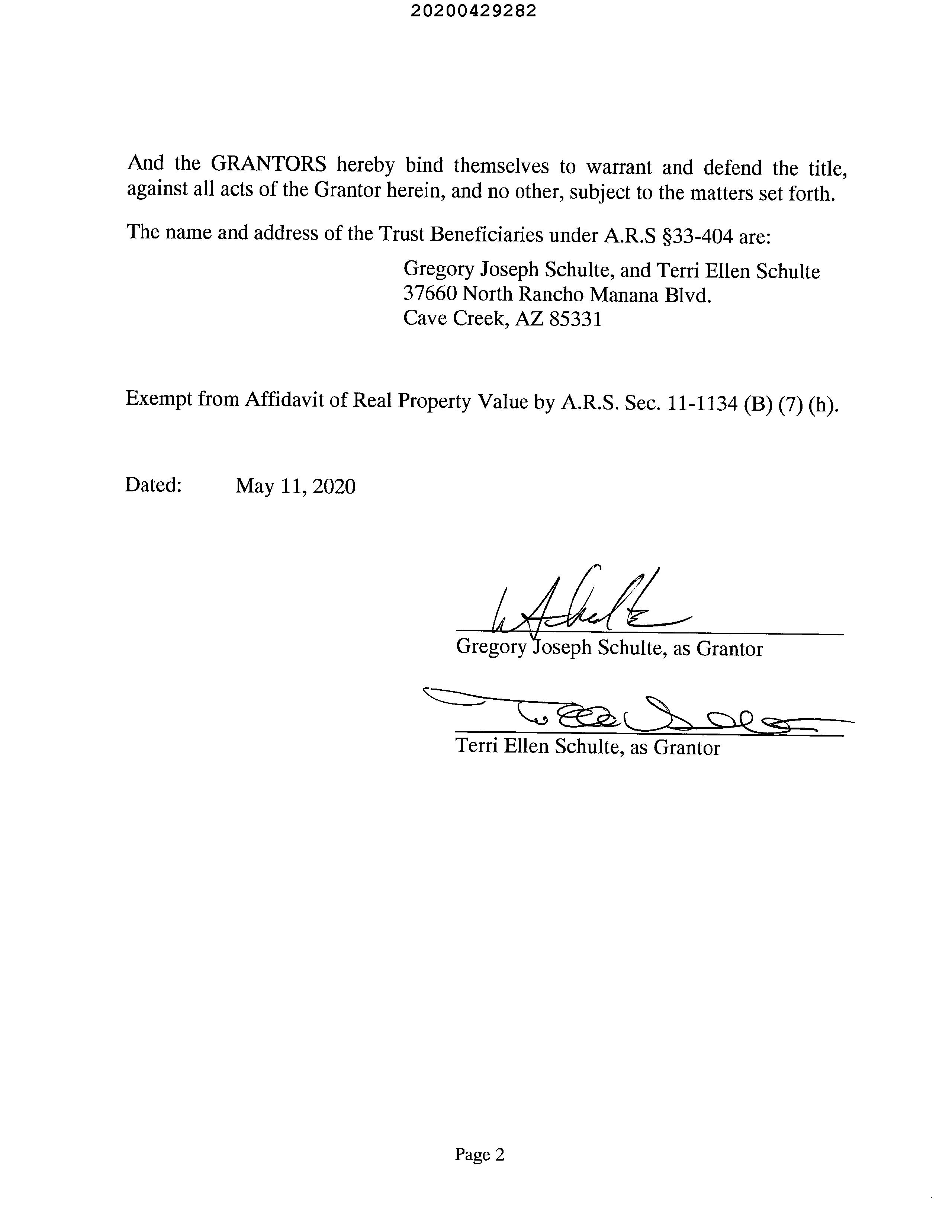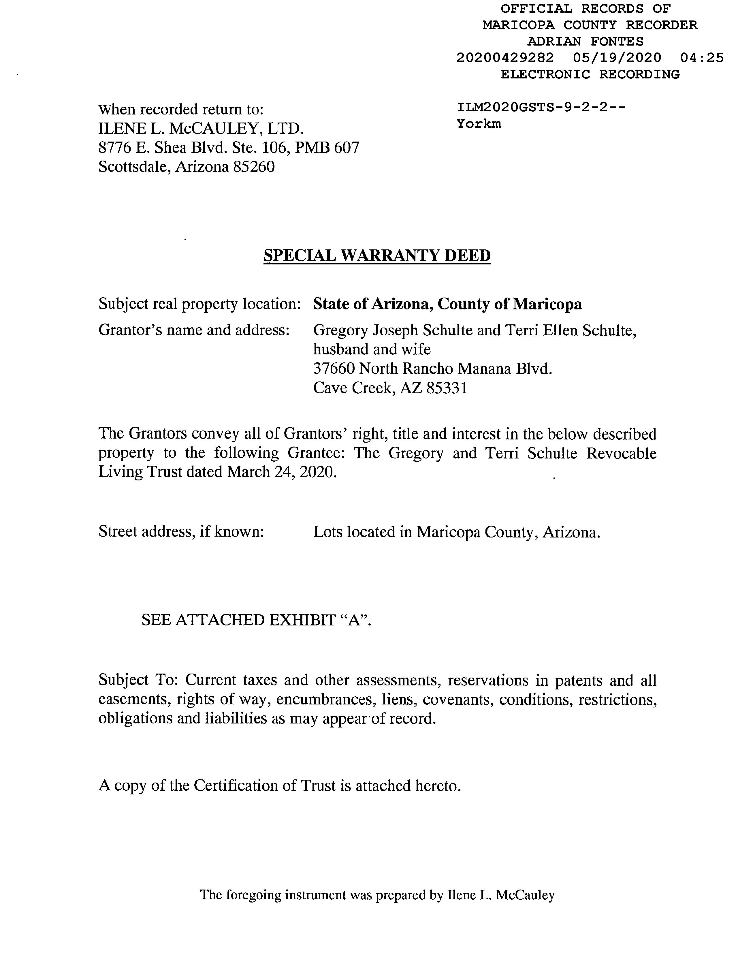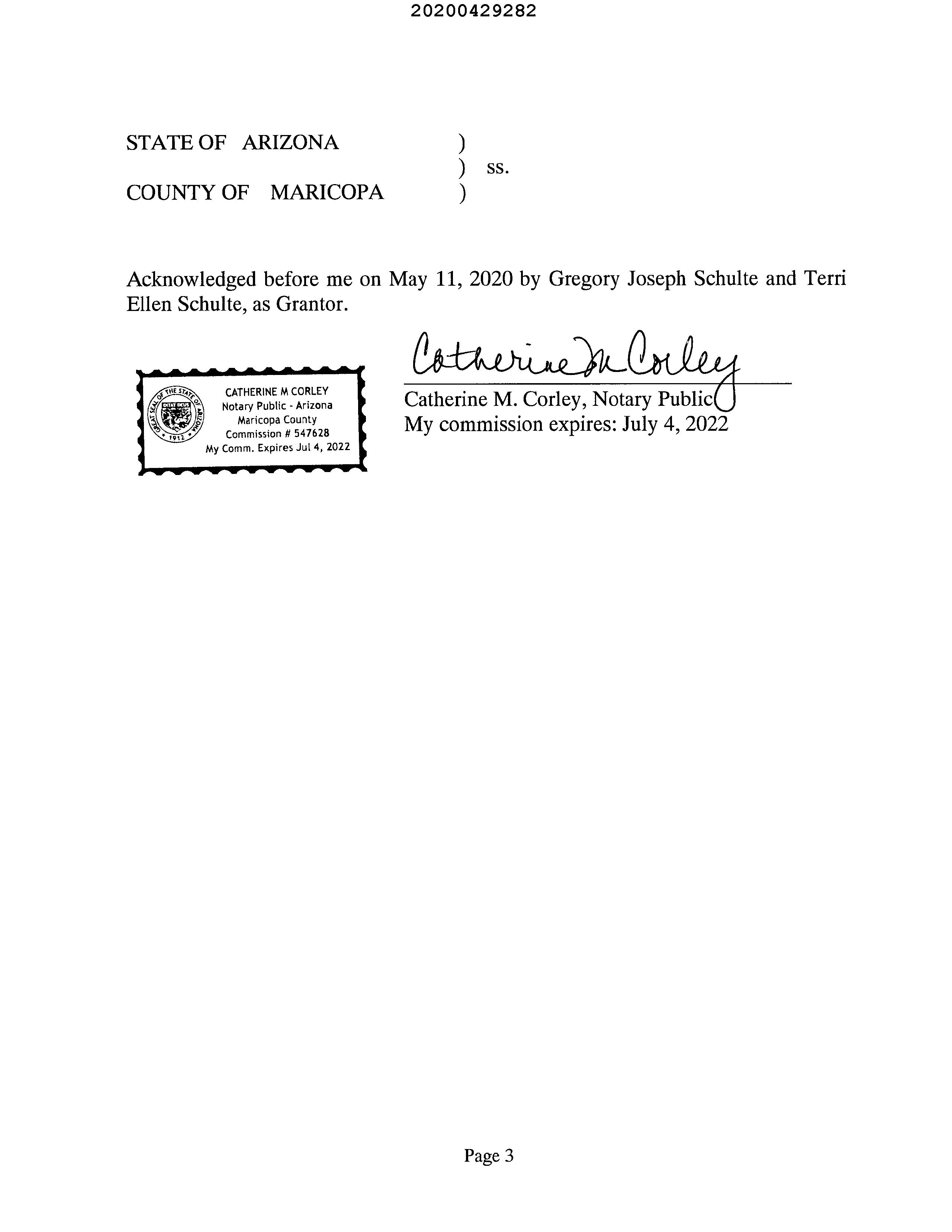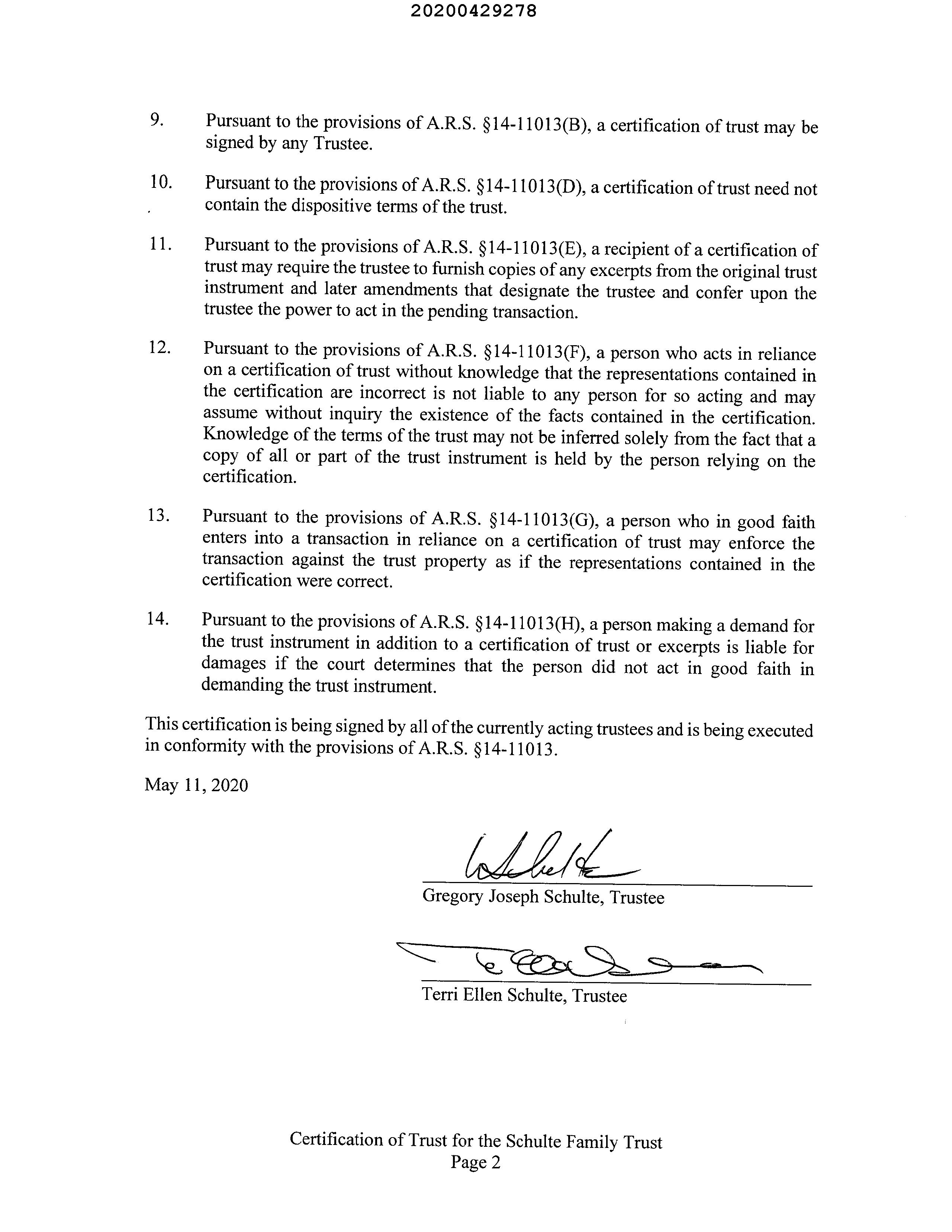 OWNER: GREGORY AND TERRI SCHULTE REVOCABLE LIVING TR 2020 429282 05/19/2020