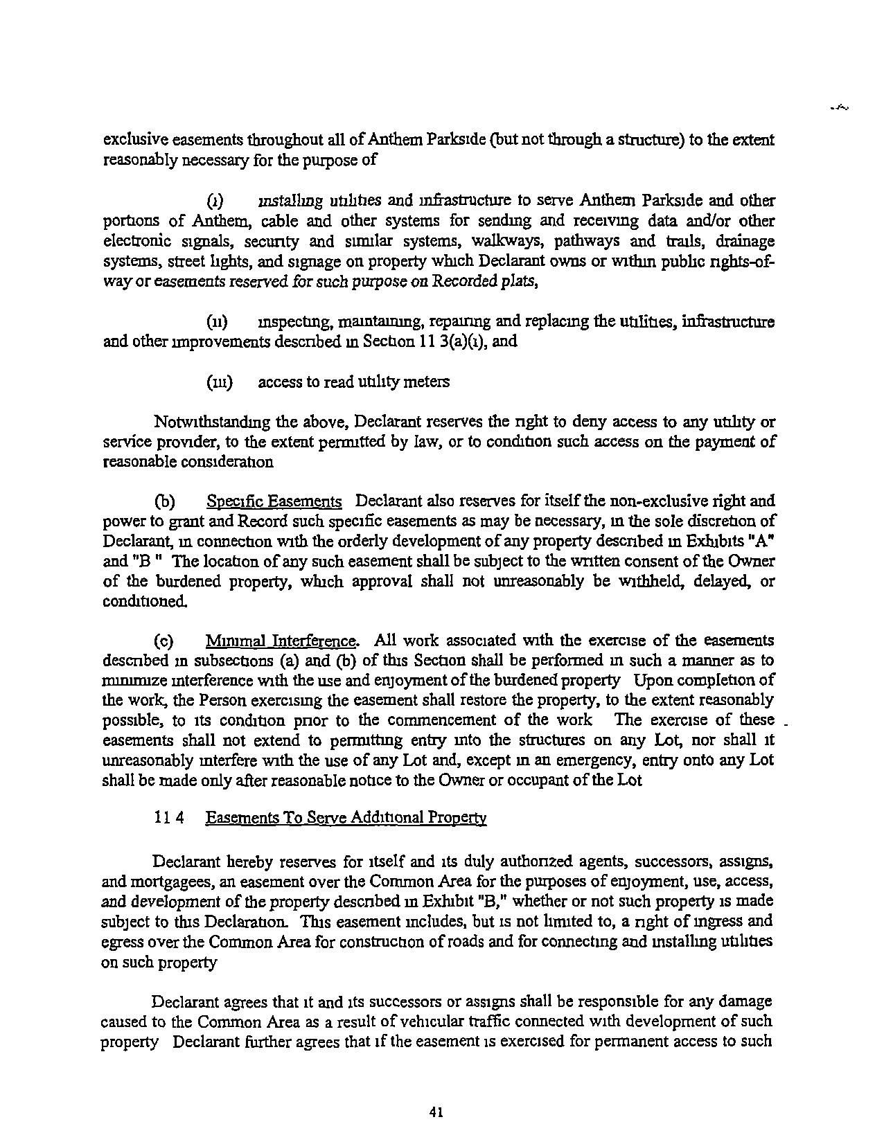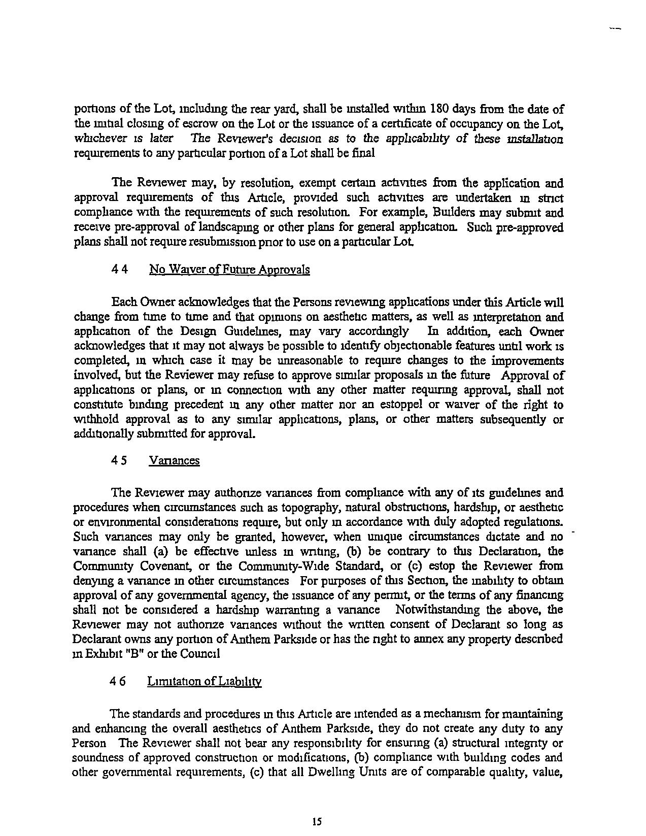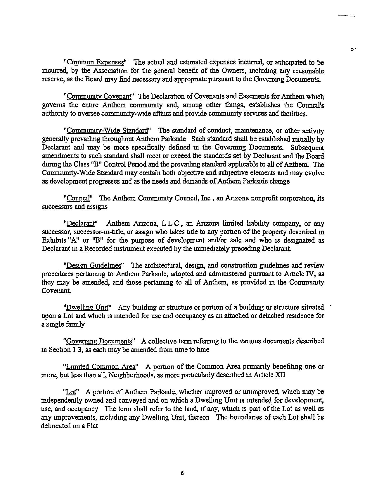 "Comrntunty-Wlde Standard" The standard of conduct. maintenance, or other activity generallyprevailingthroughoutAnthemParksideSuchstandardshallbeestablished nullally by DeclarantandmaybemorespecificallydefinedmtheGovermngDocuments.Subsequent amendmentstosuchstandardshallmeetorexceedthestandardssetbyDeclarantandtheBoard dunng theClass"B"Control Penod andtheprevarlmgstandardapphcabletoall of Anthem.The Cornmuruty-Wide Standardmaycontainbothcbjectrveandsubjectiveelementsandmayevolve asdevelopmentprogressesandastheneedsand demands of AnthemParksrdechange