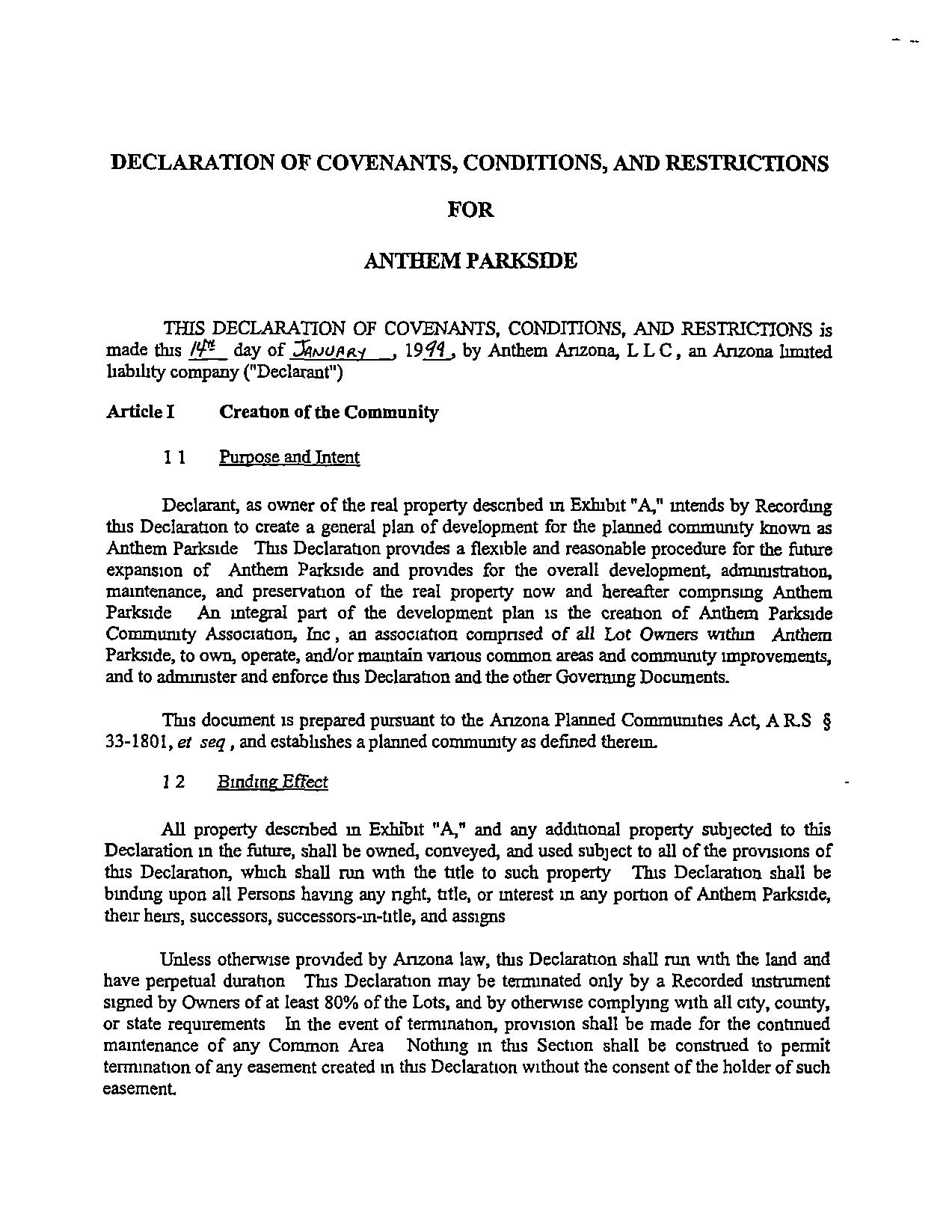 Declarant, as owner of the real property descnbed In Exhibit "A,"Intends by Recordmg tills Declaration to create a general plan of development for the planned commwuty known as Anthem Parksrde TIns Declaration provides a flexible and reasonable procedure for thefuture expansion of Anthem Parksrde and provides for the overall development, adrmmstranon, maintenance, and preservation of thereal property now and hereafter compnsmg Anthem Parkside AnIntegralpart of the development plan IS the creation of Anthem Parkside Commwnty Assocranon, Inc,an assccianon comprised of all Lot Owners WIthin Anthem Parkside, to own, operate, and/or maintain various common areas and commumty improvements, and to adnumster and enforce tlns Declaration and the other Governing Documents.