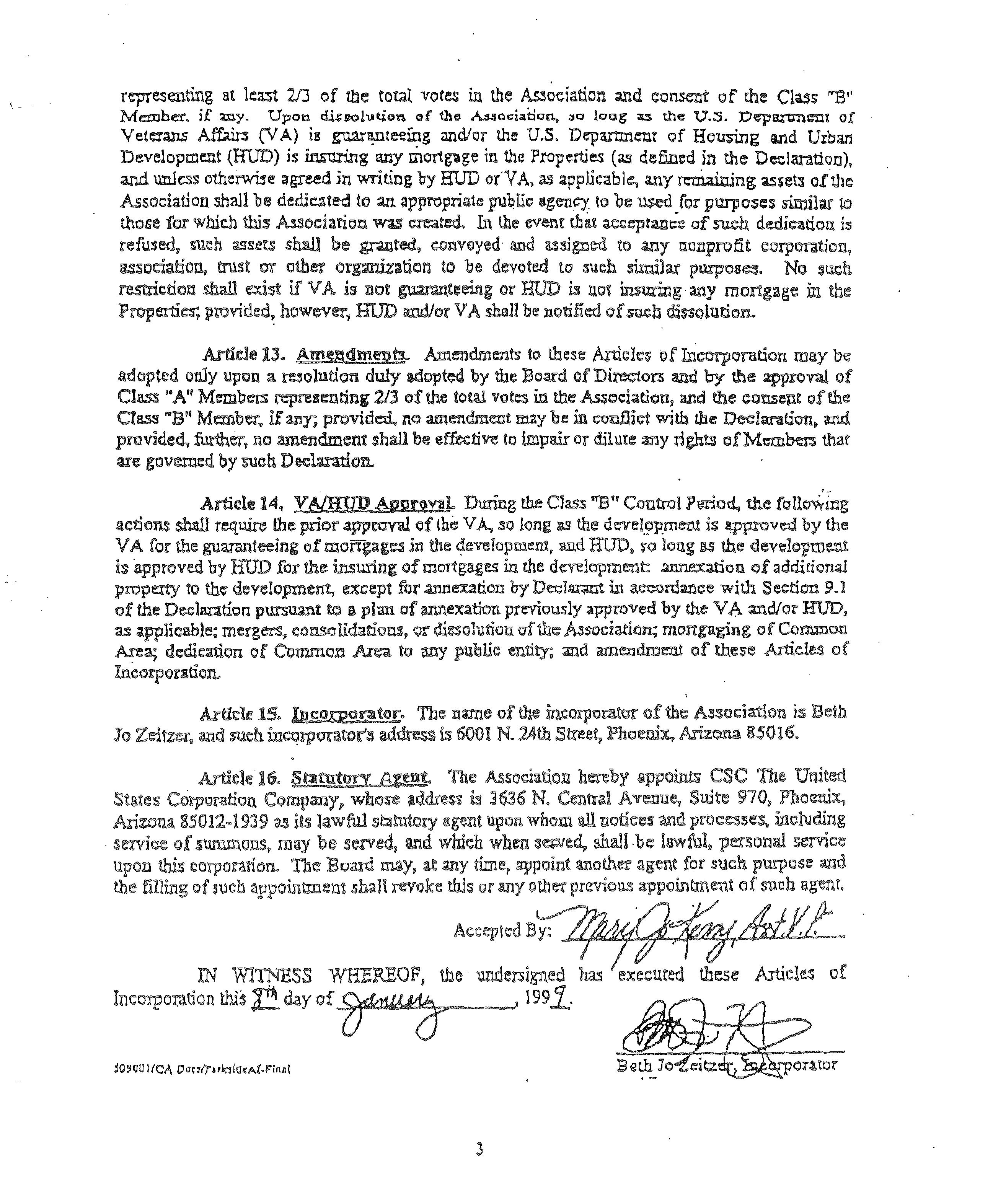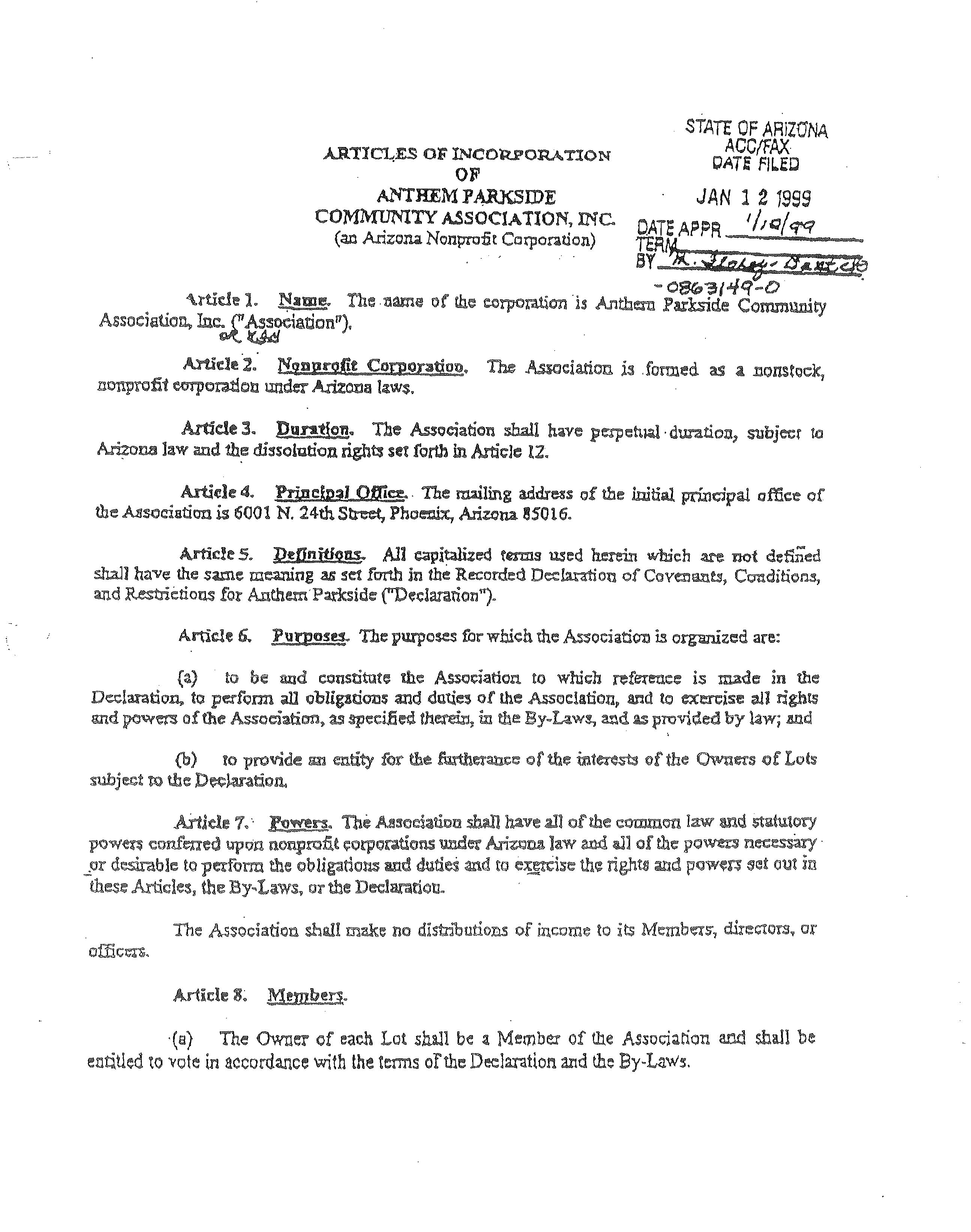 "Articles of Incorporation" or "Articles" The Articles of Incorporation of Anthem Parkstde Commumty ASSOCiatIon, Inc.as filed With theAnzona Corporation CommISSIOn., as may be amended