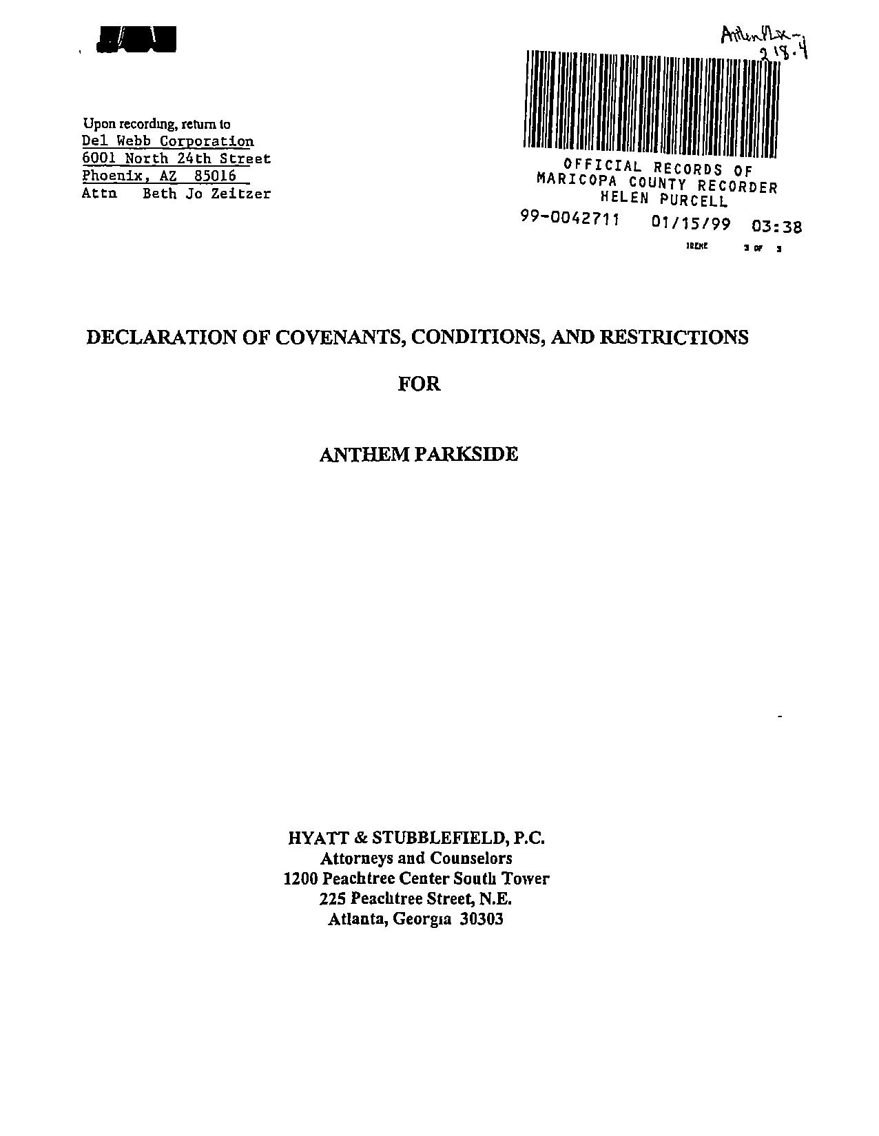 DECLARATION OF COVENANTS, CONDITIONS, AND RESTRICTIONS FOR ANTHEM PARKSIDE