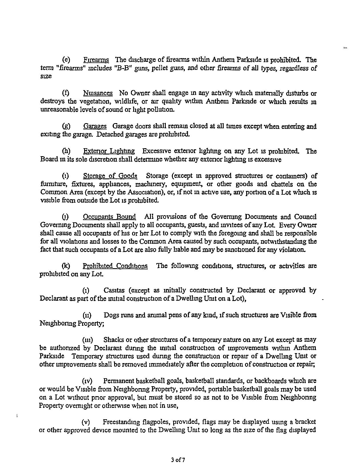(I) NUlsances NoOwoersballengage in anyactivitywlncb materially disturbs or destroysthevegetation, wildlife, or orr quality wtthm AnthemParksrdeorwhichresults ill unreasonablelevels of soundorhght pollution,
