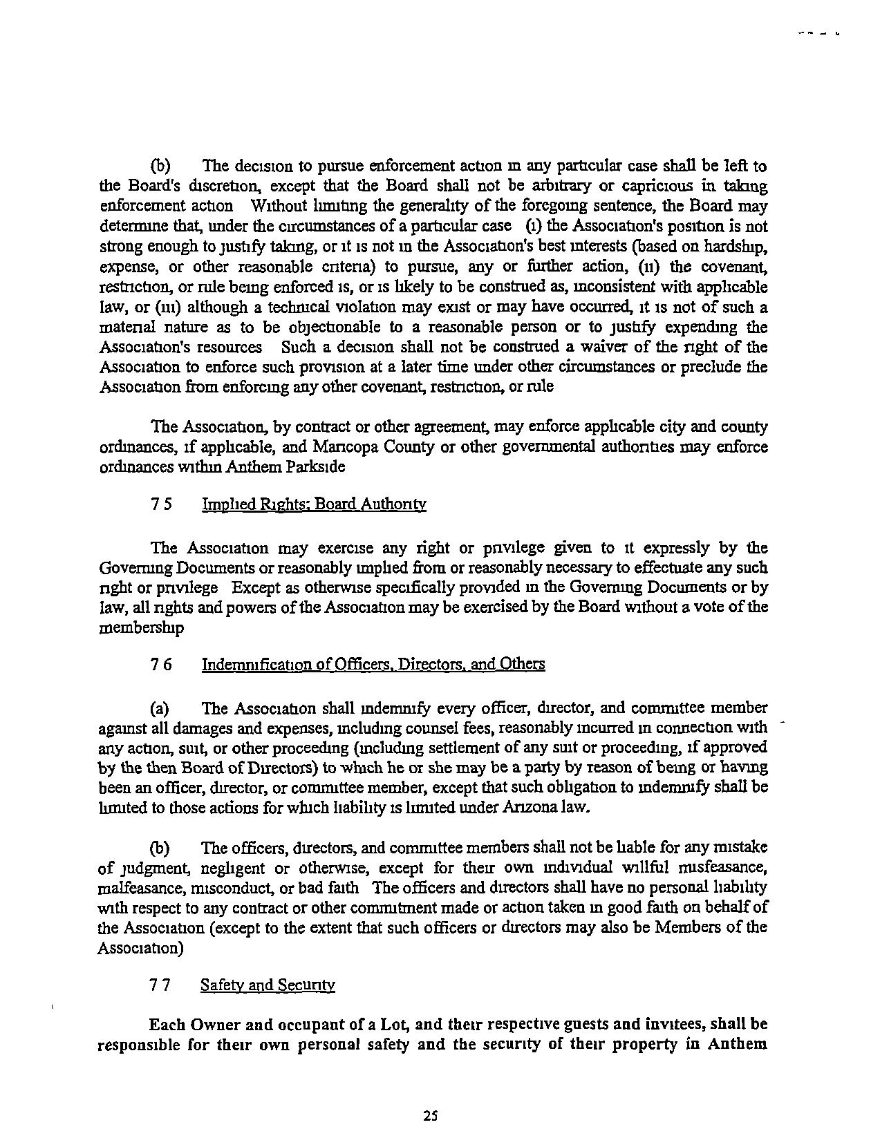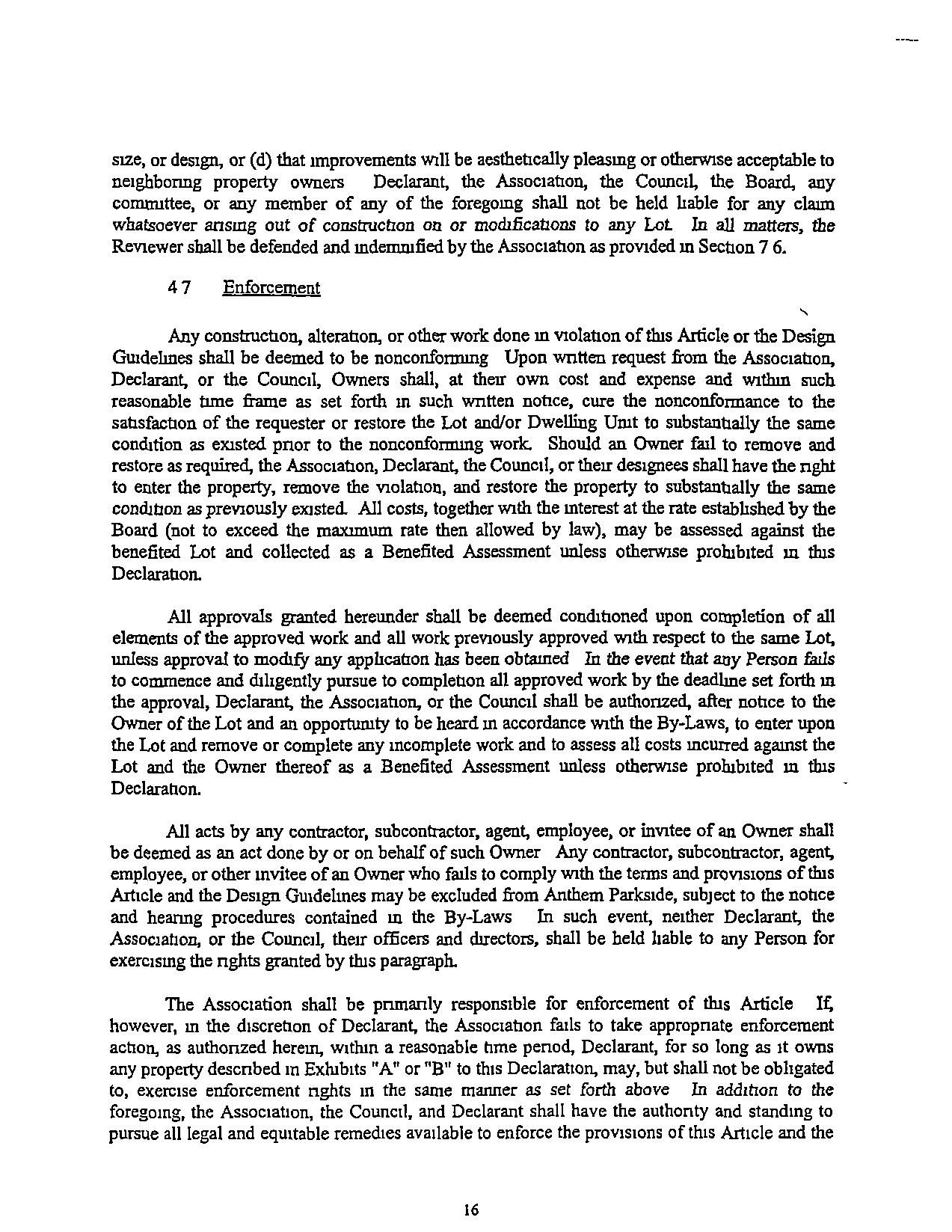 Notlnngm tins Sectionshallpreclndeany Supplemental DeclarationorotherRecorded covenants applicable toanyportionofAnthemParkstdefrom contauung addmonal restrictions or provisionswhich are more restncnve than the provisions of this Declaration and, in such case, the more restncnve shall control The Association may, but shall notbe required to, enforce any such covenants, restrictions, or other mstnunents applicable to a Neighborhood or other properlIes