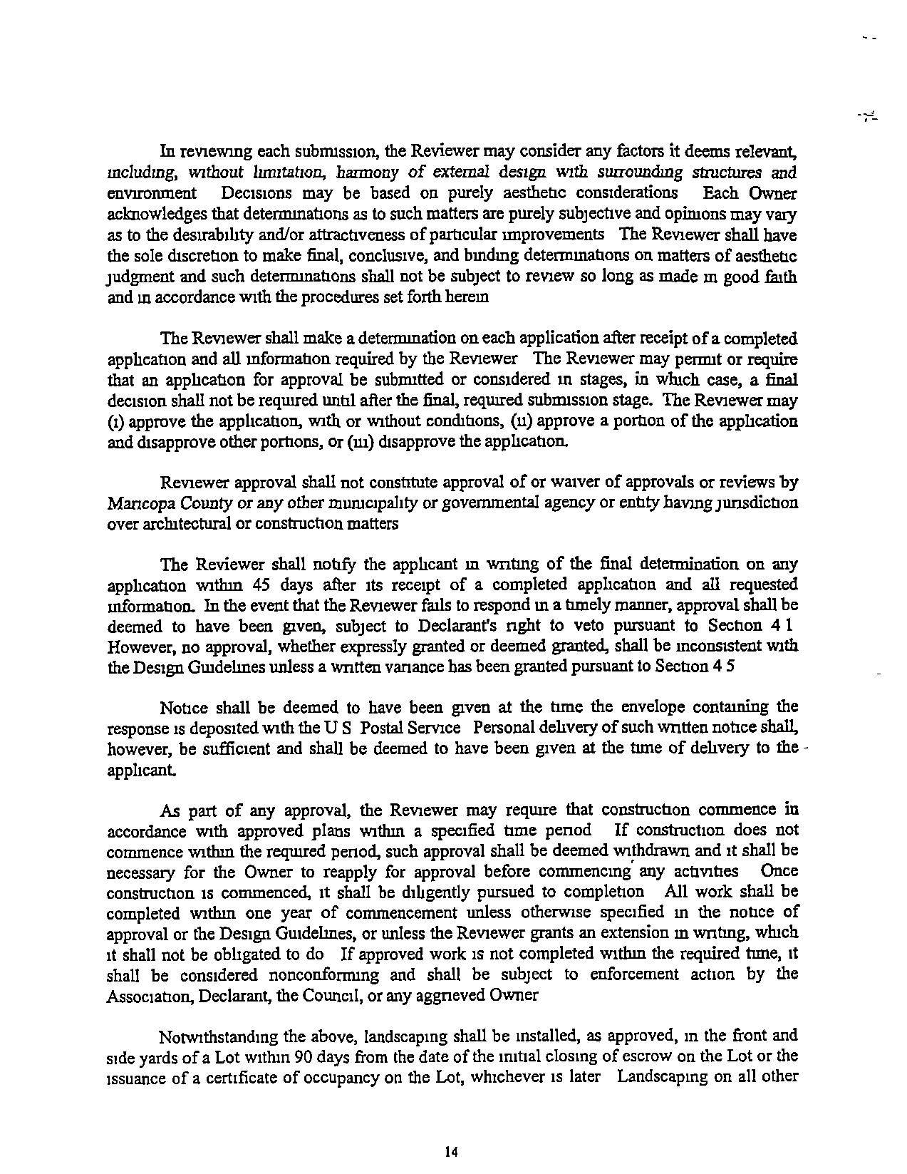 (t) Landscaping Pursuantto Section 43 of theDeclaration, mitial Iandscaping shall be installed, as approved, mthefrontand SIde yardsofaLot wrthm 90daysfromthedate of the irutral closingof escrow ontheLotor the Issuance ofa certificate of occupancy onthe Lot, whichever IS laterImnal landscapmg onallotherportions of theLot, mcIudmg therearyard, shallbe installed within 180daysfromthedate of themrnalclosing of escrowontheLotorthe Issuance of a certificate of occupancy on the Lot, whichever IS later.