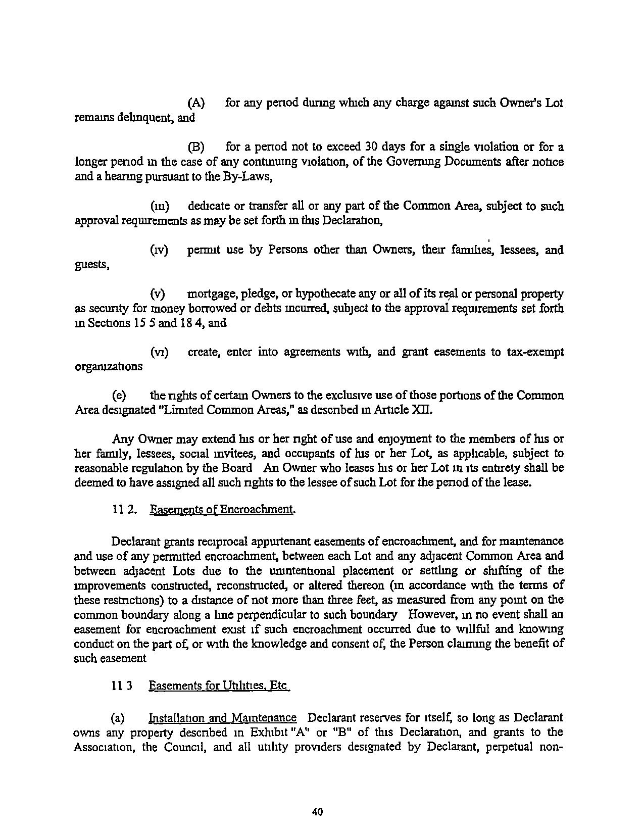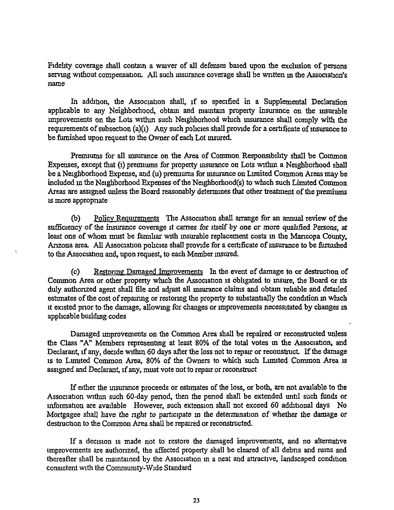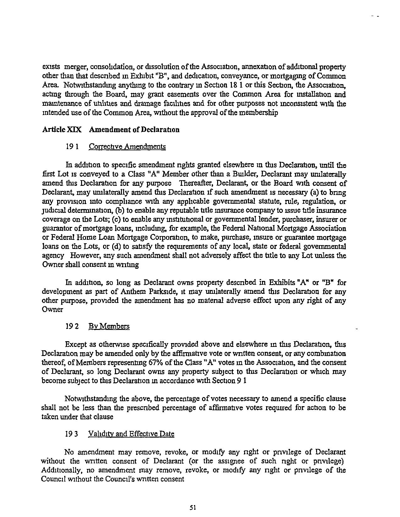 exists merger, consohdation, or dissolution of the Association, annexation of additional property other than that descnbed m Exhibit "B'', and dedrcatron, conveyance, or mortgagmg of Common Area.Notwrthstandmg anythmg tothecontrary in Section18IorthisSection,theAssociation, acting through the Board, may grant easements overthe COIDlIlon Area for mstallanon and mamtemmce of cnbnes and dramage facihnes and for other purposes not inconsistent With the intendeduse of the Cornman Area,withouttheapproval of themembership