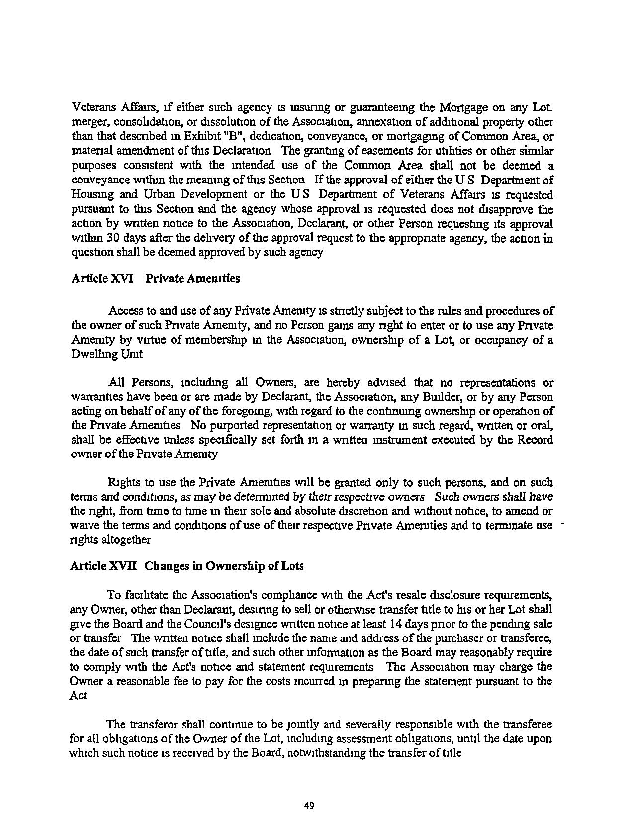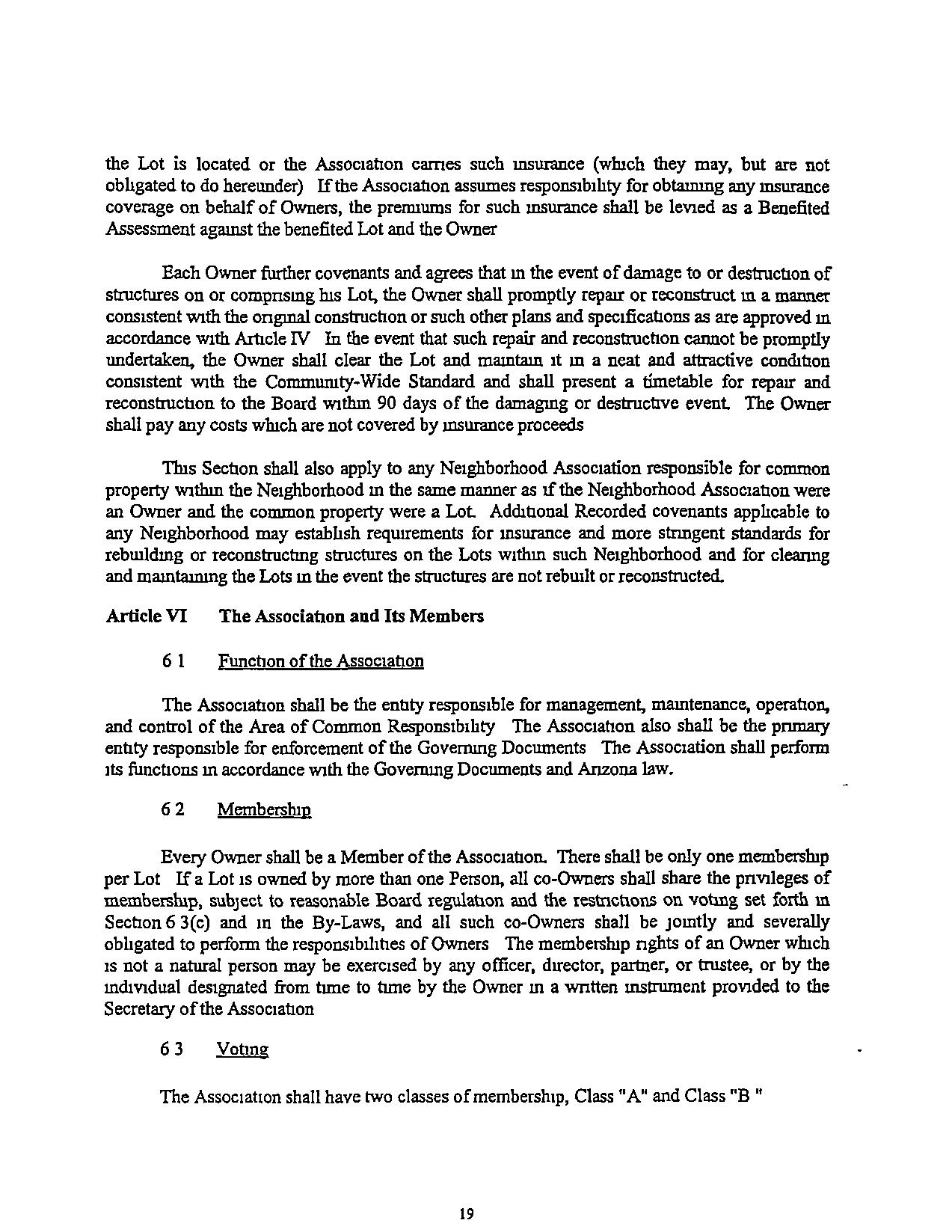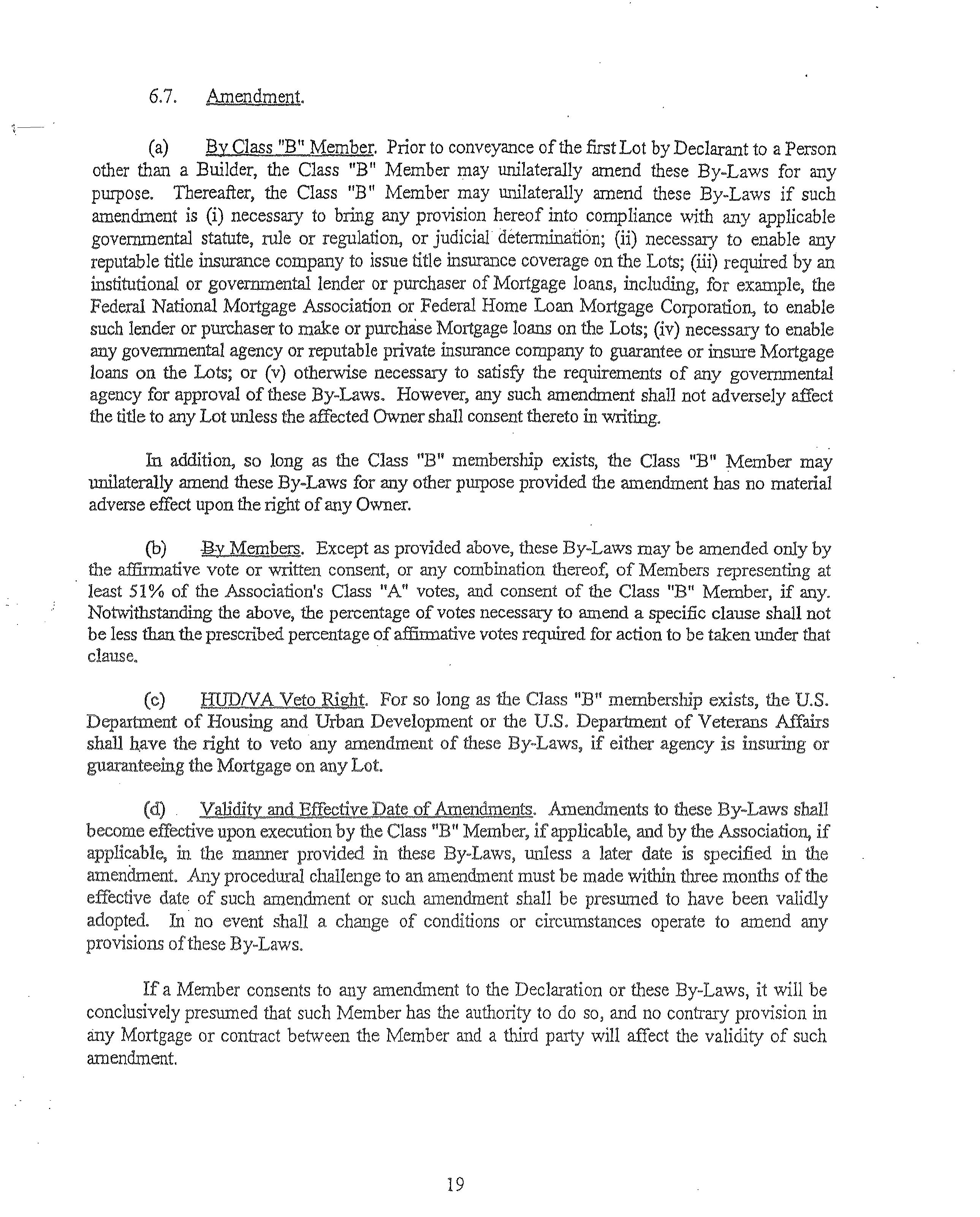 If either theUSDepartment ofHousmg and Urban DevelopmentortheUS Department of Veterans Affairs IS msunng or guaranteeing the Mortgage on any Lot, then the following actions shall requtre the pnor approval of Members representing notless than two-thirds (2/3) of the total Class "A" votes In the Assocrenon and the consent of the Class "B'' Member, If such