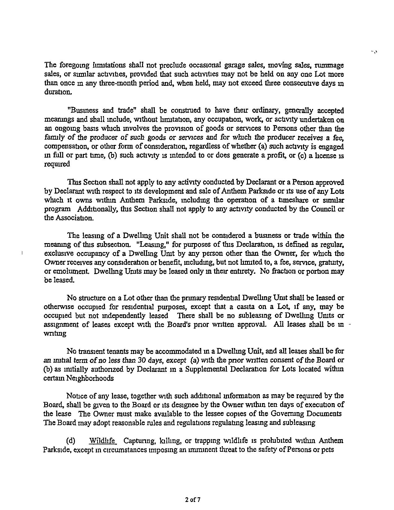 ThisSectionsballnotapplytoanyactivityconductedbyDeclarantoraPersonapproved byDeclarant with respecttoItsdevelopmentandsale of AnthemParksideorItsuse of anyLots wluchItownswithinAnthemParkside,mcludmgtheoperallon of atimeshareor sUIU1ar programAdditionally,tlusSectionshallnotapplytoanyactivityconductedbytheCouncilor the Association,