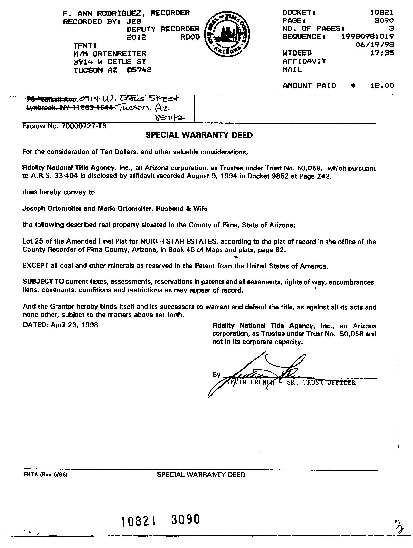 OWNER: ORTENREITER JOSEPH & MARIE JT/RS 10821 3090 06/19/1998