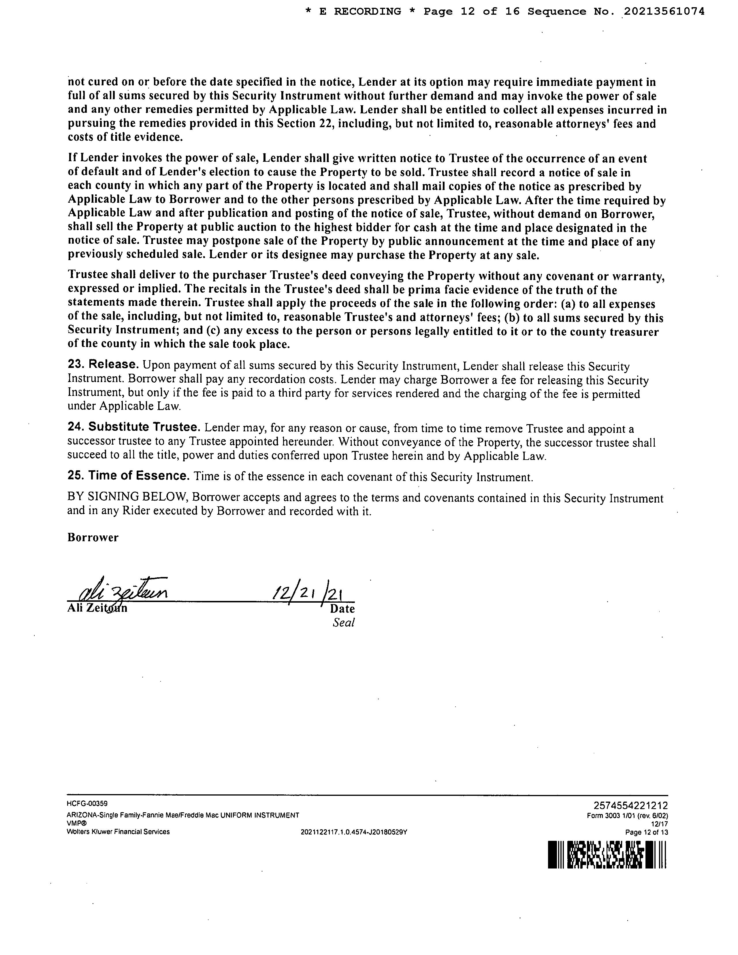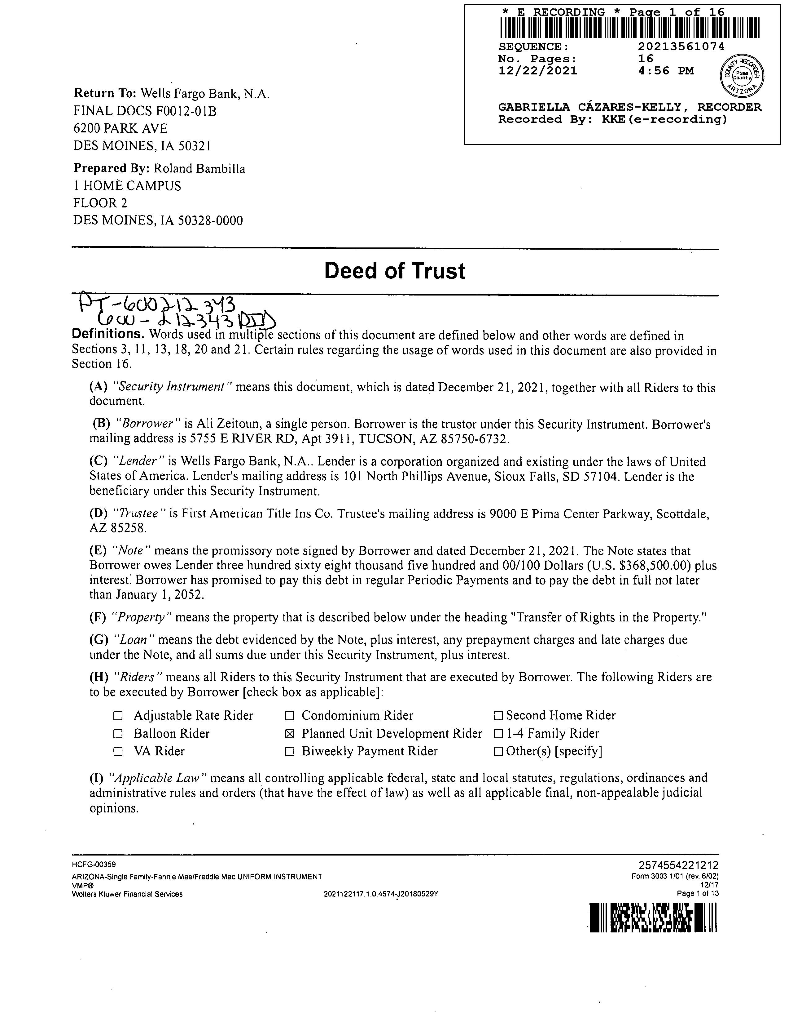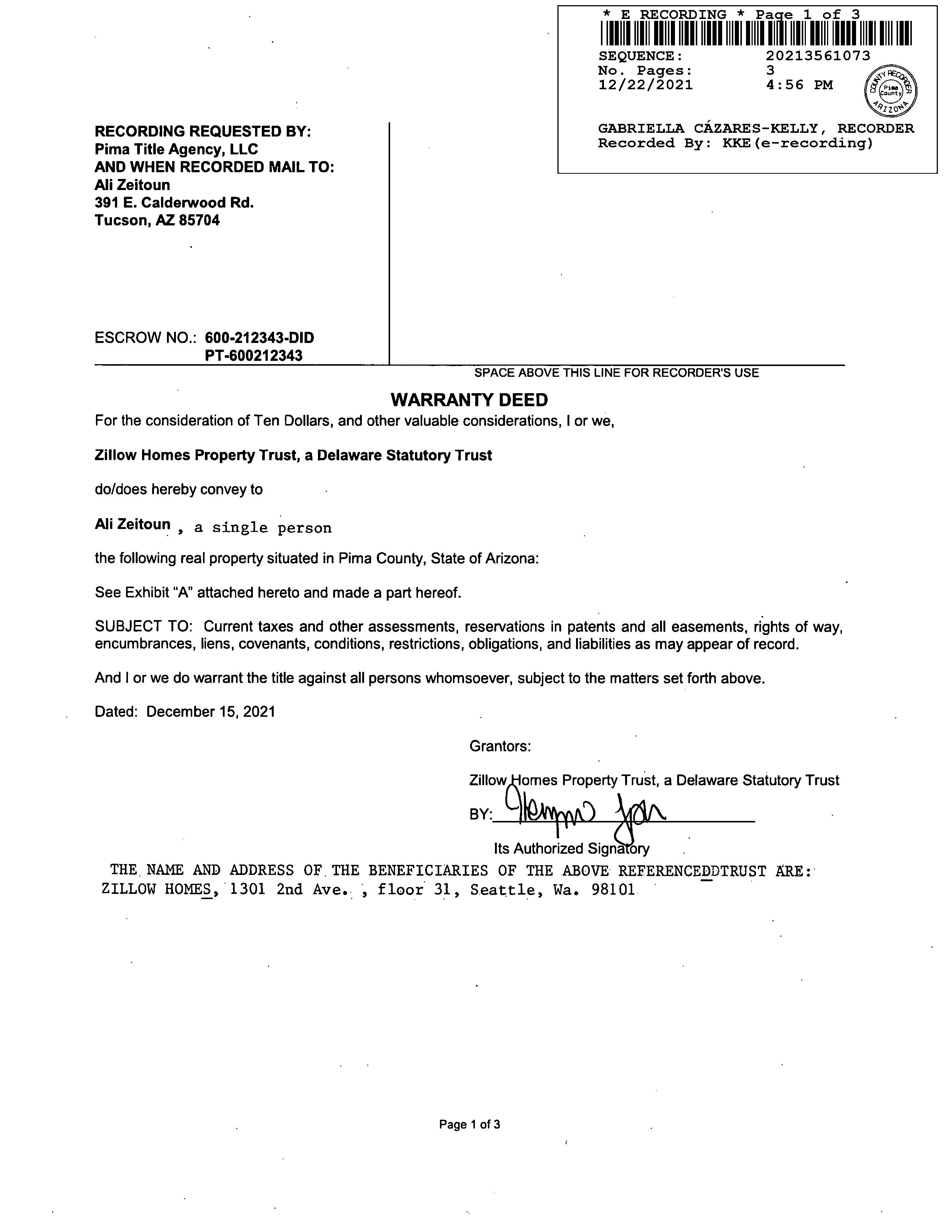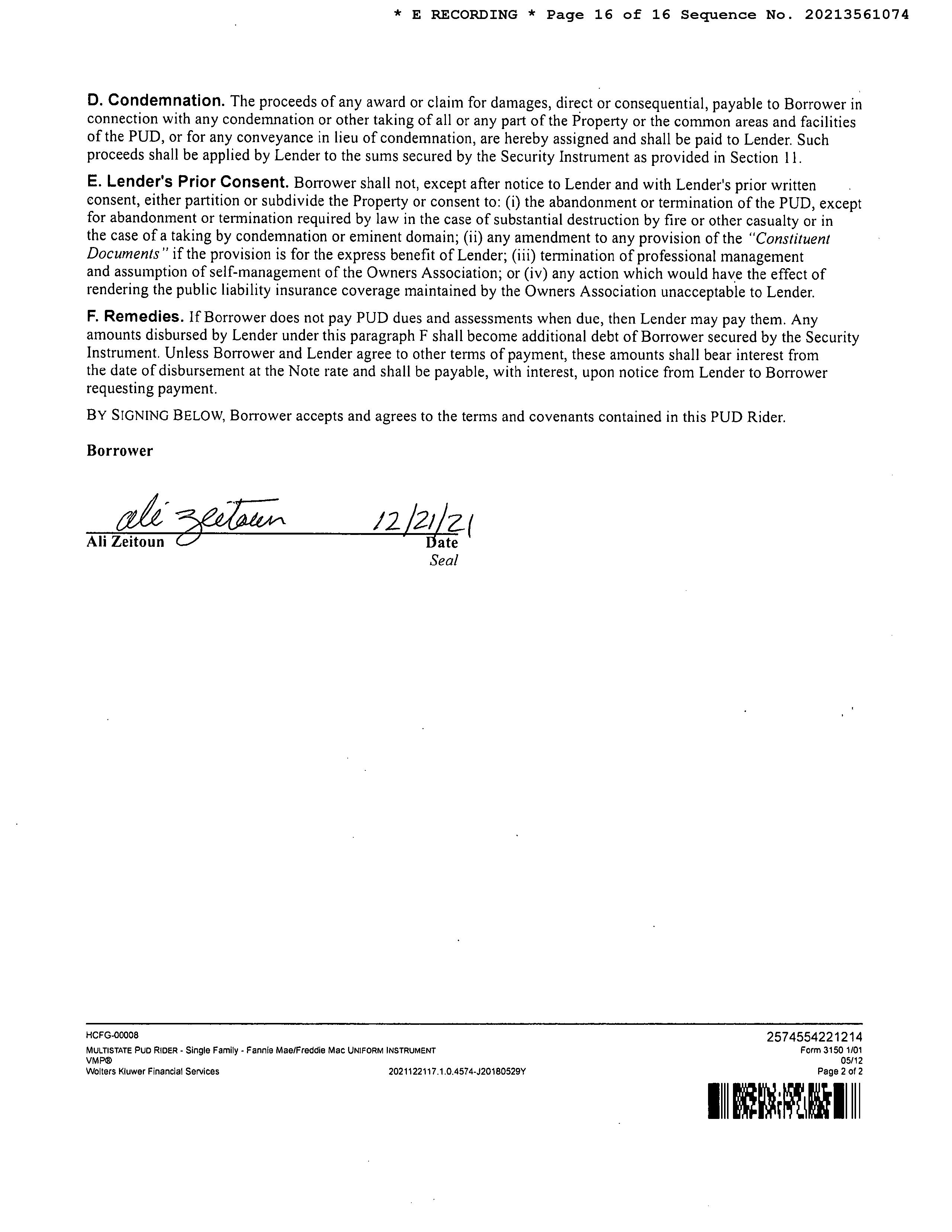 OWNER: ZEITOUN ALI AFFIDAVIT 2021 3561073 12/22/2021