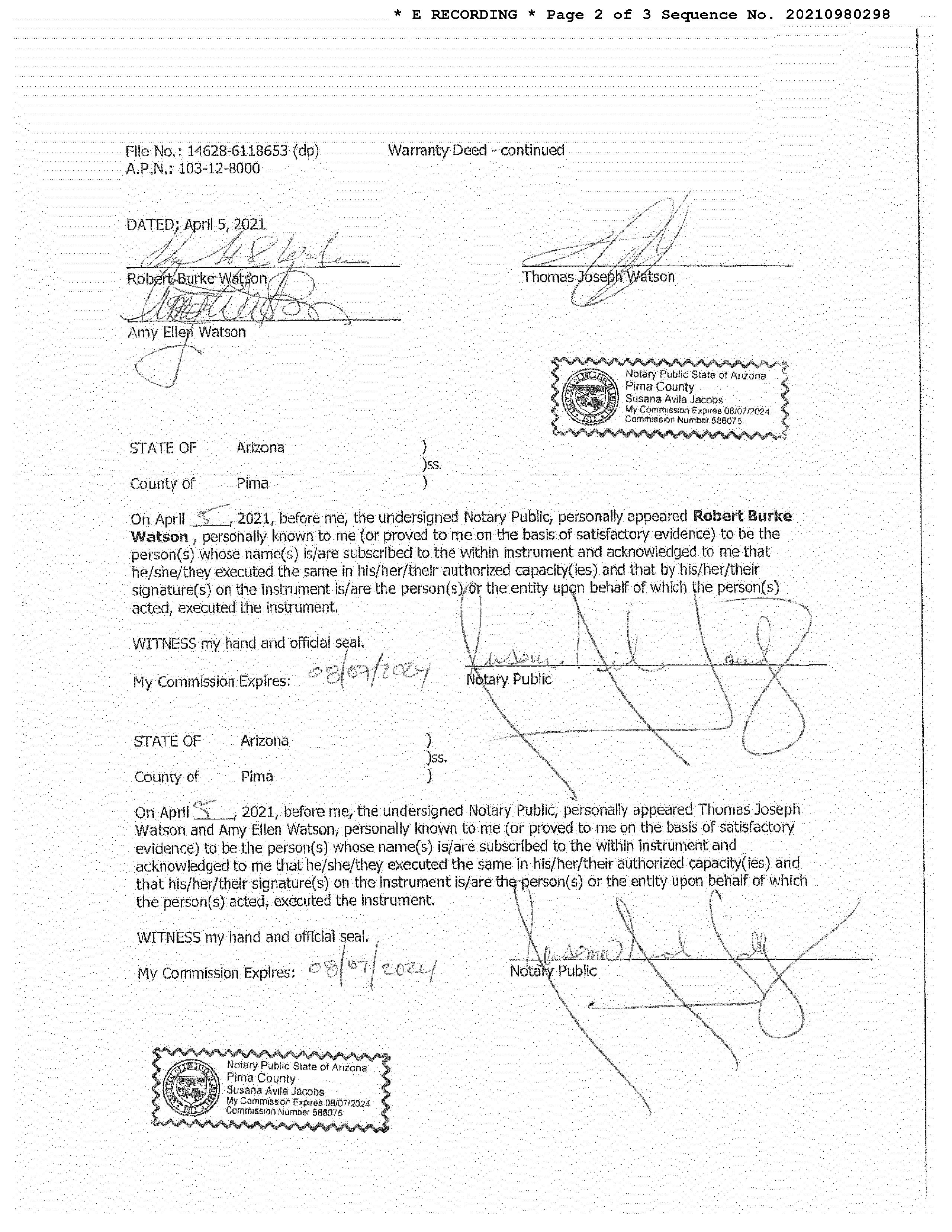 APN / Alternate APN: 103-12-8000 / Deed Type: Warranty Deed Land Use: Sfr Subdivision / Tract: Agua Dulce Rho / Lot Size: 5,445 Year Built / Eff: 2002 / Rec. Date / Price: 04/08/2021 / $361,000 Living Area: 3,090 # of units: Document #: 980298 Bedrooms: Pool: Total Tax Value: $327,642 Bath(F/H): / #1 3994 W Rocky Spring Dr Tucson Az 85745 Owner Name:
