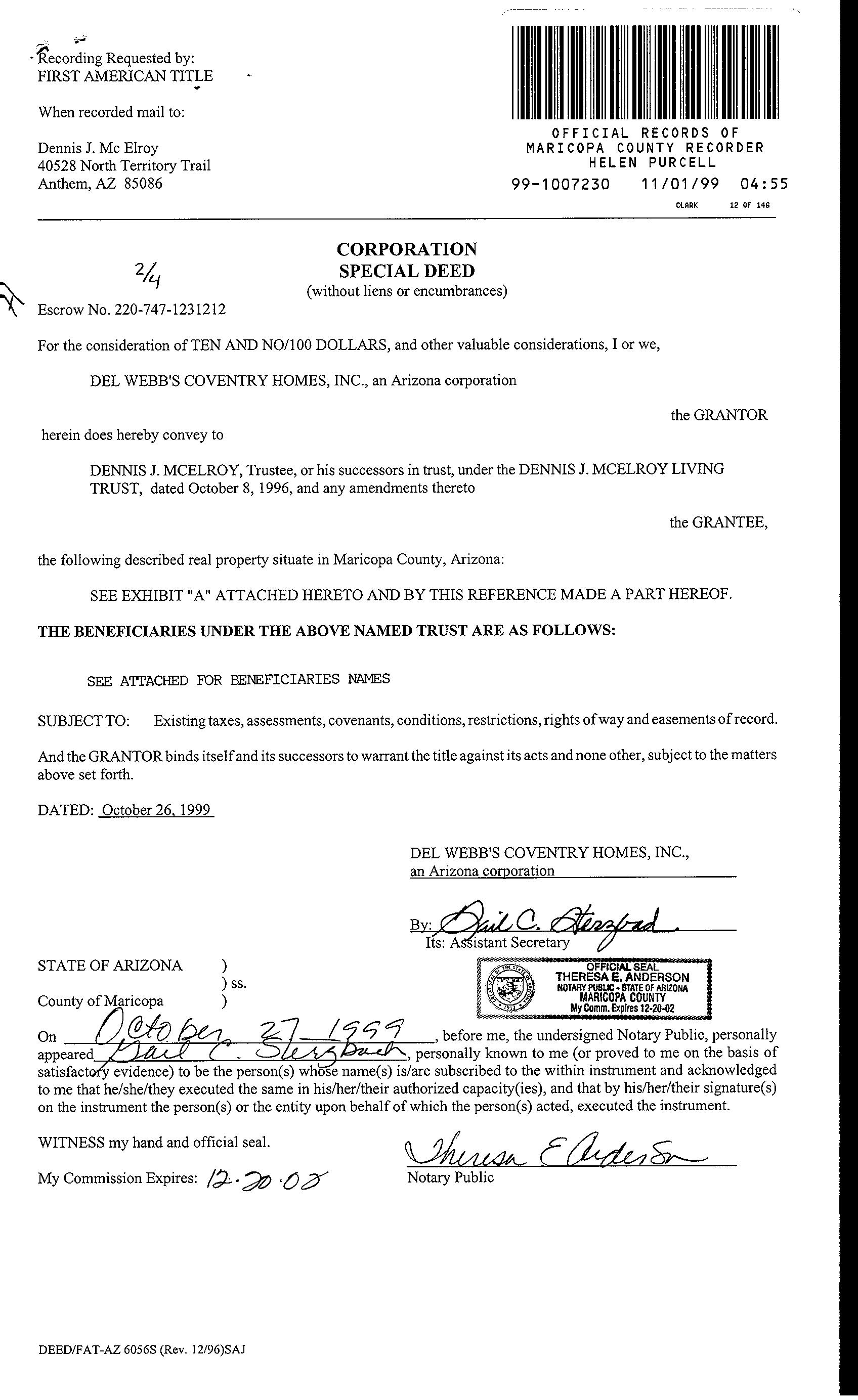 Recording/Sale Date : 11/01/1999 / 10/26/1999
