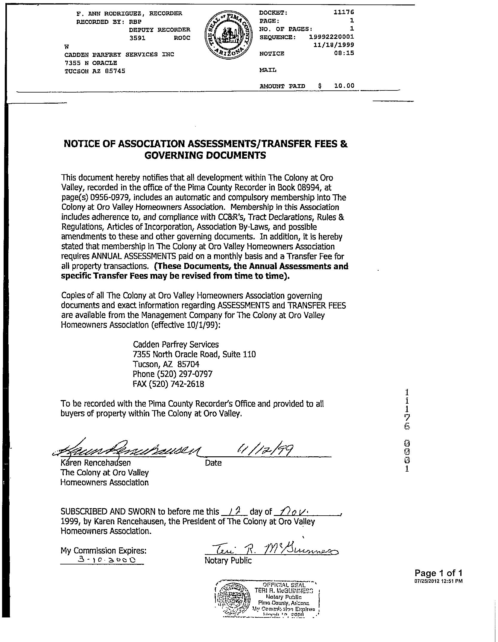 Owner Name : Schiavelli Dorothy Subdivision : Colony Oro Valley