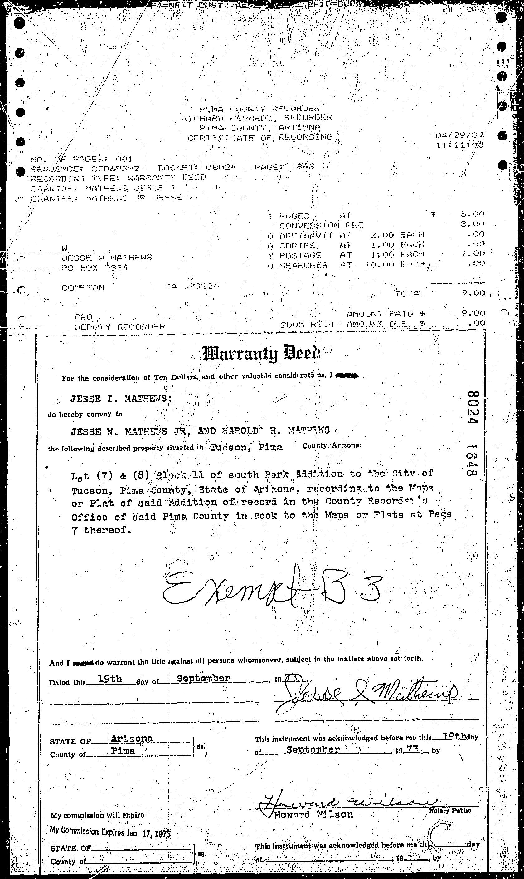 OWNER: MATHEWS JESSE W JR & MATHEWS HAROLD R     8024 1848 04/29/1987